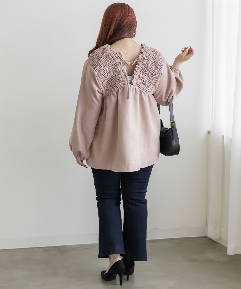 3Lサイズを着用してちょうどよい着心地で、ノンストレスに着用出来ました。シャーリングデザインがほどよくフィットして、自然に体のラインをきれいに見せてくれます♪ 生地は軽い秋冬らしい雰囲気で、柔らかい印象になれます!フレアシルエットで気になるお腹や腰まわりをふんわりカバーしてくれました◎ 着丈は長すぎないのでスカートにもパンツにもあわせやすいです♪