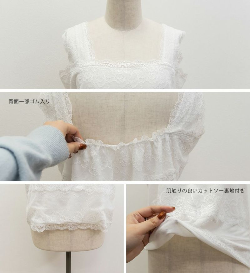 3Lを着てちょうどいいサイズでした。レース素材でとにかく可愛いデザインで、下着のストラップを気にしなくていいから重ね着にピッタリの1枚です!レースに肌触りの良い裏地がついているのでサッとストレスフリーに着ることができます◎レースは伸縮性がないのでストレッチ性はありませんが、後バストがゴムになっているので窮屈感がなく着脱も全く問題ありませんでした!スクエアネックになっているので胸元が見える心配とかもなく安心感のあるデザインです。春夏はさらりとした羽織と合わせたり、秋冬はニットカーデと合わせたりと、オールシーズン着まわしできそうです♪