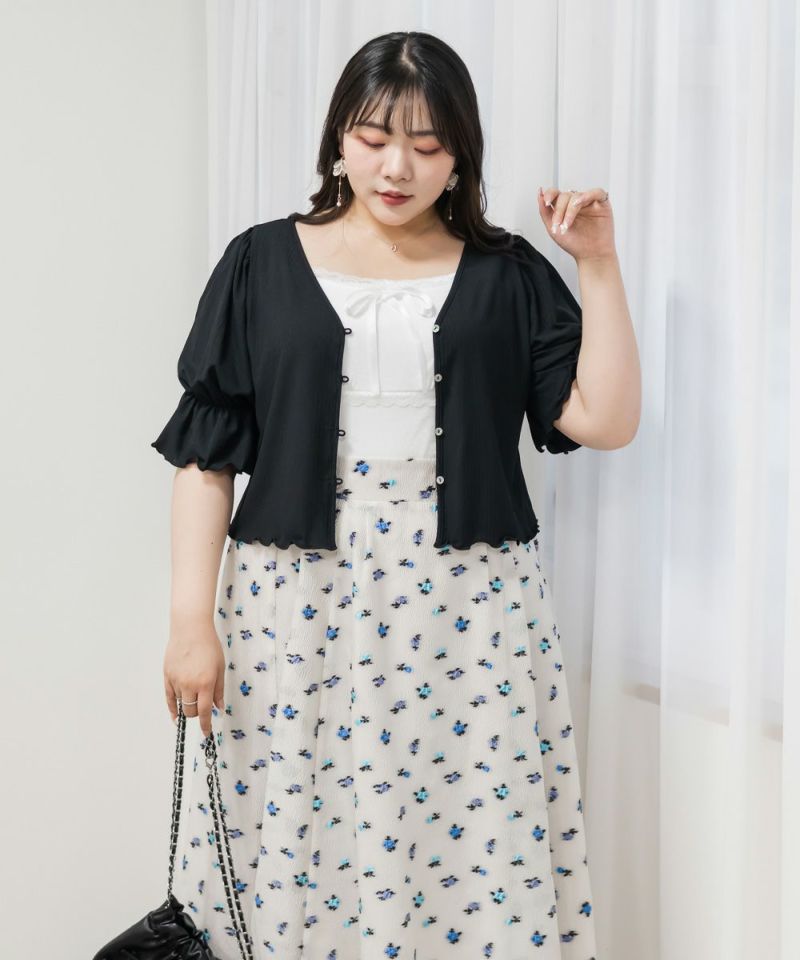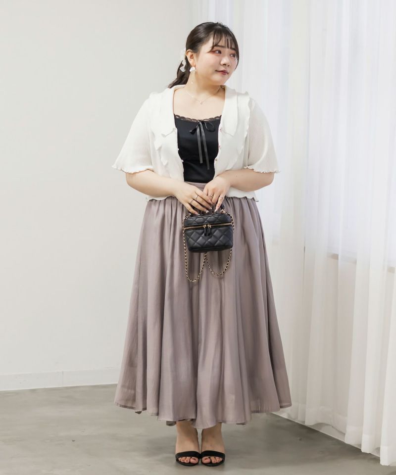 3Lサイズを着用しましたが、フィット感もちょうどよく、窮屈さもなく快適な着心地でした◎ 程よい伸縮性があるリブ素材で身体に優しく沿いながらも、ピタッとしすぎず自然なシルエットに。胸元のリボンと繊細なレース使いが、コーデに甘さをプラスしてくれて、1枚あるだけで着こなしの幅が広がるアイテムです♪ Tシャツやシアートップスとのレイヤードにもぴったりで、トレンド感とガーリーな雰囲気を両立できるのが嬉しいポイントです。ジャンスカやカーデのインナーとしても大活躍間違いなしです◎