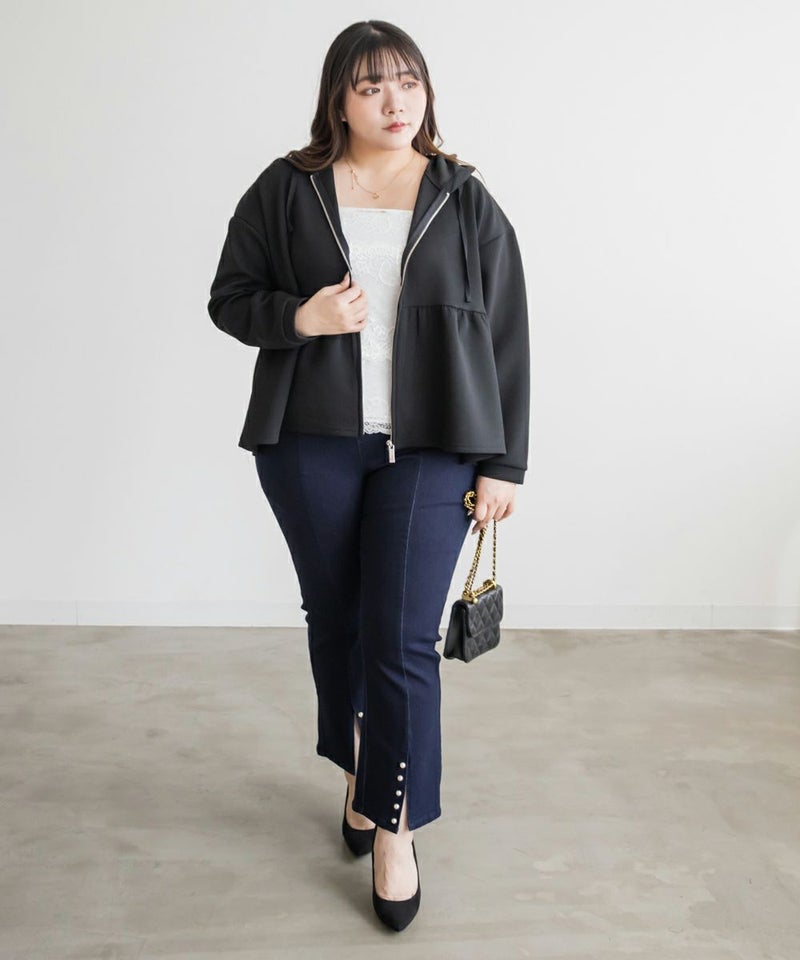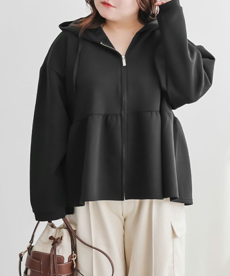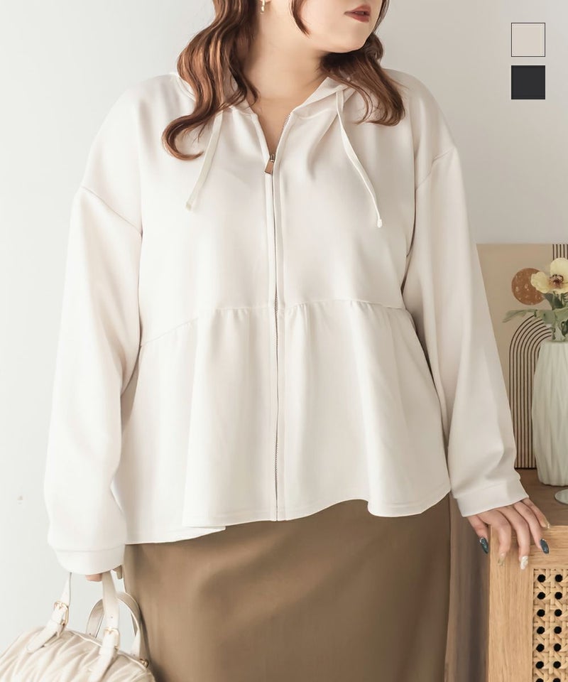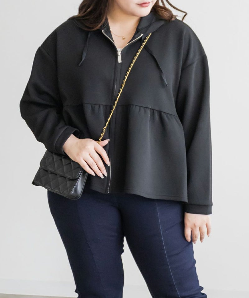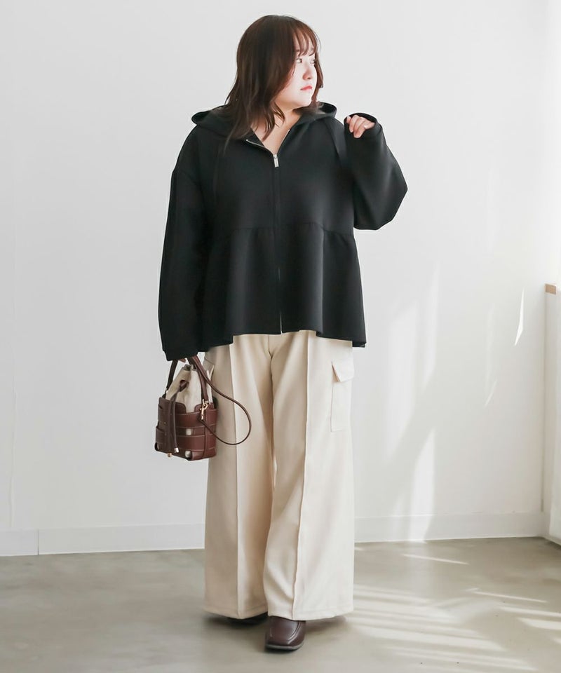 3Lサイズを着用しました!やわらかくて軽やかなダンボール素材で動きやすいです◎きれいめ見えする素材感なのでパーカーでもカジュアルになりすぎず大人っぽく着られました!ジップを閉じてトップス風に、開ければ羽織としても使えるので、着こなしの幅がぐっと広がります! ウエスト部分から広がるペプラムシルエットでお腹周りもカバーしてくれます。パンツにもスカートにも合わせやすいのが嬉しい♪オンオフどちらでも活躍する、大人っぽくこなれ感のある1枚です!
