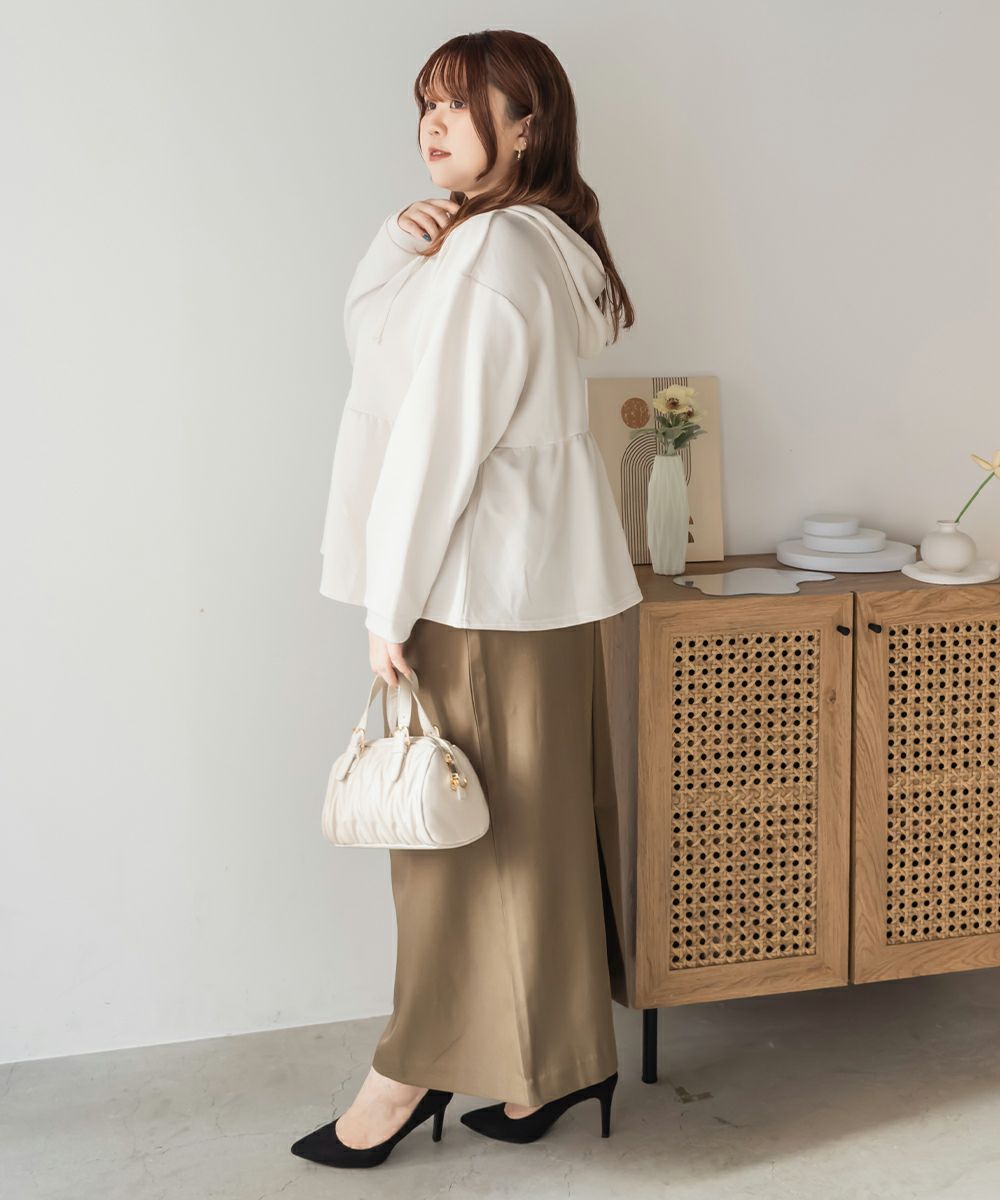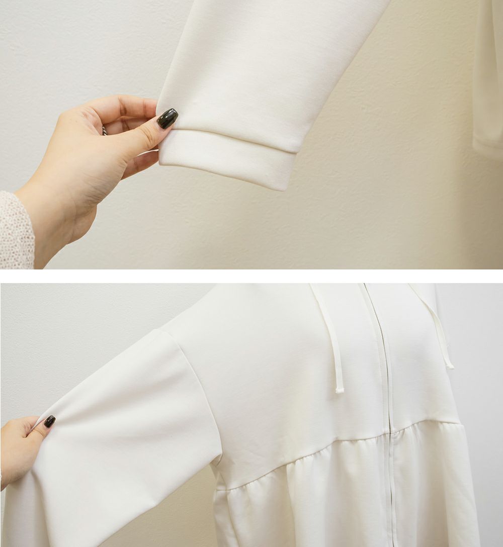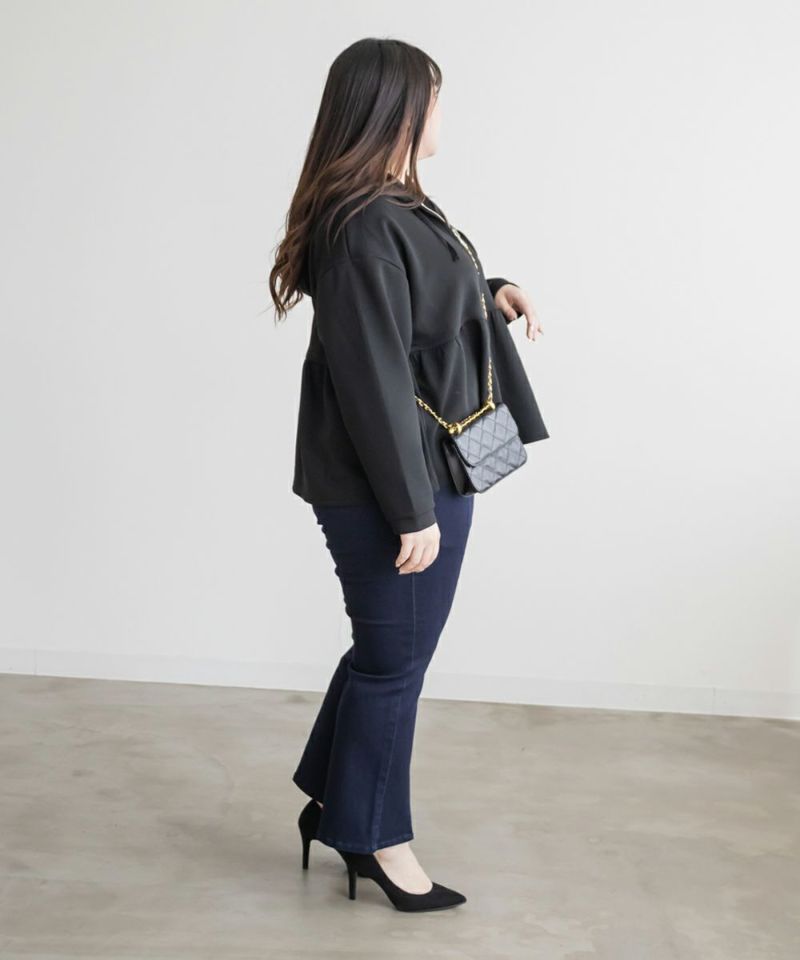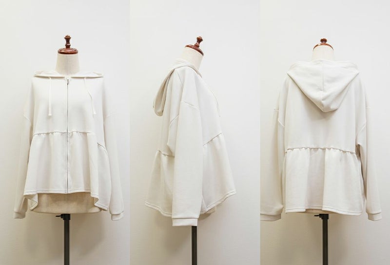 3Lサイズを着用しました!やわらかくて軽やかなダンボール素材で動きやすいです◎きれいめ見えする素材感なのでパーカーでもカジュアルになりすぎず大人っぽく着られました!ジップを閉じてトップス風に、開ければ羽織としても使えるので、着こなしの幅がぐっと広がります! ウエスト部分から広がるペプラムシルエットでお腹周りもカバーしてくれます。パンツにもスカートにも合わせやすいのが嬉しい♪オンオフどちらでも活躍する、大人っぽくこなれ感のある1枚です!