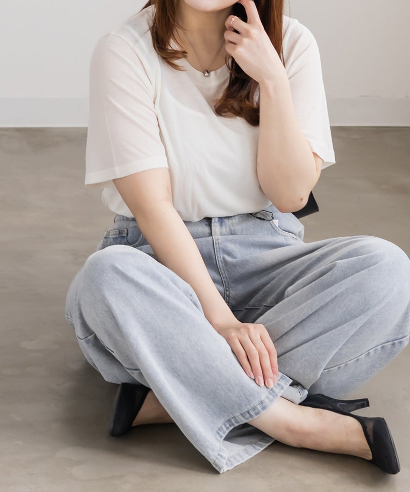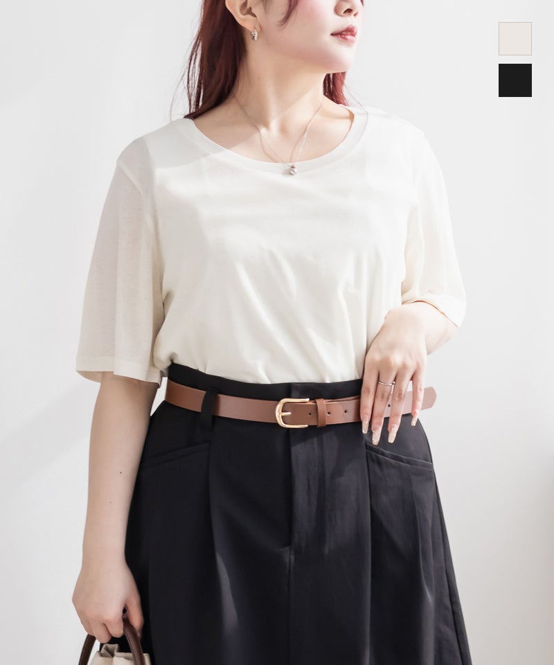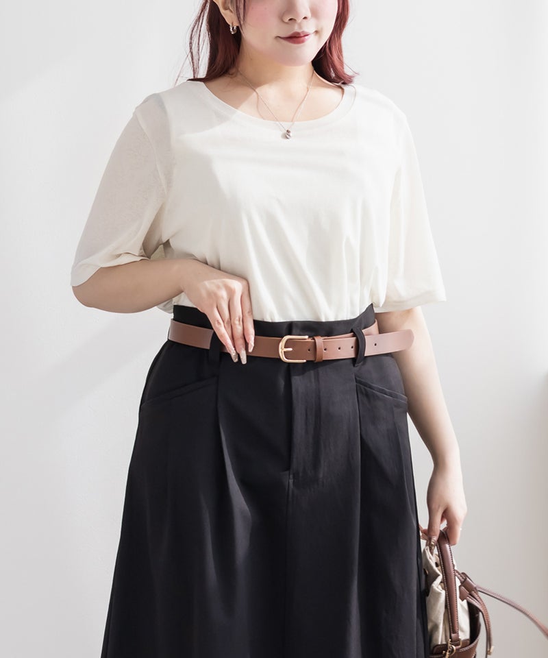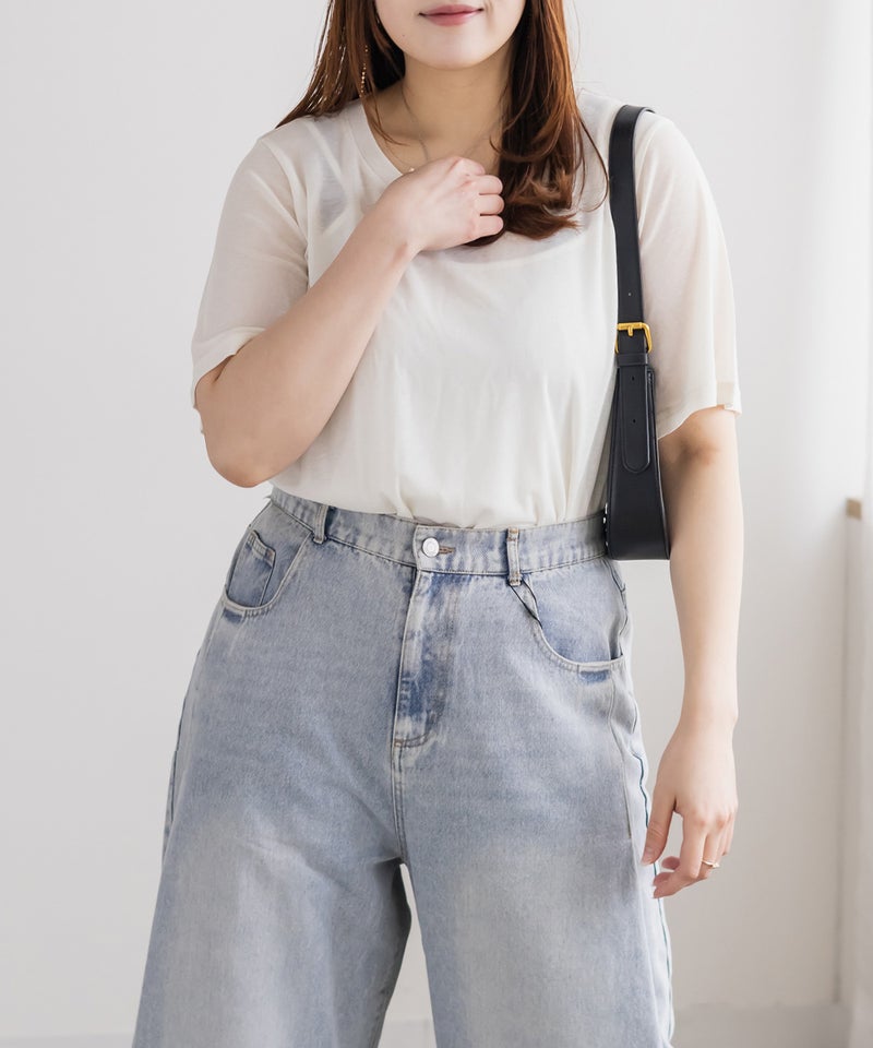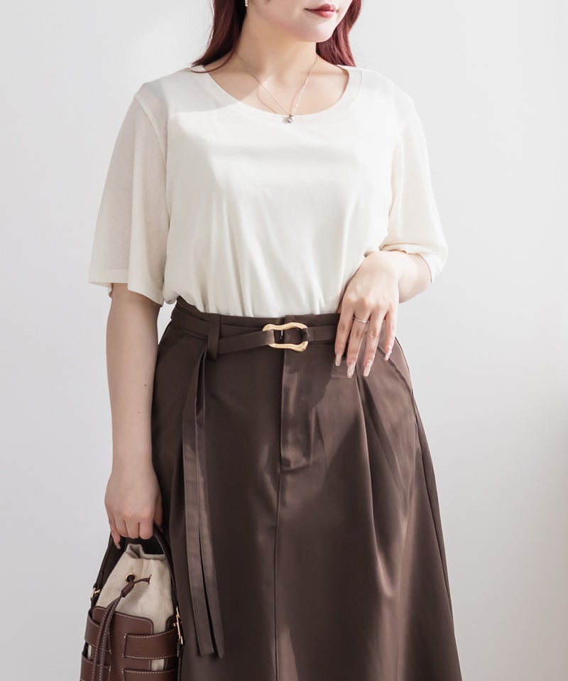 シンプルでありながら、程よい透け感が今っぽいクルーネックTシャツ。身体にフィットし過ぎずに二の腕など気になる部分をカバーしつつ、すっきりとあいたネックラインで顔まわりをシャープに演出する着やせも叶うデザイン。