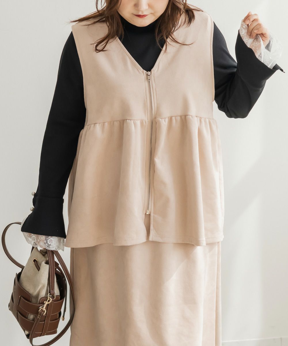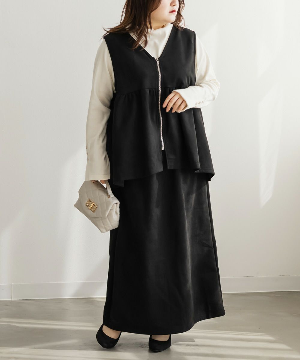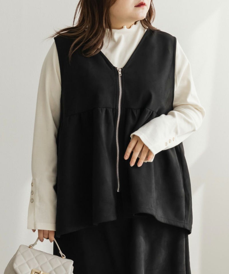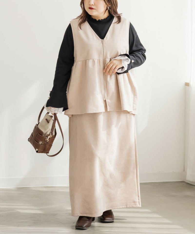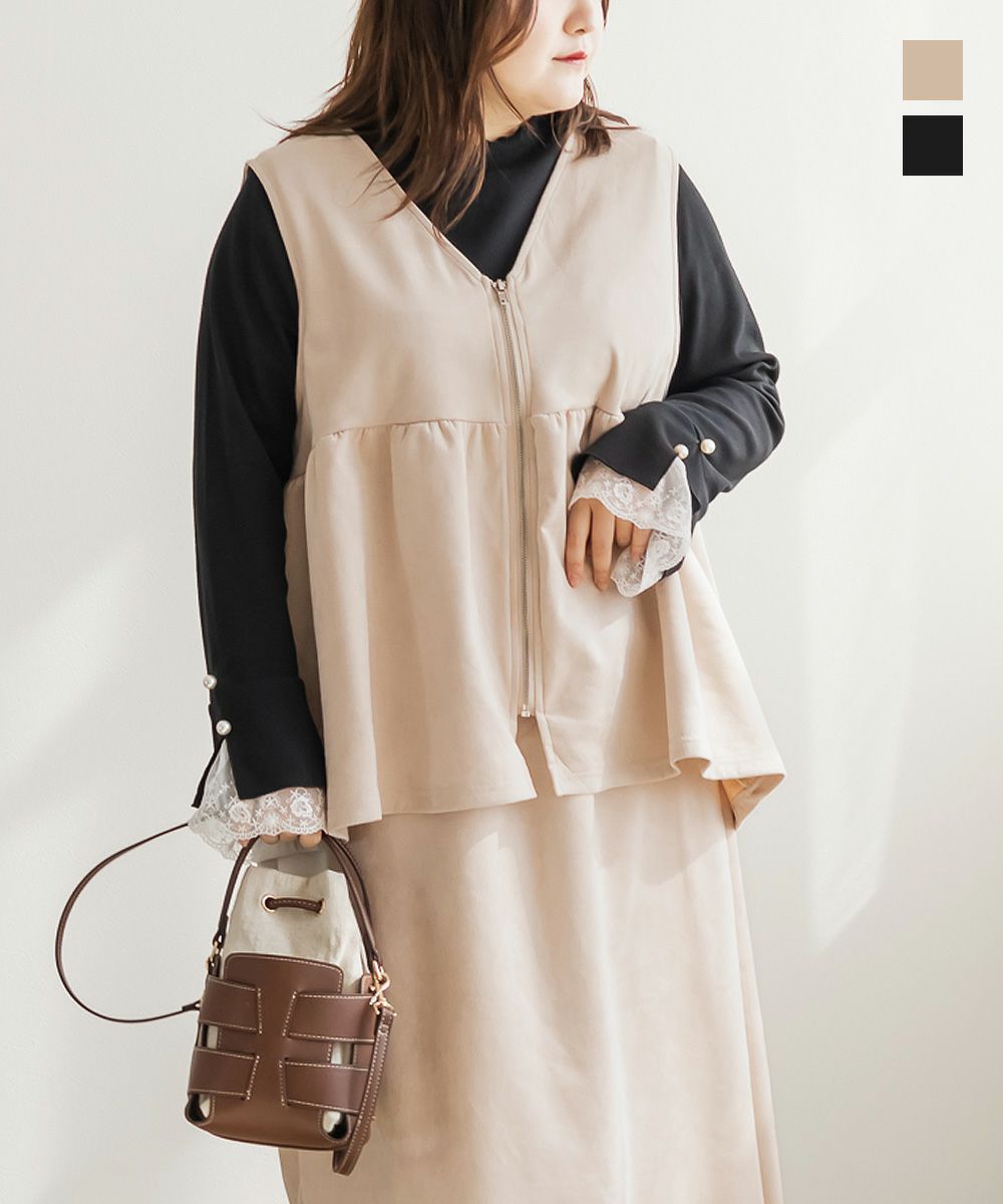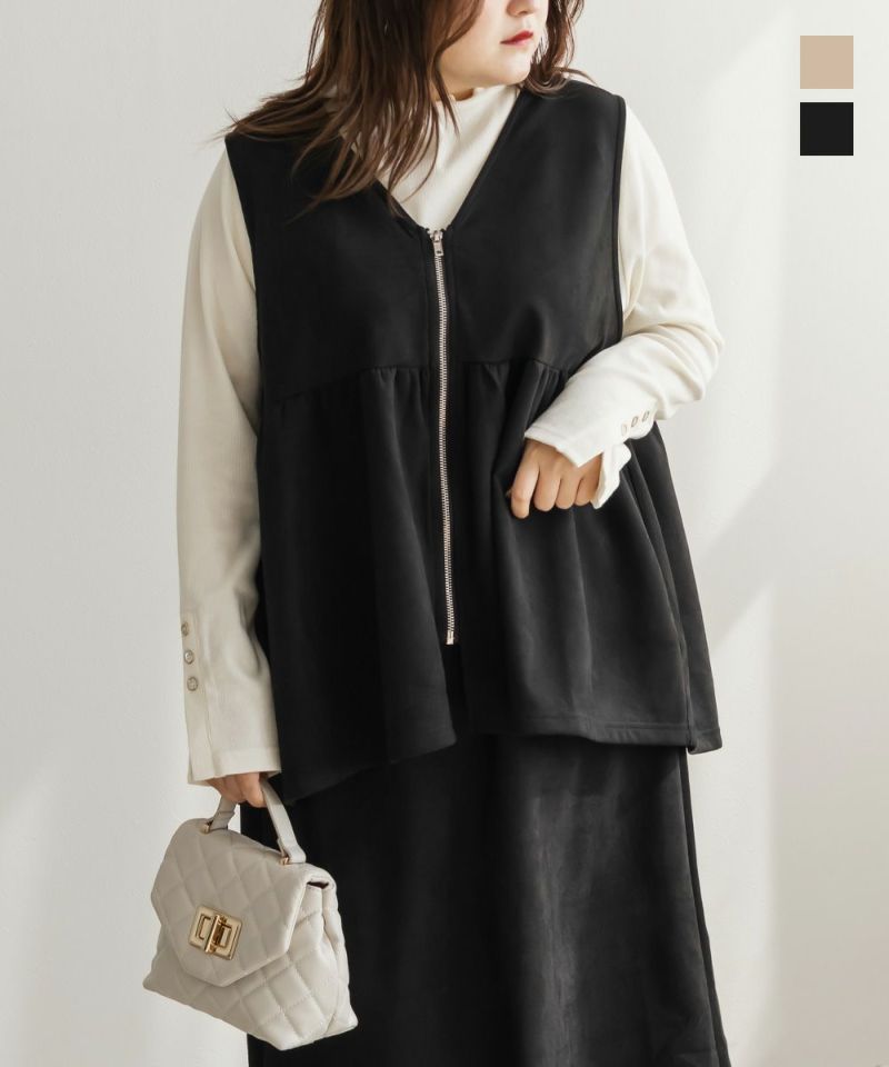 3Lを着てゆとりのあるサイズ感でした。ペプラムデザインでスタイルアップが叶うシルエットなのが嬉しいです♪やわらかいスエード生地が季節感がありコーデに取り入れやすいです!お腹周りをカバーしてくれる丈感なので、Tシャツやニットなどシンプルなトップスと重ねるのがお勧めです!ベストなのでコートなどを羽織ることも出来ると思うのでスタイリング次第でたくさん着回しできそうです◎同じ生地のスカートと合わせて着たら大人ぽく着こなせて可愛かったです!