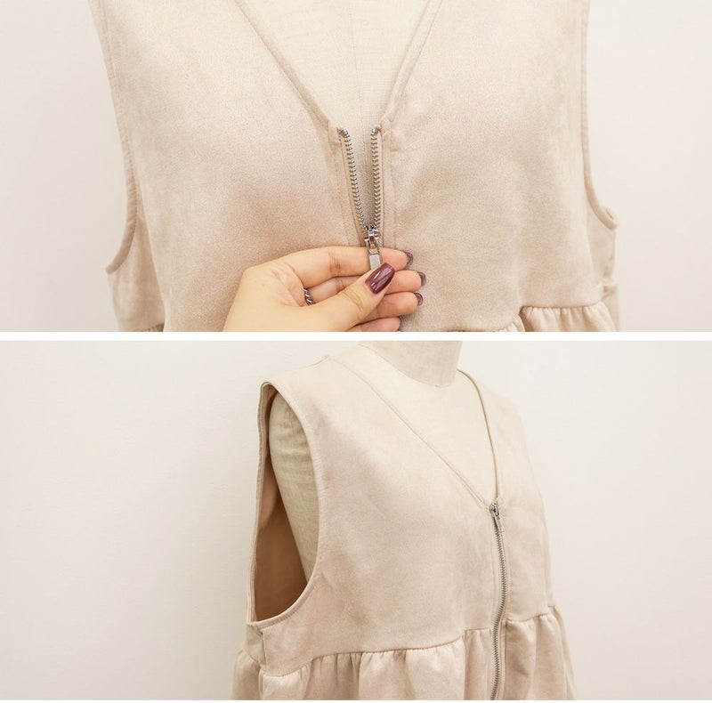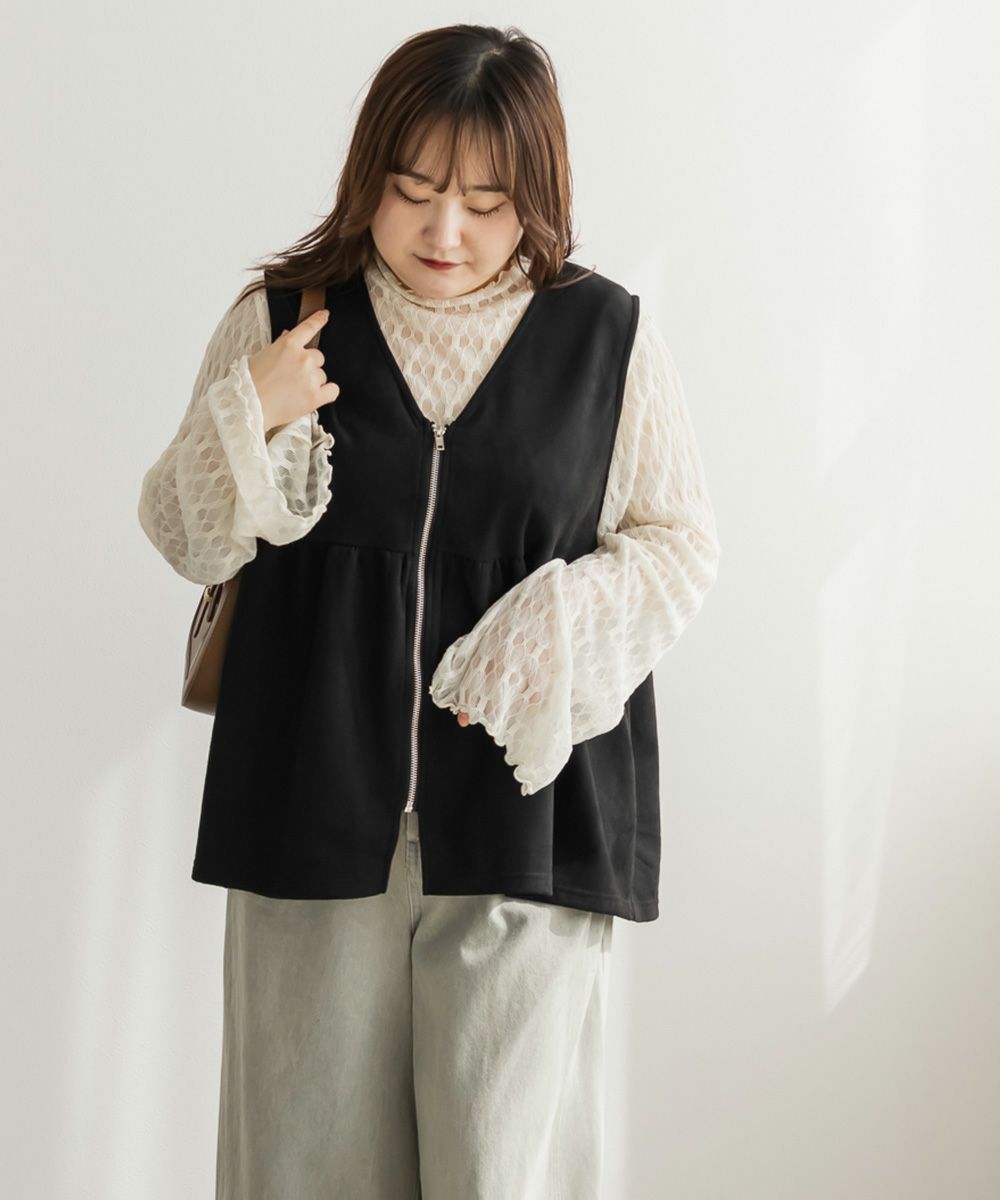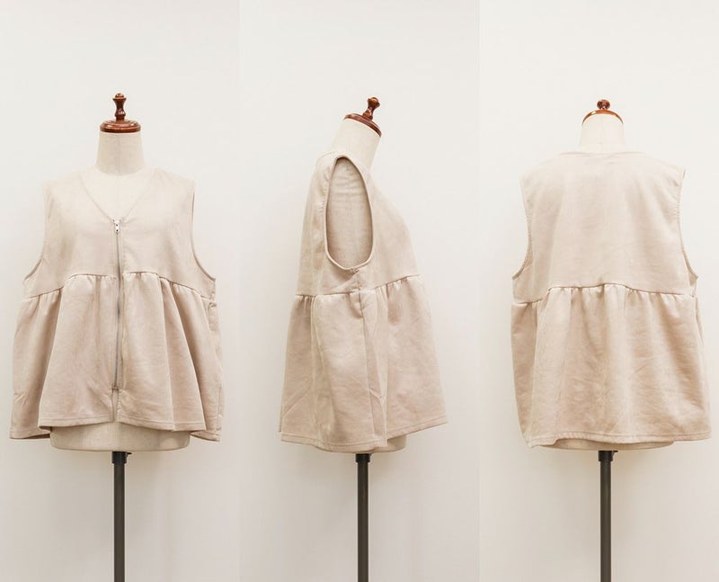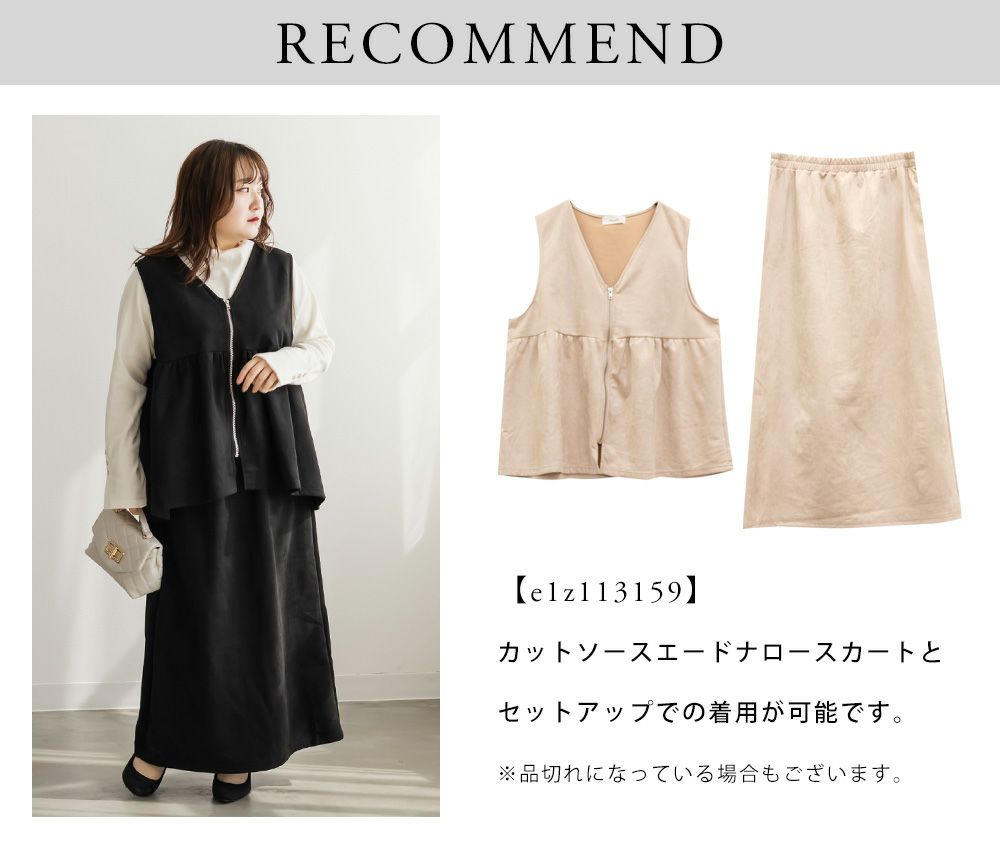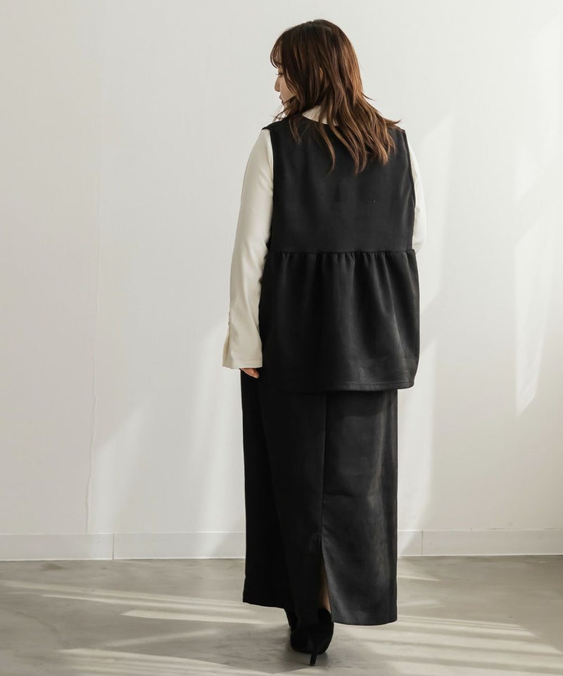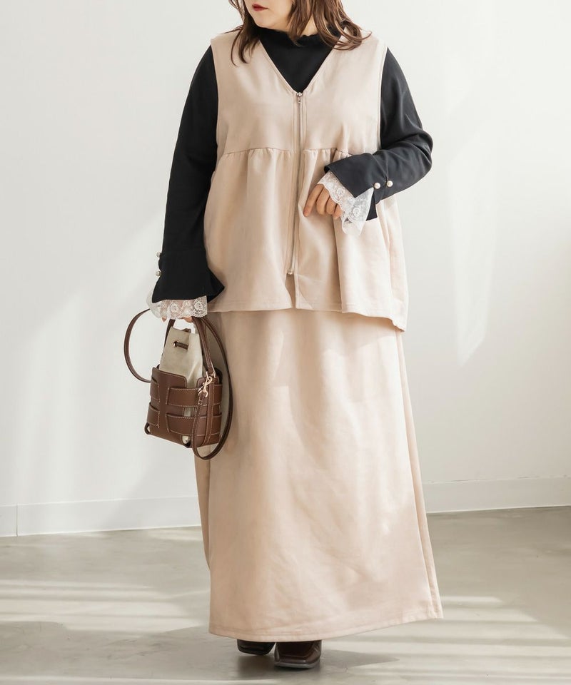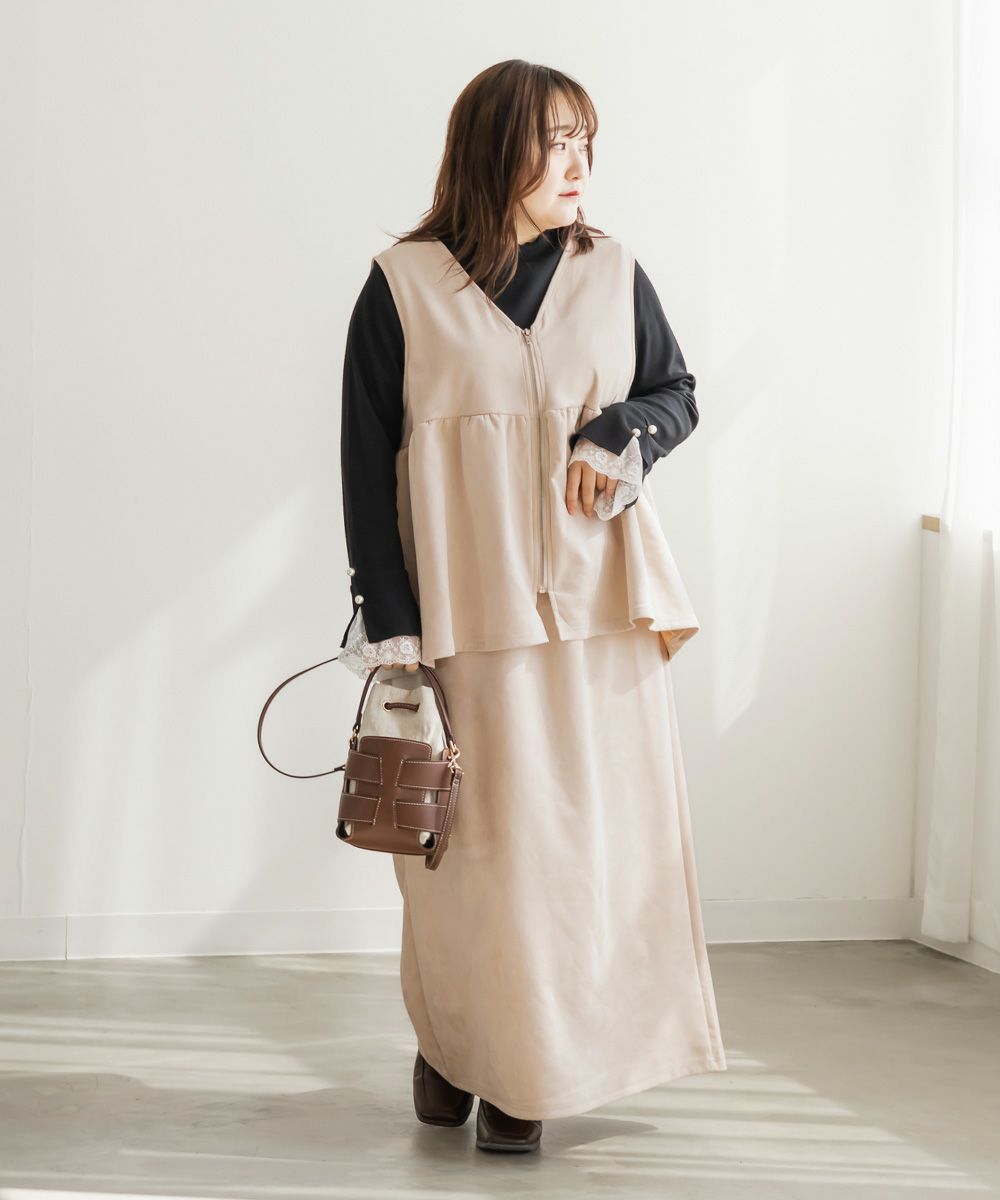 3Lを着てゆとりのあるサイズ感でした。ペプラムデザインでスタイルアップが叶うシルエットなのが嬉しいです♪やわらかいスエード生地が季節感がありコーデに取り入れやすいです!お腹周りをカバーしてくれる丈感なので、Tシャツやニットなどシンプルなトップスと重ねるのがお勧めです!ベストなのでコートなどを羽織ることも出来ると思うのでスタイリング次第でたくさん着回しできそうです◎同じ生地のスカートと合わせて着たら大人ぽく着こなせて可愛かったです!