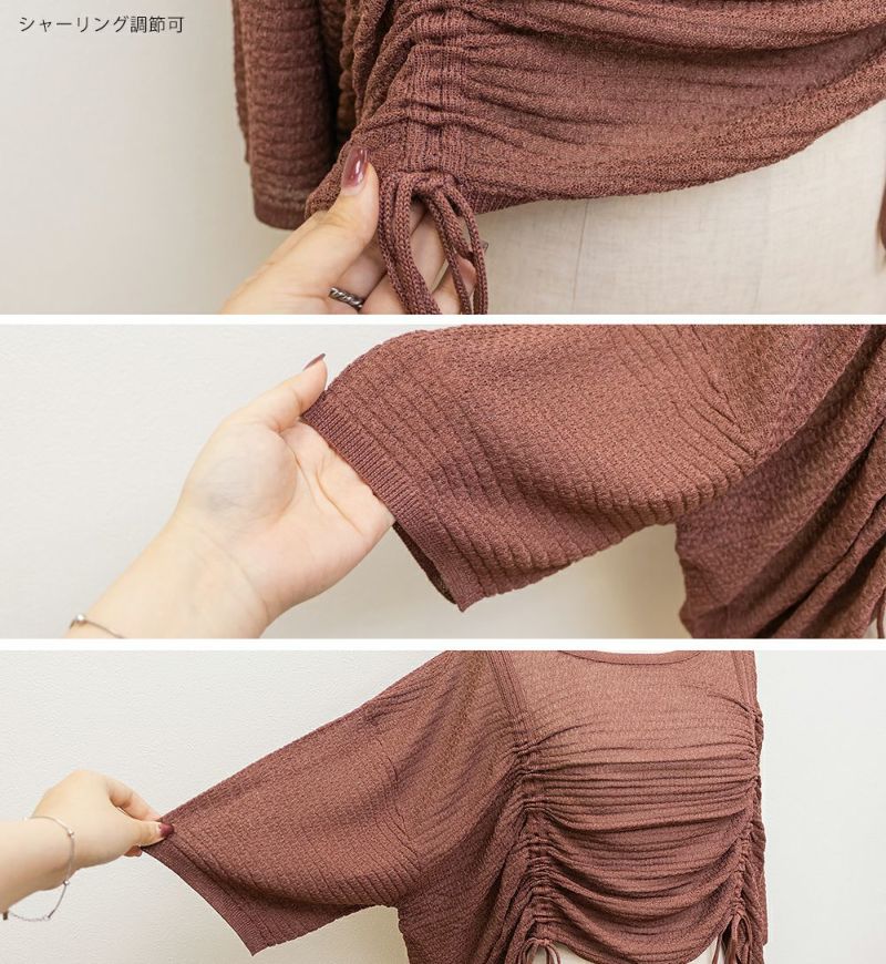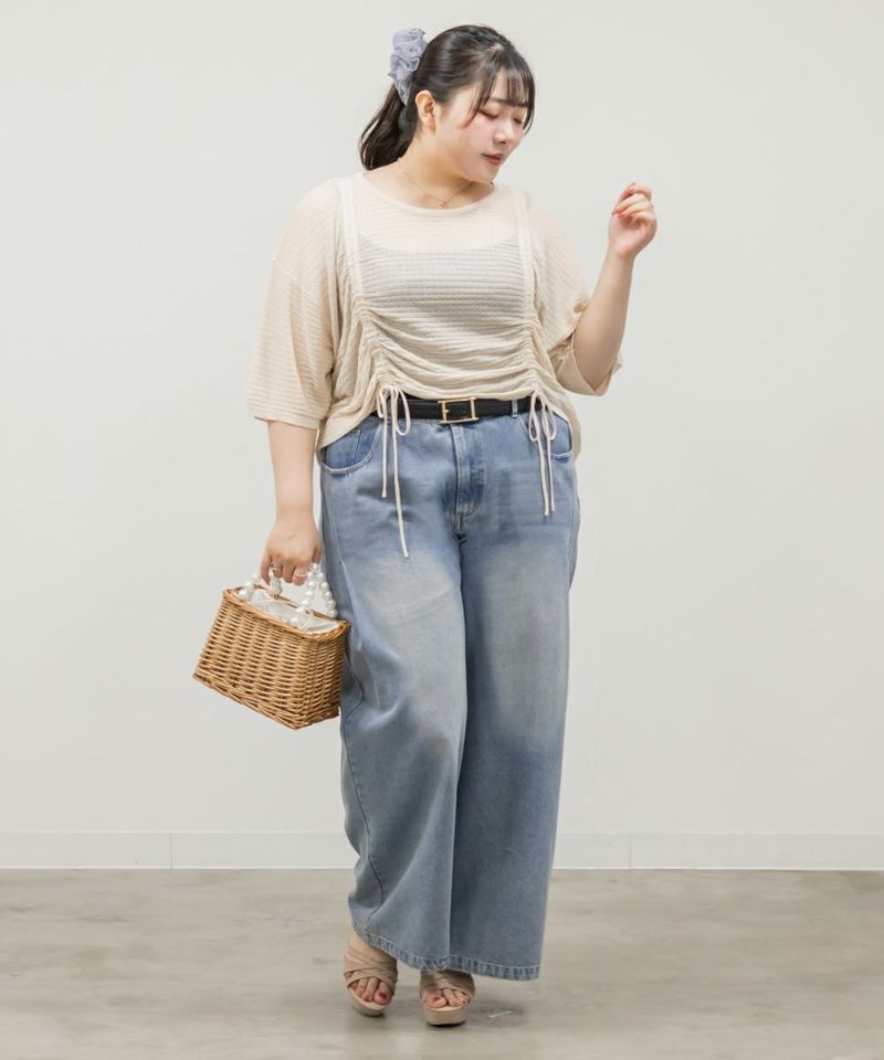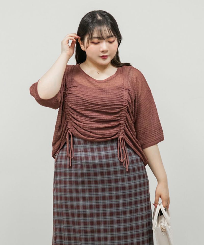 3Lを着用して、程よくゆとりのあるシルエット感でちょうどいい着心地ですです! くしゅくしゅのシャーリングデザインが、表情豊かで華やかな1枚です◎透け感のある軽やかな素材で、夏でも涼しげに着られます。身頃はふんわりしていて、体のラインを拾わず、ゆるっと着られるのが嬉しいポイント♪ 袖は肘まで隠れる長さなので、二の腕もしっかりカバーしてくれます!春~秋まで着られるアイテムで、長く使えてお勧めです♪