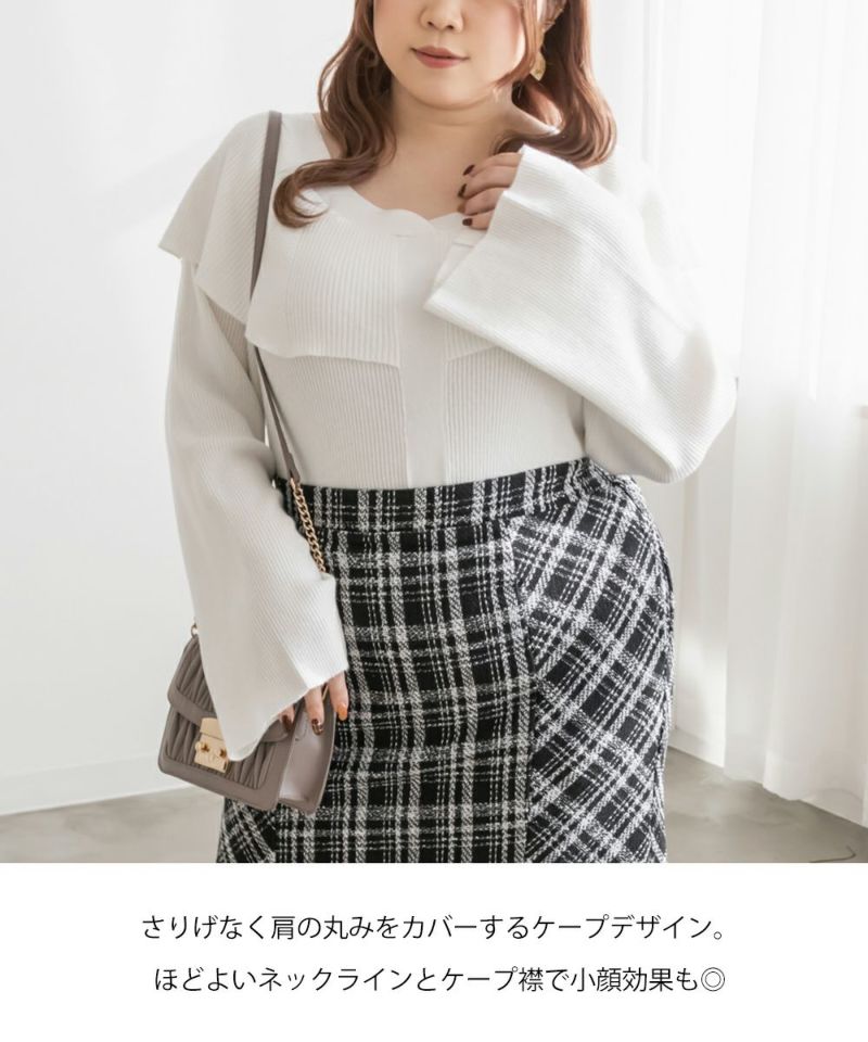 3Lを着てちょうどいいサイズでした。首回りが綺麗に開いているので、顔回りがとってもすっきりと美人見えできます。上品な雰囲気のケープデザインでシックで女性らしい印象にまとまります。デザインが可愛い上にすっきりと見えるのが嬉しいです!ニット生地で伸縮性があって着心地らくちんなのも高ポイント!大人の女性を演出する高見えな雰囲気のアイテムなので、キレイめなコーデになれる1枚です◎