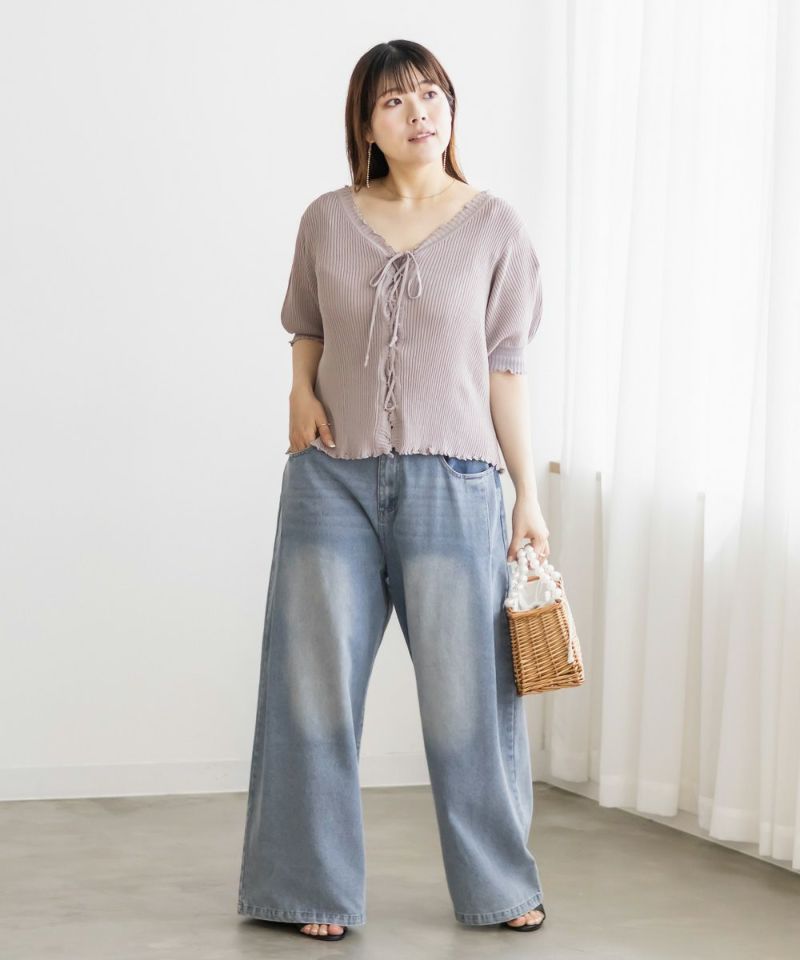 3Lサイズを着用して、ちょうどいいサイズ感でしたゆとりを持たせたサイズ感で、リブの伸縮性があるのでストレスフリーな着心地◎シャリ感のある薄手のサマーニットなので真夏でも着ていただけます!フロントのレースアップデザインがアクセントになって、シンプルすぎない華やかさがある1枚です。袖の長さも肘にかかるくらいで、二の腕も自然にカバーしてくれるのが嬉しいポイント!デニムやスカートにも合わせやすく、デイリー使いにぴったりです!