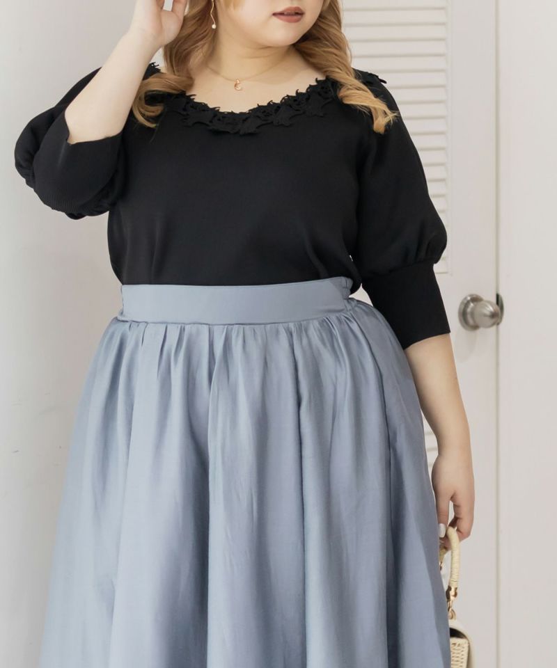 3Lを着用して丁度いい着心地でした。程よくゆとりがあってボディラインをカバーしてくれます。ネックのレース使いが上品で女性らしい印象の6分袖ニットで、肘まで隠れる袖丈が嬉しいです♪シンプルながらも華やかさをプラスしてくれるデザインです。軽くてお手入れが楽なスポンジニット素材で着心地も良く、6分袖なのでロングシーズン活躍します◎1枚でさらっと着てもおしゃれに決まり、ボトムス次第でカジュアルにもきれいめにも着こなせます。