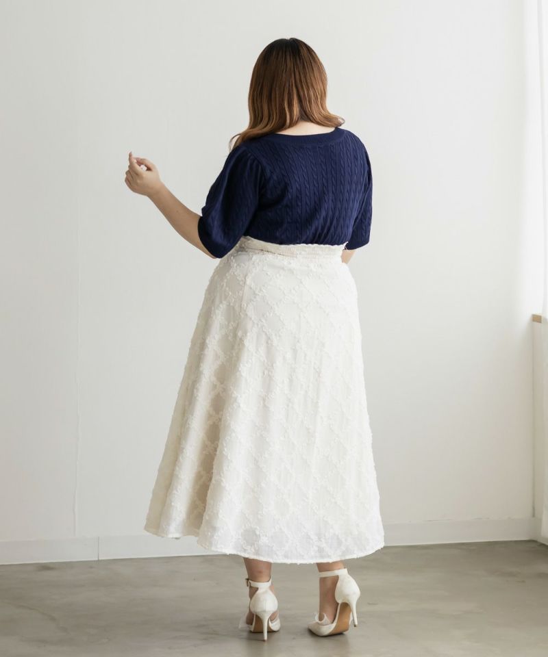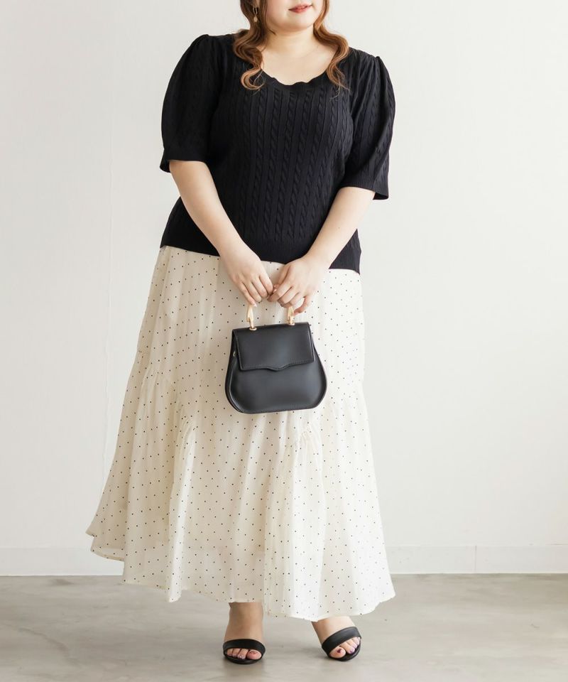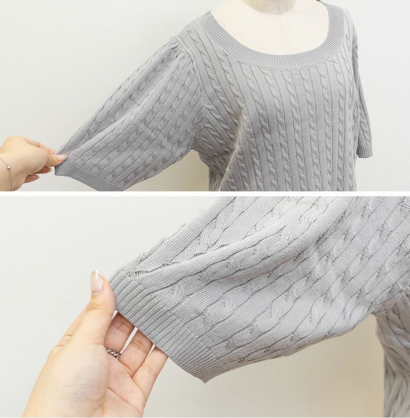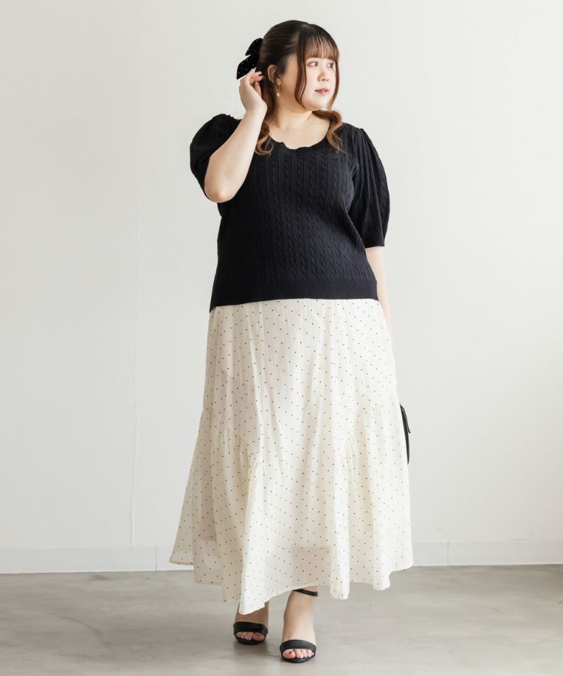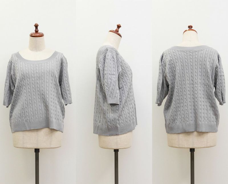 3Lを着てちょうどいいサイズ感でした。いつもどおりのサイズ選びで問題なさそうです◎伸びも良くて着心地が良いサマーニットです!縦のラインが強調されるケーブル編みがポイントで、今っぽい雰囲気のアイテムです。袖丈も短すぎず、ニットだけどピタッとしないのが嬉しいです!さらっと1Tシャツ感覚で着られて、デイリー使いはもちろん、きちんと感が欲しいシーンにもおすすめです♪韓国っぽいコーデにも、ワンピやジャケットなどののインナー使いにも着回し可能です!