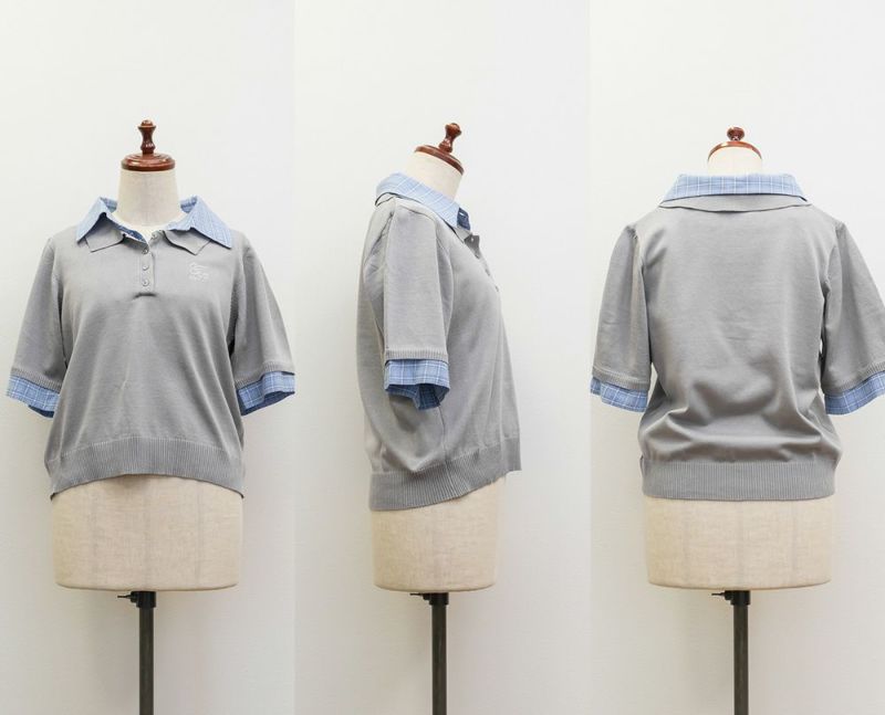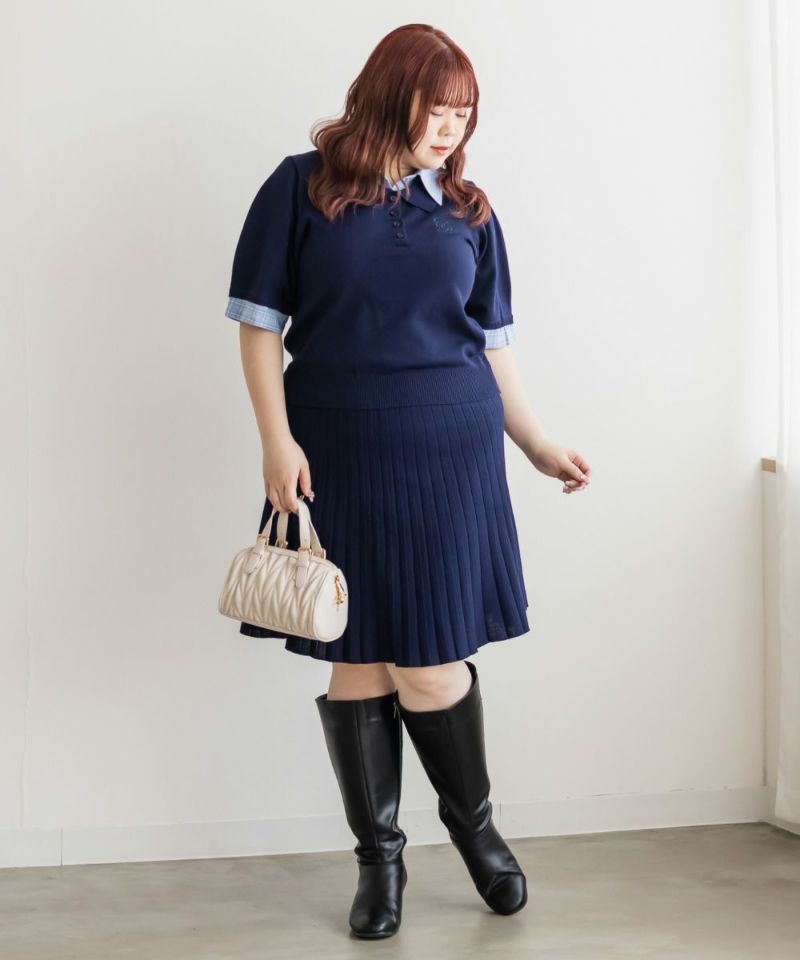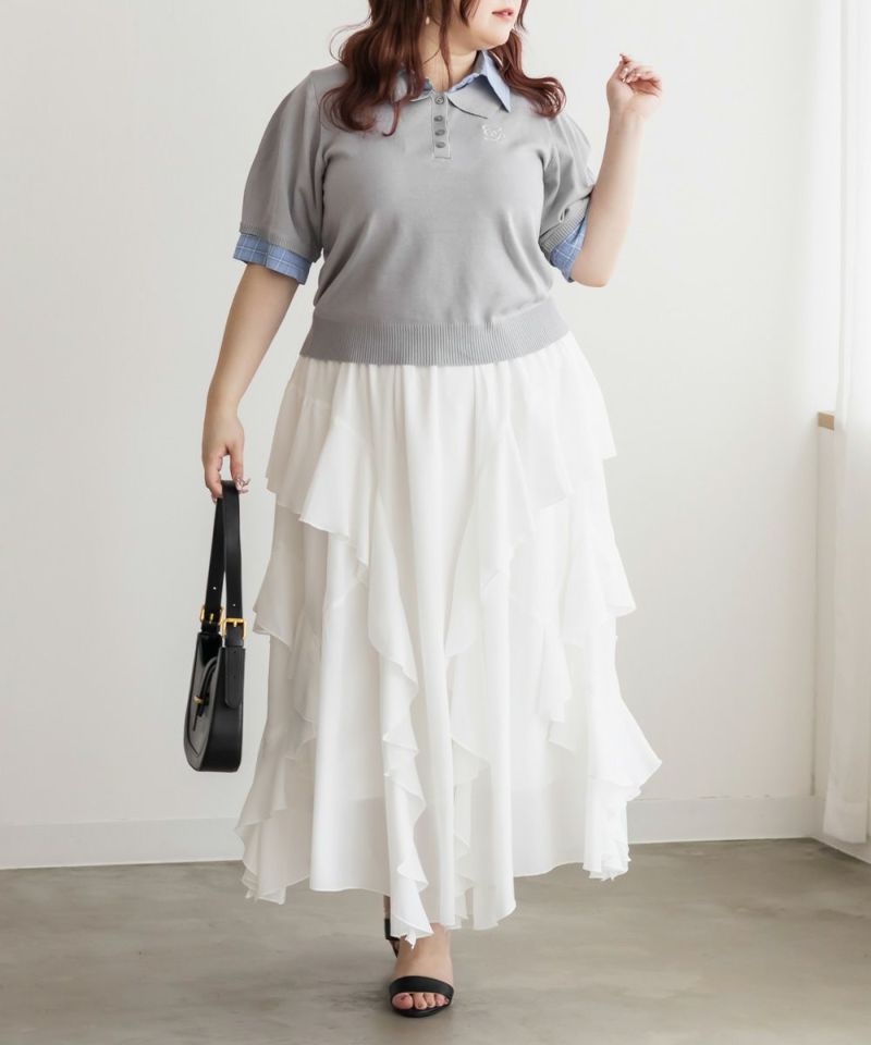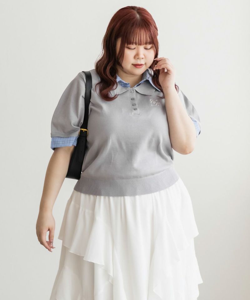3Lサイズを着用して窮屈感のない楽な着心地でした。ニットだけど身頃はピタっとせずにボディランを拾いずらいシルエットです!ポロニットにシャツを重ねたようなデザインで、重なっているのは襟と袖の先だけなので厚みがなく、夏にもピッタリなサマーニットです。レイヤード風のデザインはトレンドで今着たいアイテムです♪シャツ地は細かいチェック柄で、カジュアルすぎずガーリースタイルに合わせれるのが嬉しい!スカートやパンツ合わせはもちろん、キャミワンピにレイヤードも可愛いと思います◎
