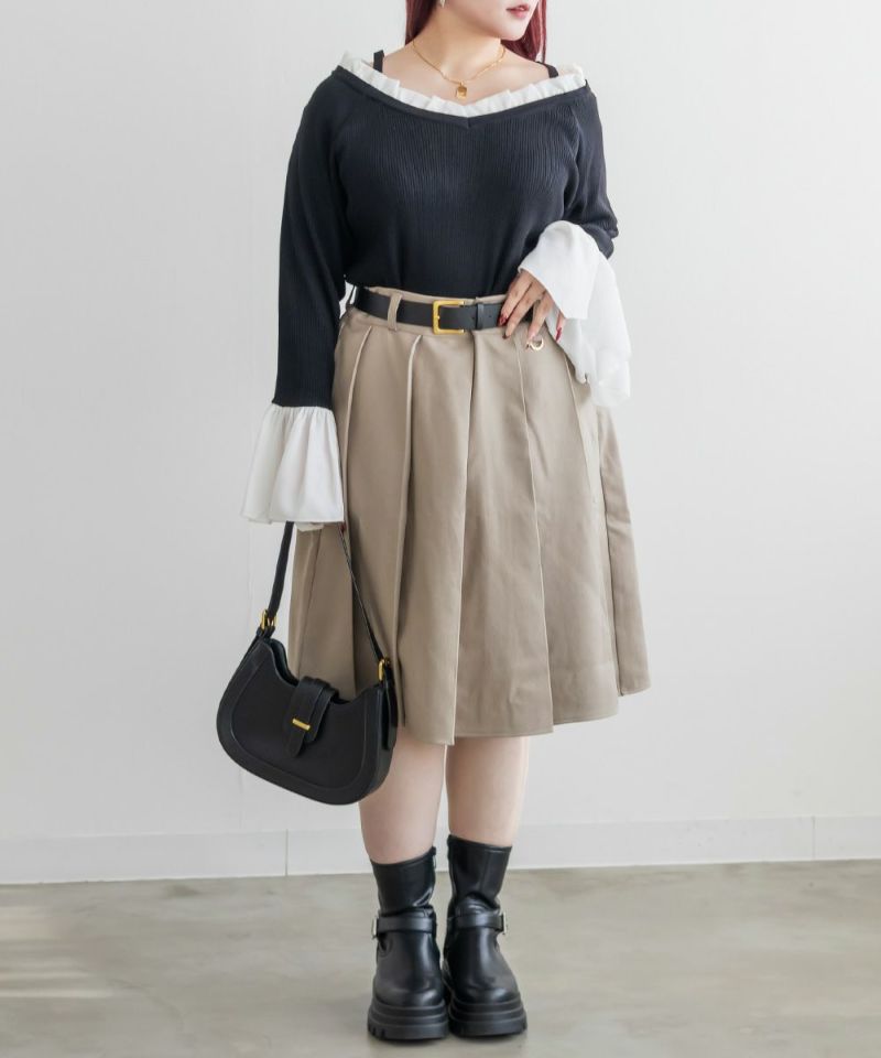 3Lを着て着用感はちょうどよく、ニット部分は伸びるので窮屈感なく楽に着られました。ジョーゼット生地のフリルをドッキングしたデザインが自然に視線を上に集めてくれて、顔回りを華やかに見せてくれます◎ 異素材切り替えでも甘くなりすぎず、大人っぽさが残るバランス感が◎ 1枚でスカート・パンツ合わせでも華やかに見えるのがポイントです♪ きれいめにもカジュアルにも使いやすく、オンオフどちらにも活躍してくれるニットだと思いました。