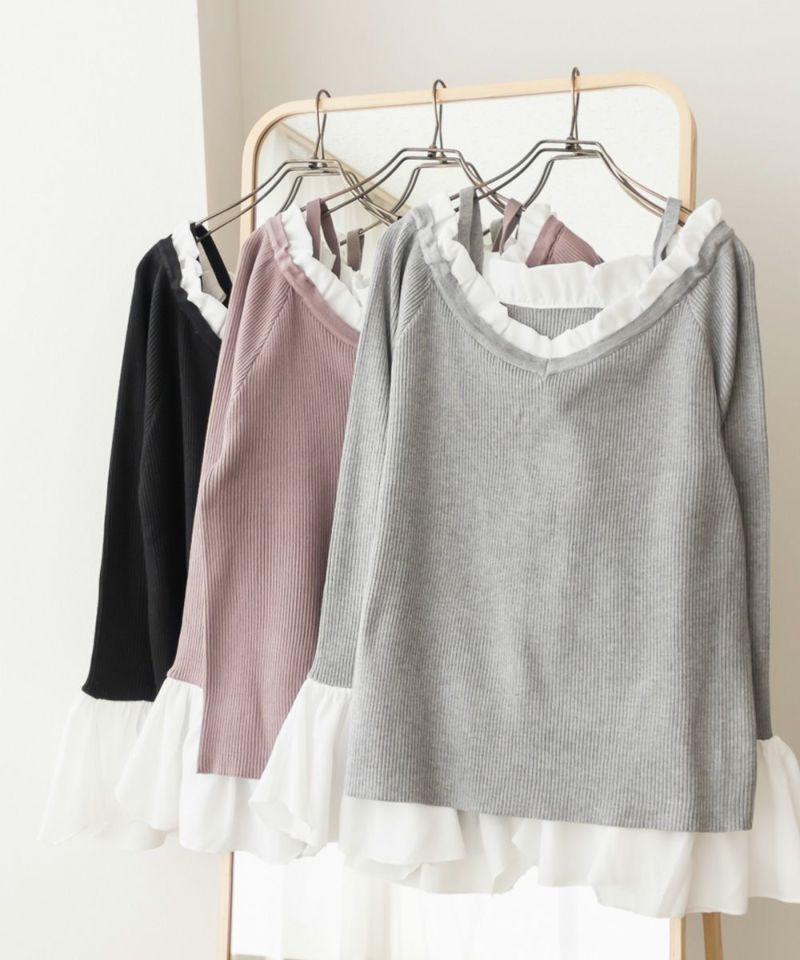 【design】襟元のフリルと袖のフレアがフェミニンなニットプルオーバー。デコルテを綺麗に見せるネックラインと程よくすっきりとしたシルエットで女性らしく着やせできる。袖口のニットと布帛のドッキング部分は伸縮できるから、腕まくりができて実用性があるのもポイント。【material】伸縮性ののあるリブニットに、襟/袖には落ち感のあるジョーゼット素材の布帛がドッキングされています。【styling】女性らしさたっぷりのデザインだから、甘すぎない小物やシューズ合わせがおすすめ。襟とフリルの白色配色でコーデを重くさせない抜け感のある印象に。