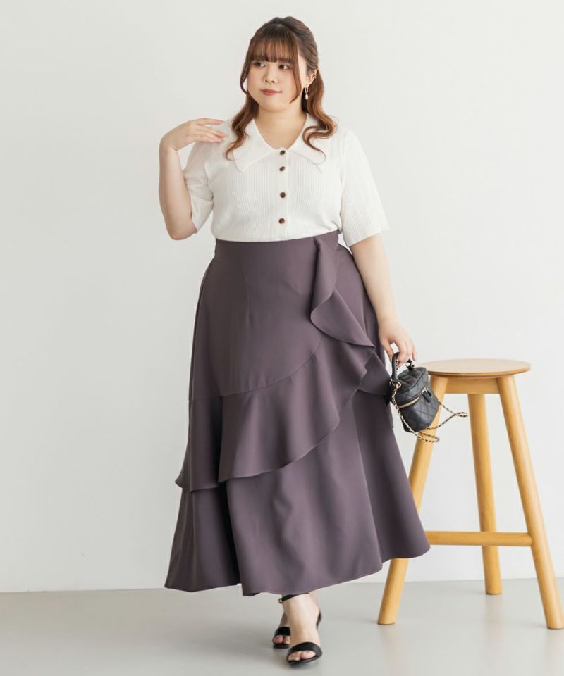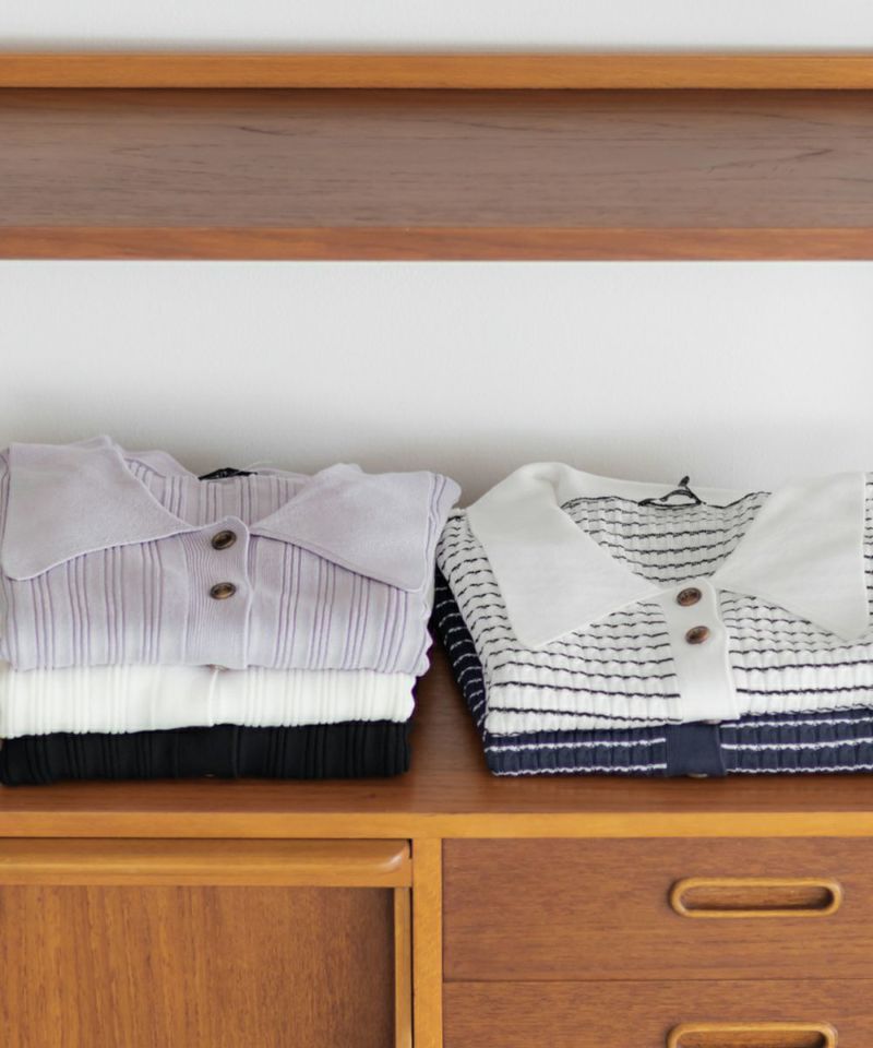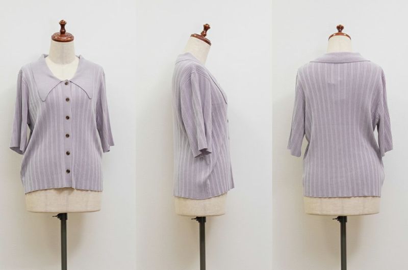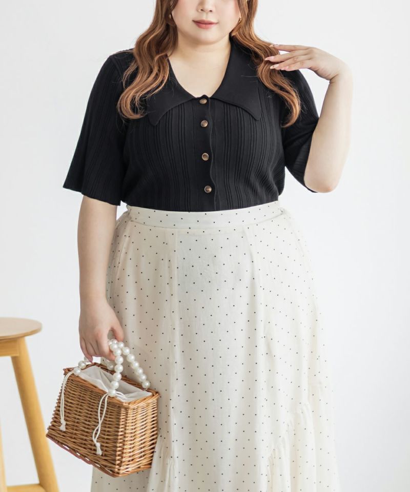 3Lを着てちょうどいいサイズ感でした。程よくゆとりのある袖周りがポイントで、ニットだけどピタッとせずに着られます◎こなれ感をプラスしてくれる襟付きニットで、オンオフにも使える大人っぽい印象なのが嬉しい!お仕事からデイリーまで幅広いシーンで着用いただけます♪襟が顔まわりをシャープな印象に見せてくれ、ボトムスにINした着こなしや、裾だしでももちろん着やすい着丈です!ボタンを開けて羽織としての着こなしもおすすめです。さらりとした軽やかな生地も魅力で、真夏でも使えるサマーニットです!ワイドパンツやフレアスカートなど、ボリューム感のあるボトムスとの合わせもおすすめで、コンパクトなサイズ感なのでジャケットのインナーとしても!裾のボタンを少し開けて抜け感を出す着方が今っぽくて可愛いです!