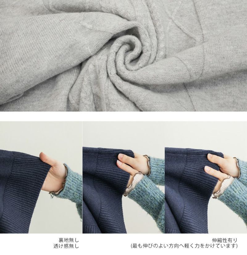 【design】ゆったりとしたサイズ感が可愛いニットプルオーバー。オーバーサイズでボディラインを隠すだけではなく、大き目のケーブル編みで視覚的に身体を小さく見せて、Vネックは小顔効果をプラス、余裕のある袖デザインは二の腕を細く見せてくれます。ヒップラインまで隠れる安心感のある着丈です。【material】柔らかな手触りのニット素材。コートやジャケットを着られるように、分厚すぎないようボリュームを抑えた実用性のある厚み感もポイント。(アウターのデザインによりますのでご注意ください)【styling】ゆったりとしたシルエットだからすっきりとしたシルエットのボトムを合わせると綺麗にまとまります。プリーツスカートやマーメイドスカートと合わせれば女性らしく、すっきりとしたデニムと合わせれば爽やかな印象に。カジュアルなイメージのあるケーブル編みニットにはアクセサリーや小物に女性らしいアイテムを合わせると上級者感が出せるのでおすすめです。