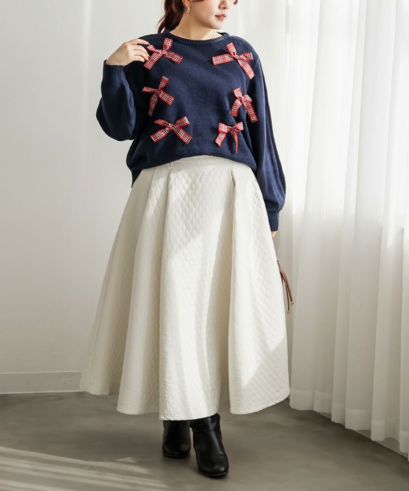 3Lサイズを着用してちょうどいいサイズ感でした。程よい丈感でトップスインしなくても着られるのが魅力です◎チェック柄のリボンが今っぽく、ガーリーコーデにぴったりです♪1枚でかわいくなれるので、シンプルなボトムと相性抜群でおすすめです!コートなどのアウターとも重ねやすいです!