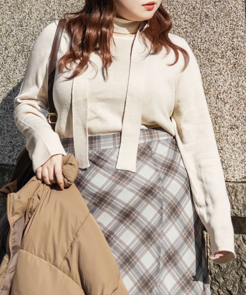 3Lサイズを着用して少しゆとりのある着心地もでした。ニットなので伸縮性もあり楽な着心地でした。秋~春大活躍しそうなニットです!マフラーのようなボウタイがついていて、共地なのですっきりお洒落な雰囲気になれます!首にくるっとして垂らしたらとっても今っぽいコーデになります♪リボン結びをしてもまた違った雰囲気でガーリーになります!トップス自体はシンプルなのでどんな雰囲気のアイテムとも合わせやすいです◎