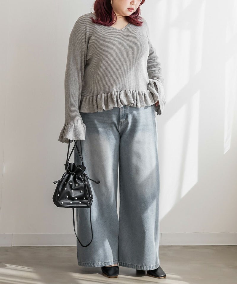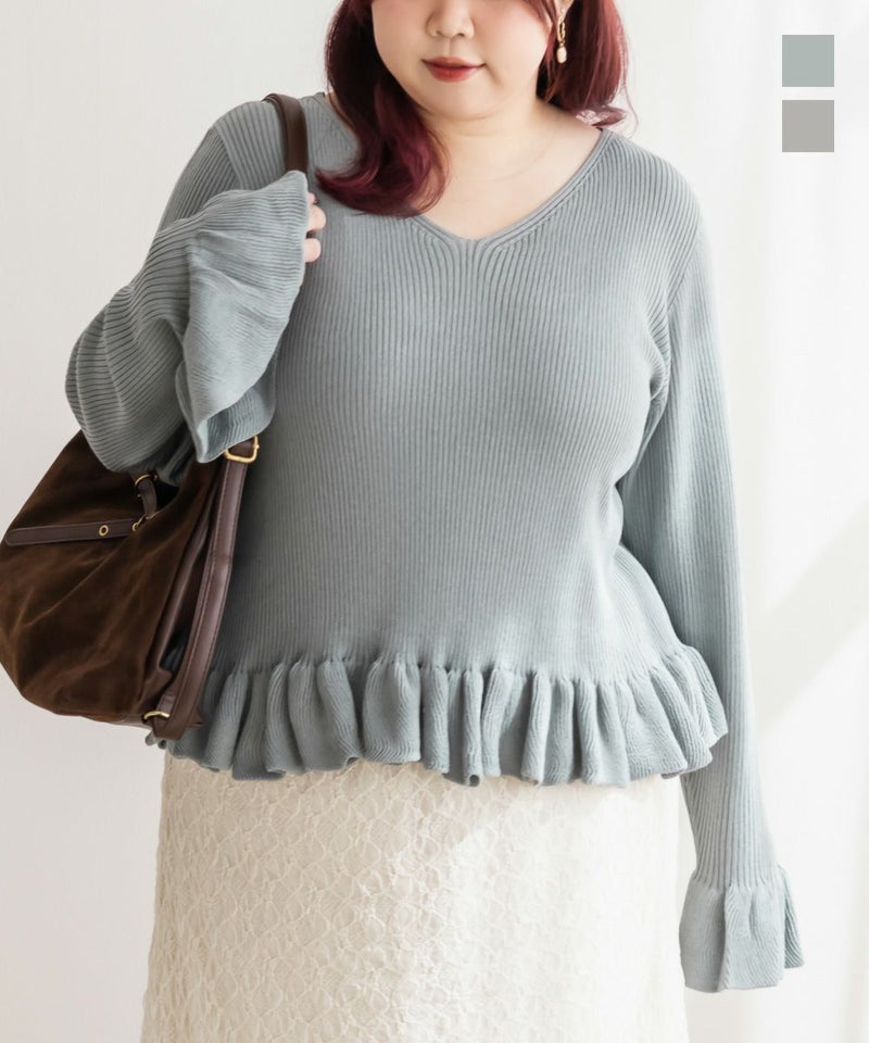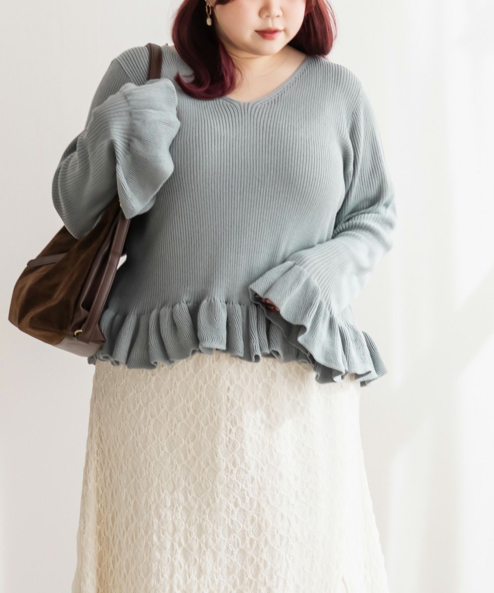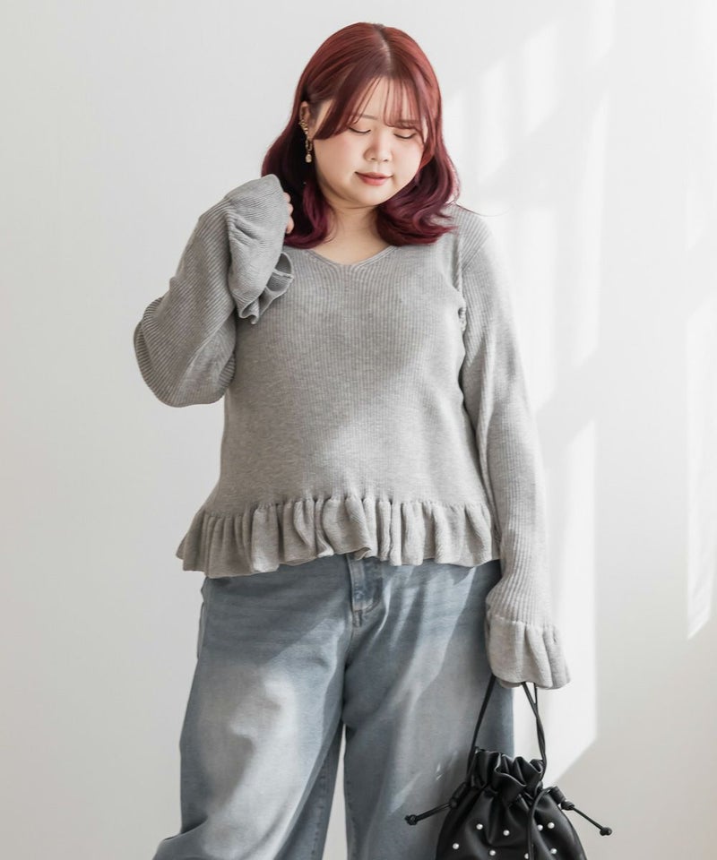 3Lサイズを着用しました。全体的にほどよいゆとりがあり、身体のラインを拾いすぎずちょうどいい着心地です。ニット素材ですがチクチク感はなく、やわらかくて軽い着用感でした♪ Vネックなので首元がすっきり見えて、顔まわりも大人っぽい印象になります。裾と袖口のフリルがさりげなく甘さをプラスしてくれて、シンプルながらも華やかさのあるデザインです。丈が短めなので、裾出しで着てもバランスよく合わせられます!大人っぽくすっきりボトムとあわせたり、フレアスカートだとフェミニンな雰囲気になるのでおすすめです!全体的にバランスが取りやすく、パンツ合わせでも女性らしく着られました◎