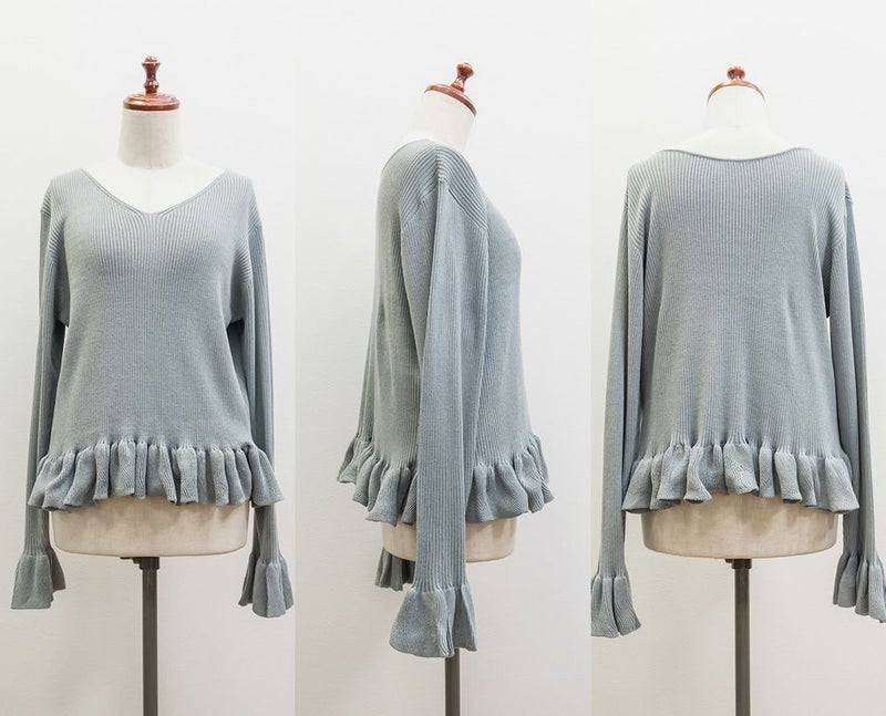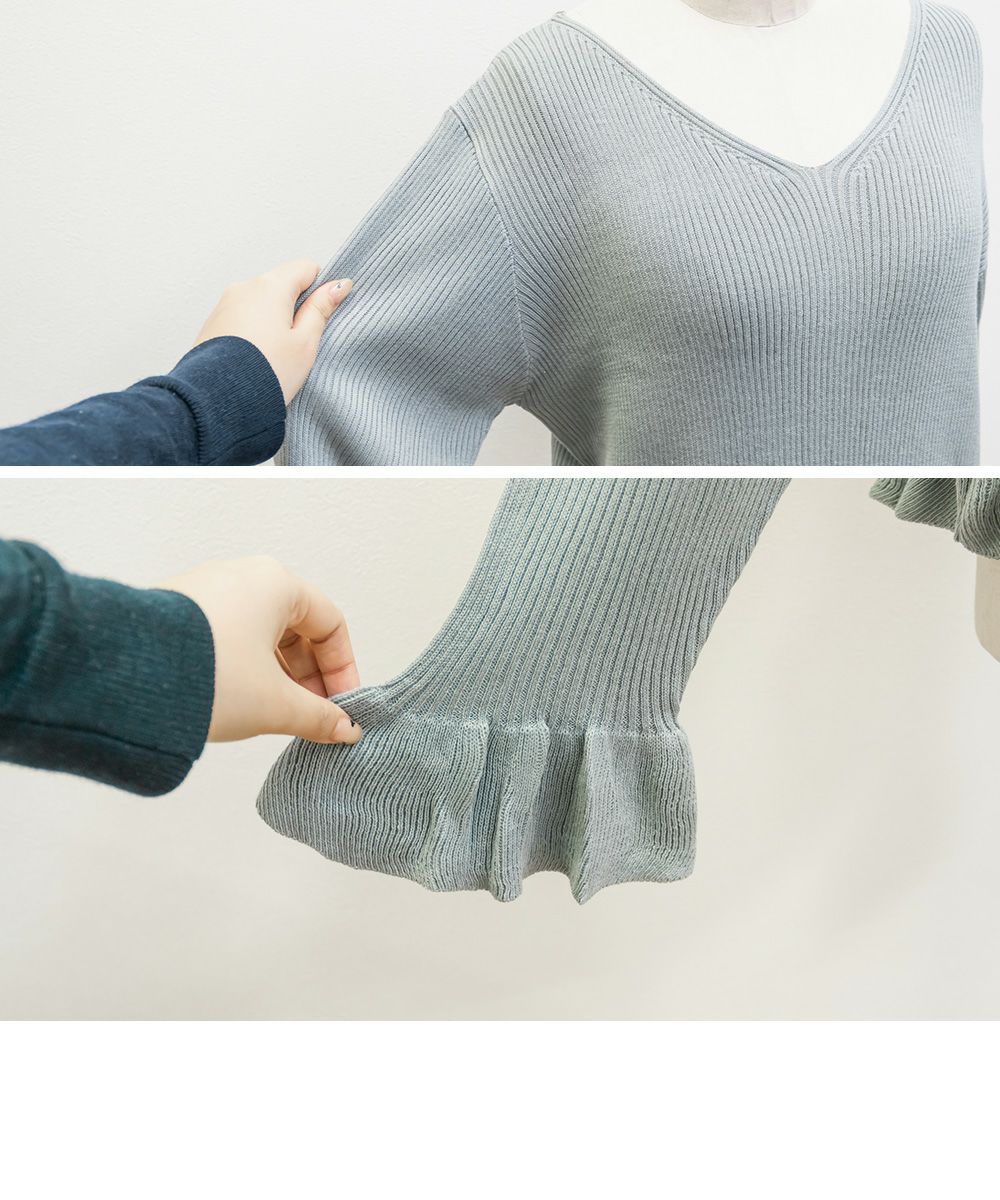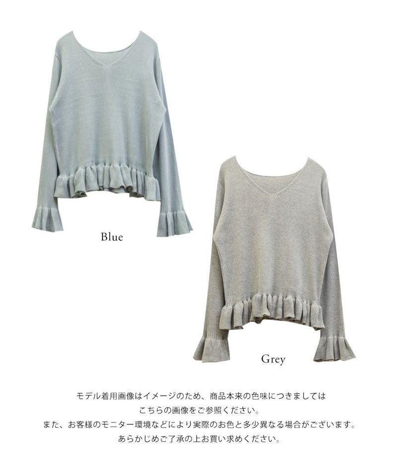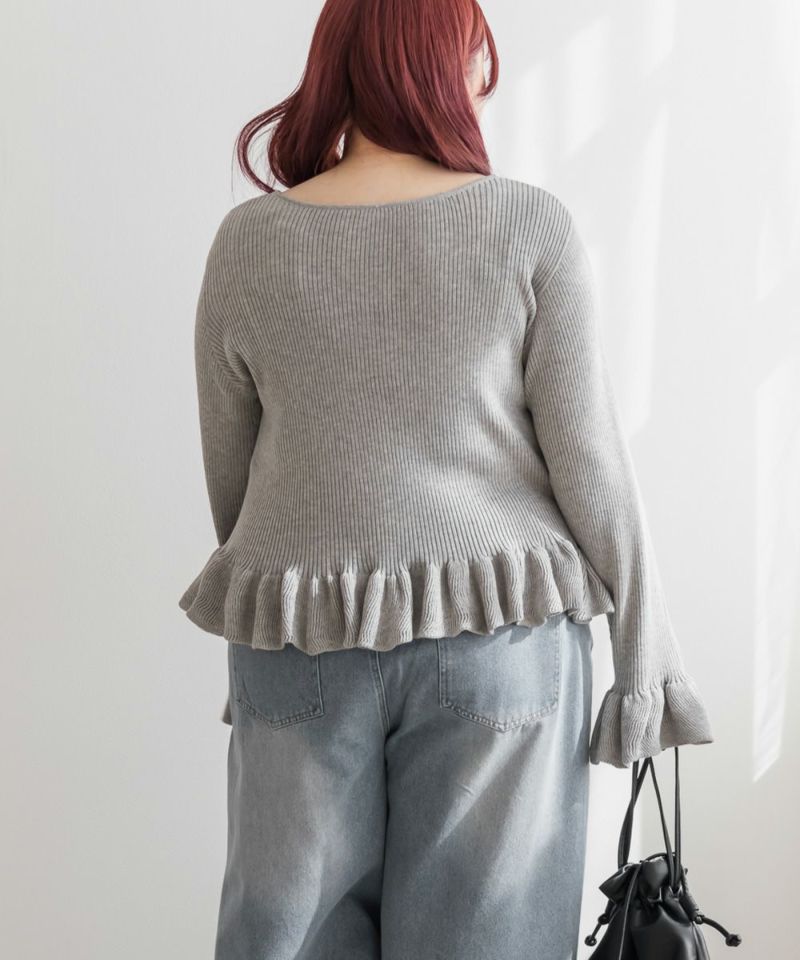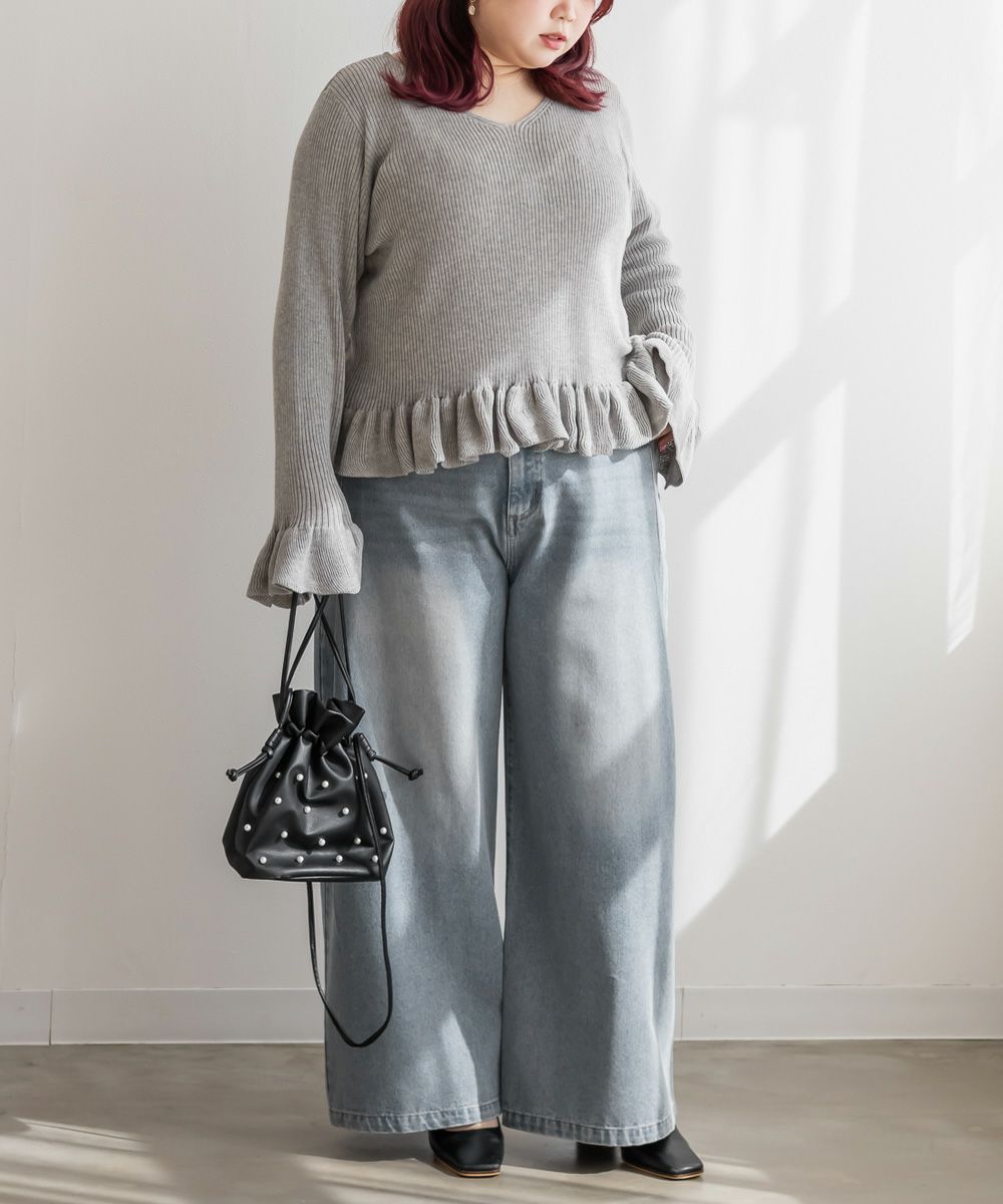 3Lサイズを着用しました。全体的にほどよいゆとりがあり、身体のラインを拾いすぎずちょうどいい着心地です。ニット素材ですがチクチク感はなく、やわらかくて軽い着用感でした♪ Vネックなので首元がすっきり見えて、顔まわりも大人っぽい印象になります。裾と袖口のフリルがさりげなく甘さをプラスしてくれて、シンプルながらも華やかさのあるデザインです。丈が短めなので、裾出しで着てもバランスよく合わせられます!大人っぽくすっきりボトムとあわせたり、フレアスカートだとフェミニンな雰囲気になるのでおすすめです!全体的にバランスが取りやすく、パンツ合わせでも女性らしく着られました◎
