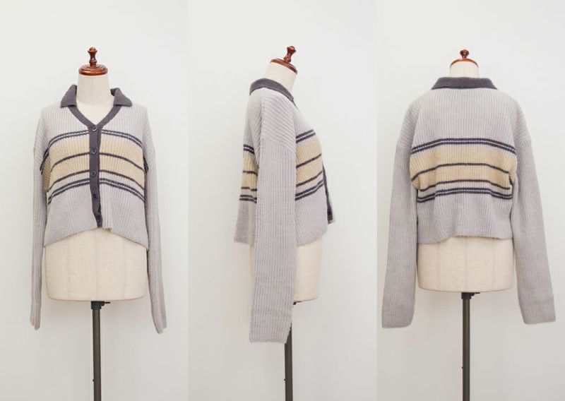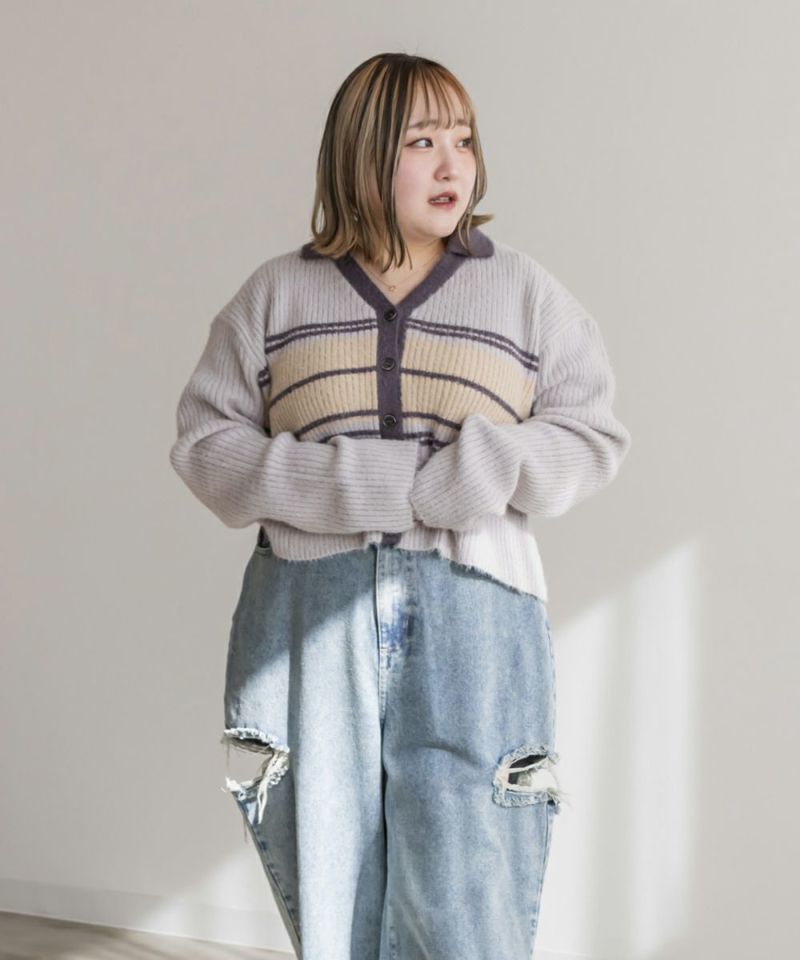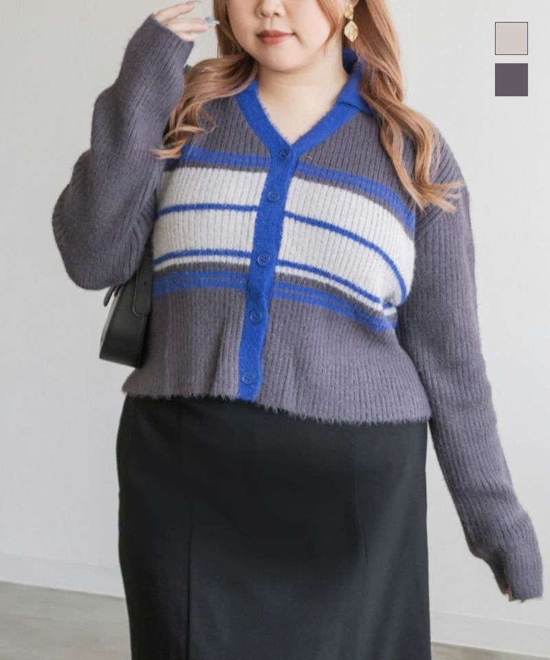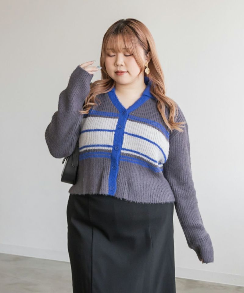 3Lサイズを着用してちょうどいいサイズでした。やわらかいフェザーニット生地で、フワフワの毛足が肌触りも良く着心地ラクチンでした!衿付きの前開きカーディガンですが、トップスとして着るのが今っぽくてお勧めです!マルチボーダーが大人っぽくてカジュアル過ぎない落ち着いた雰囲気に◎お洒落なアイテムなのでボトムはシンプルなものをチョイスするのもおすすめ!
