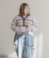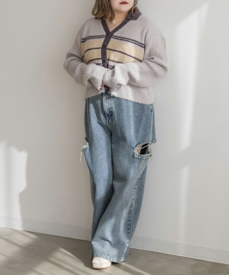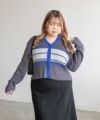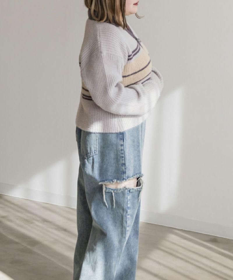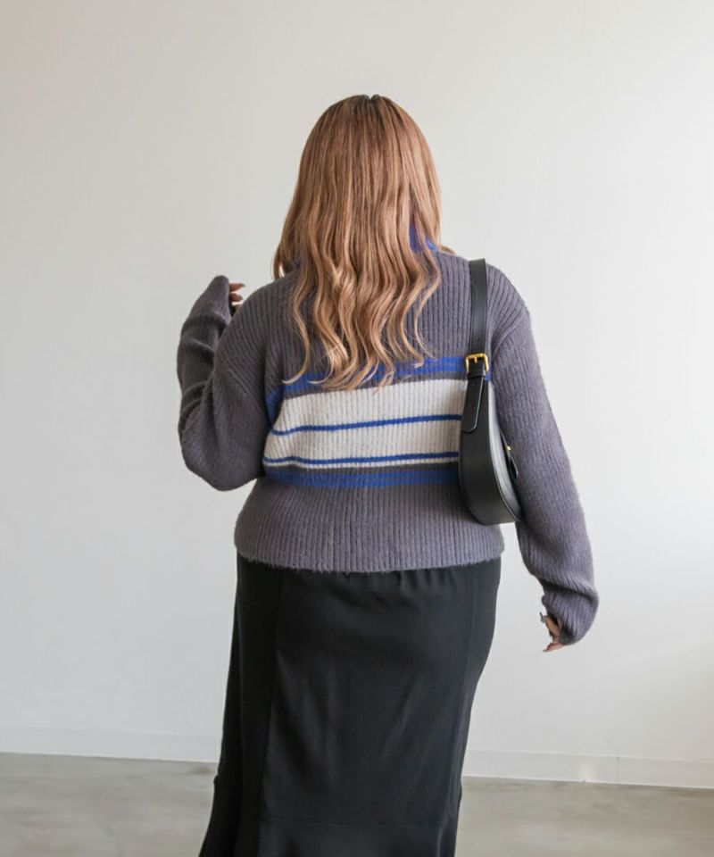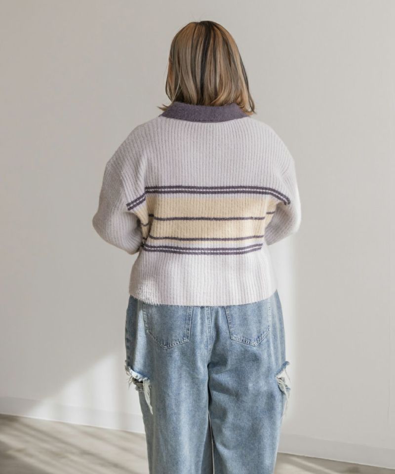 マルチボーダー 衿付き フェザー ニット 長袖 秋冬 トレンド カジュアル 配色 クレット 3L 4L マルチボーダー衿付きフェザーニット