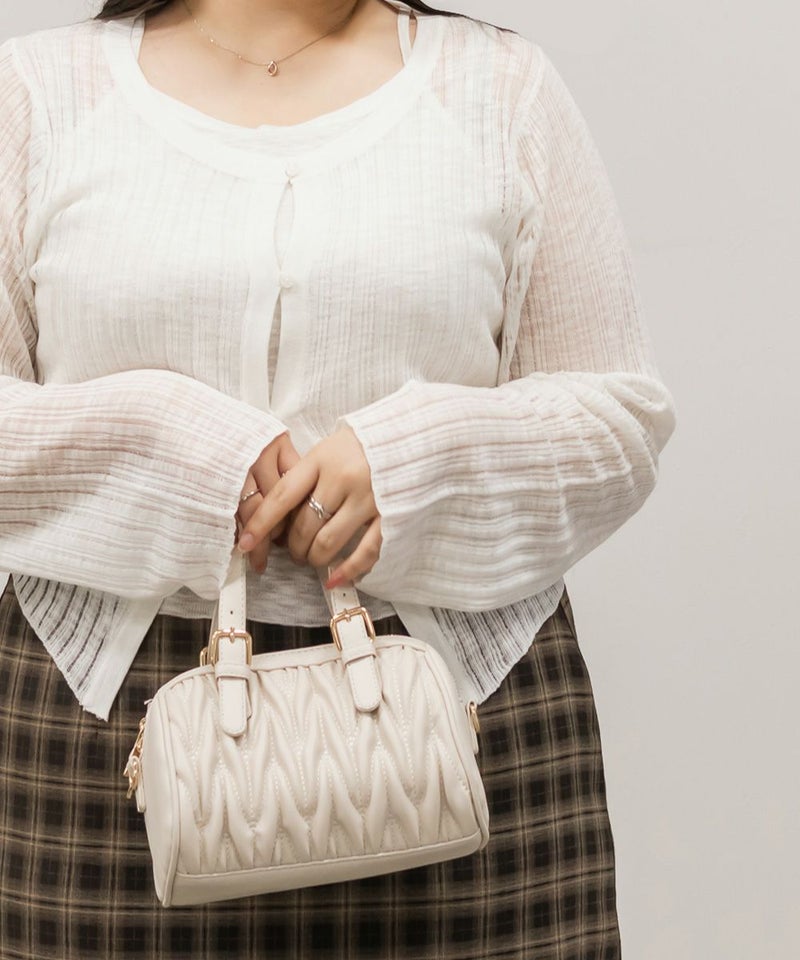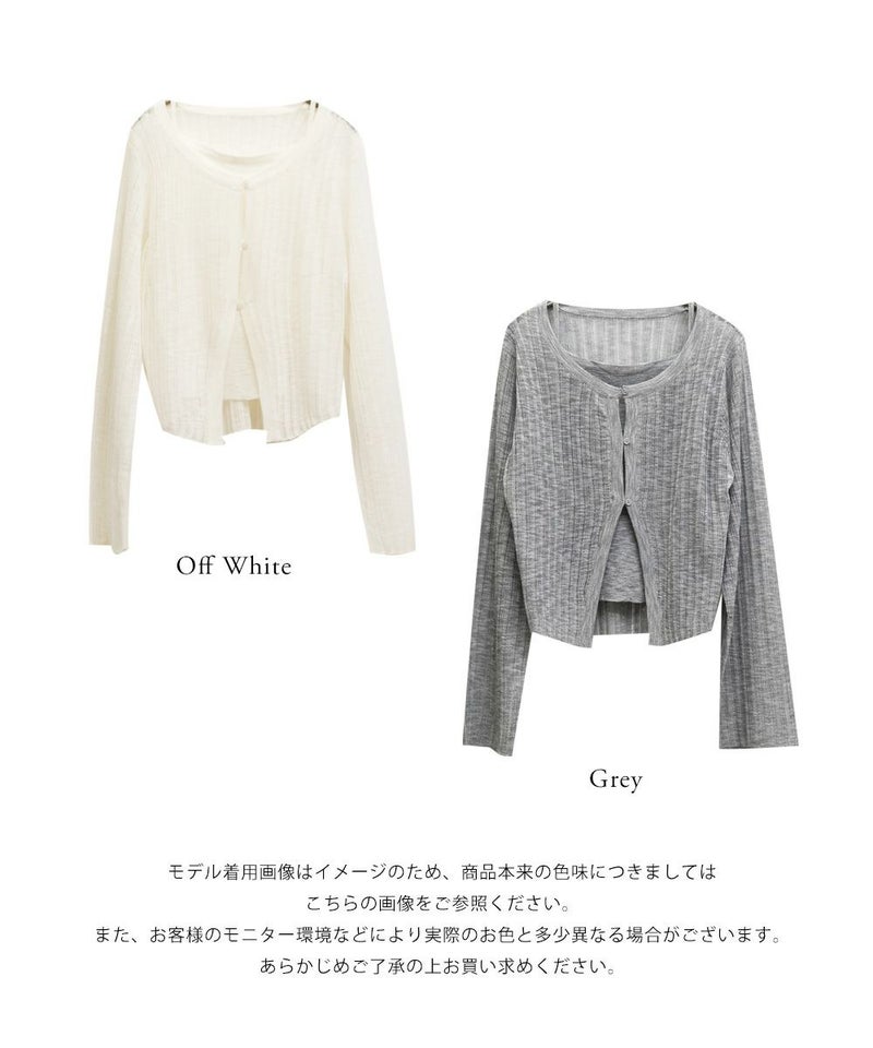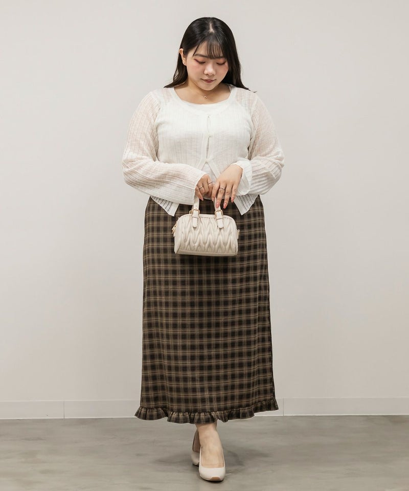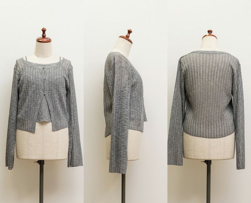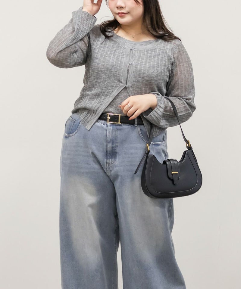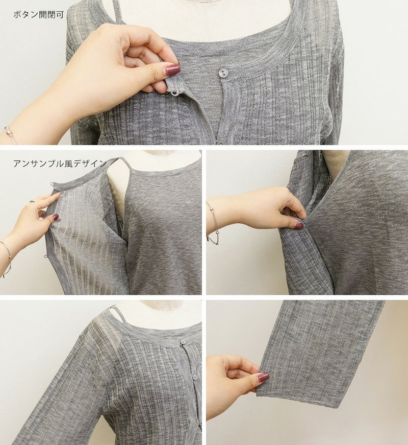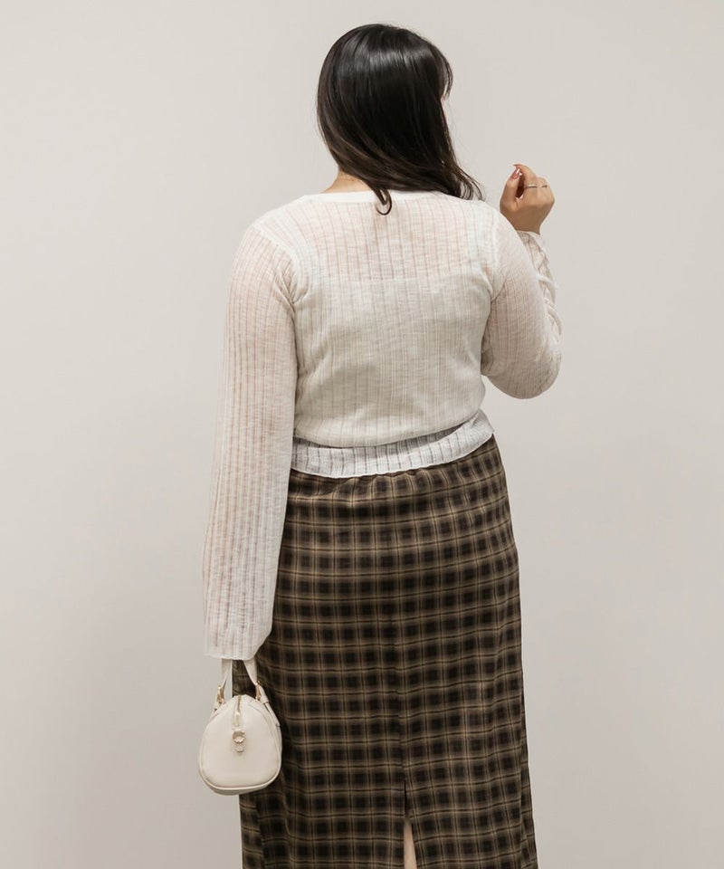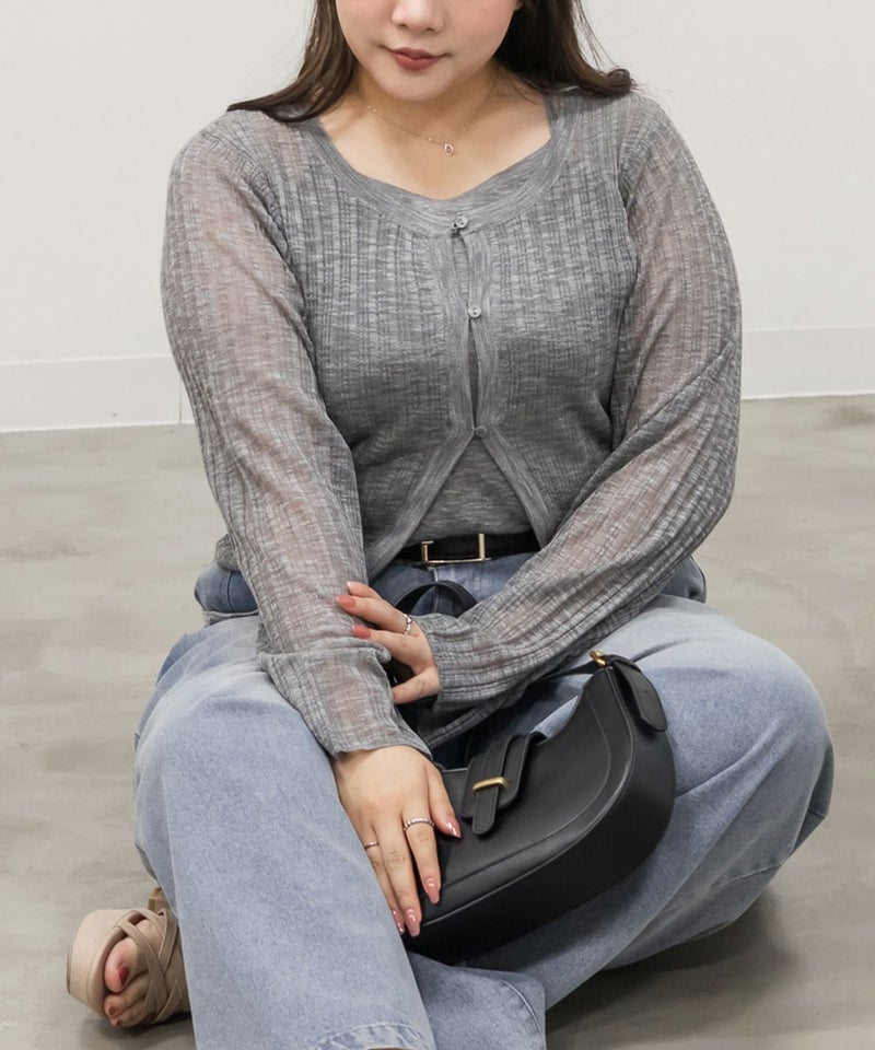 3Lサイズでちょうどよく着られました◎ キャミとカーデを重ねたようなデザインで1枚で完成するから、簡単におしゃれな雰囲気になれる、頼れるアイテムです! 透け感のあるシアーニットが軽やかで、抜け感も出してくれるのが◎ 袖口や身頃もゆとりがあって、締め付け感なく楽ちんな着心地でした♪ 大人っぽいシンプルな雰囲気でどんなボトムとも合わせやすく着回し力の高いアイテムです。