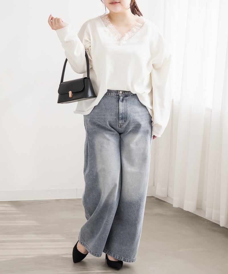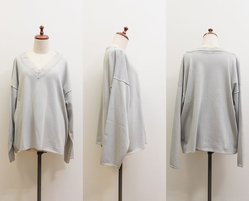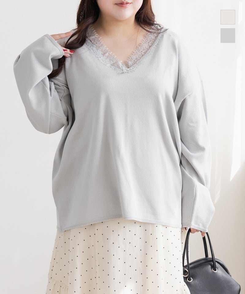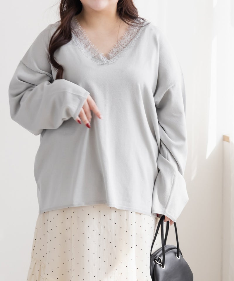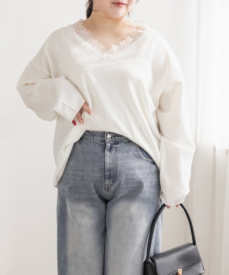 3Lサイズを着用しました。身幅は程よくゆとりがあり、全体的にちょうどいい着心地でした。Vネックは開きすぎずデコルテをすっきり見せてくれて、顔まわりがシャープな印象になります。レース使いがさりげなく華やかで、シンプルながら1枚で着映えするのが嬉しいポイント♪