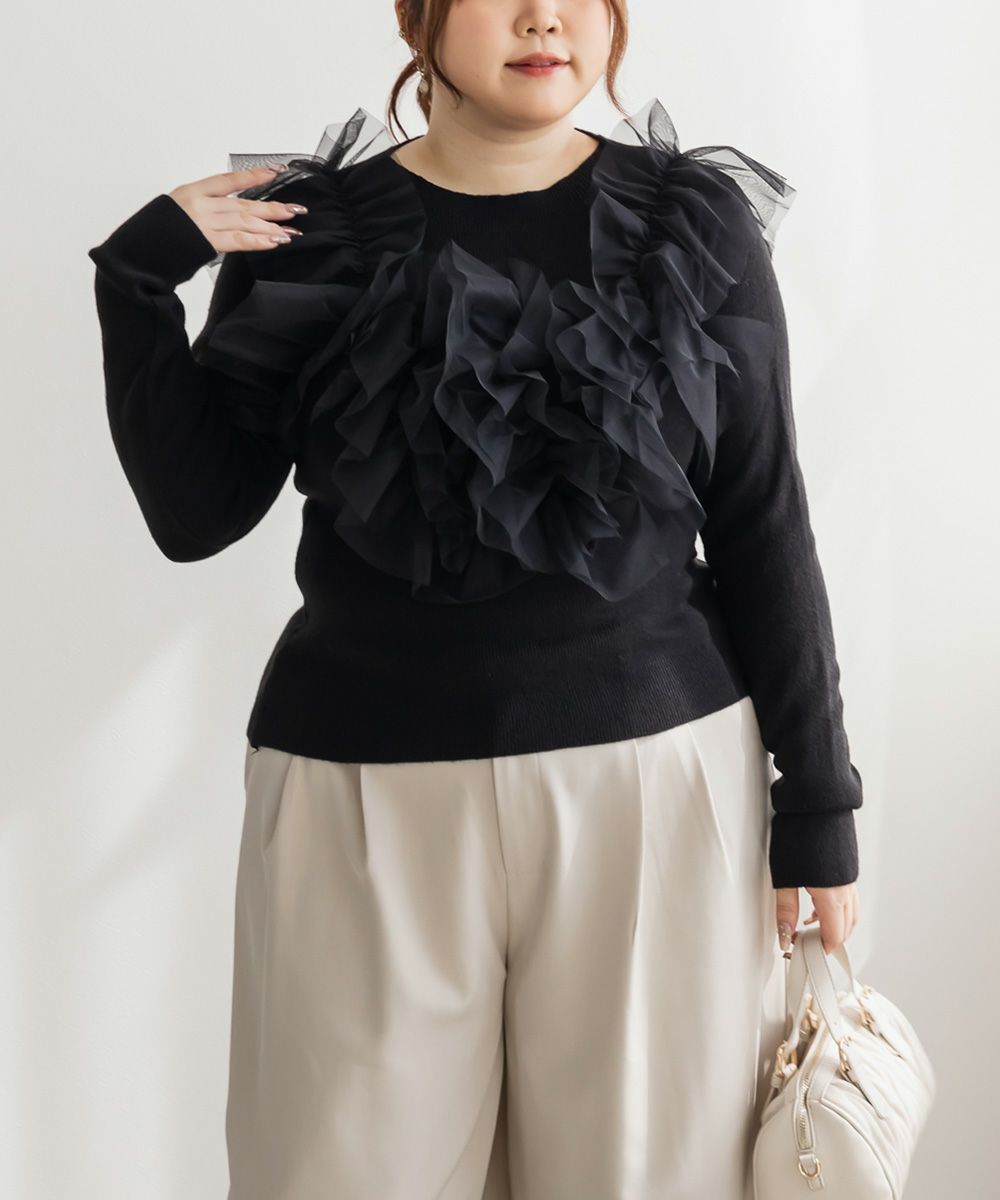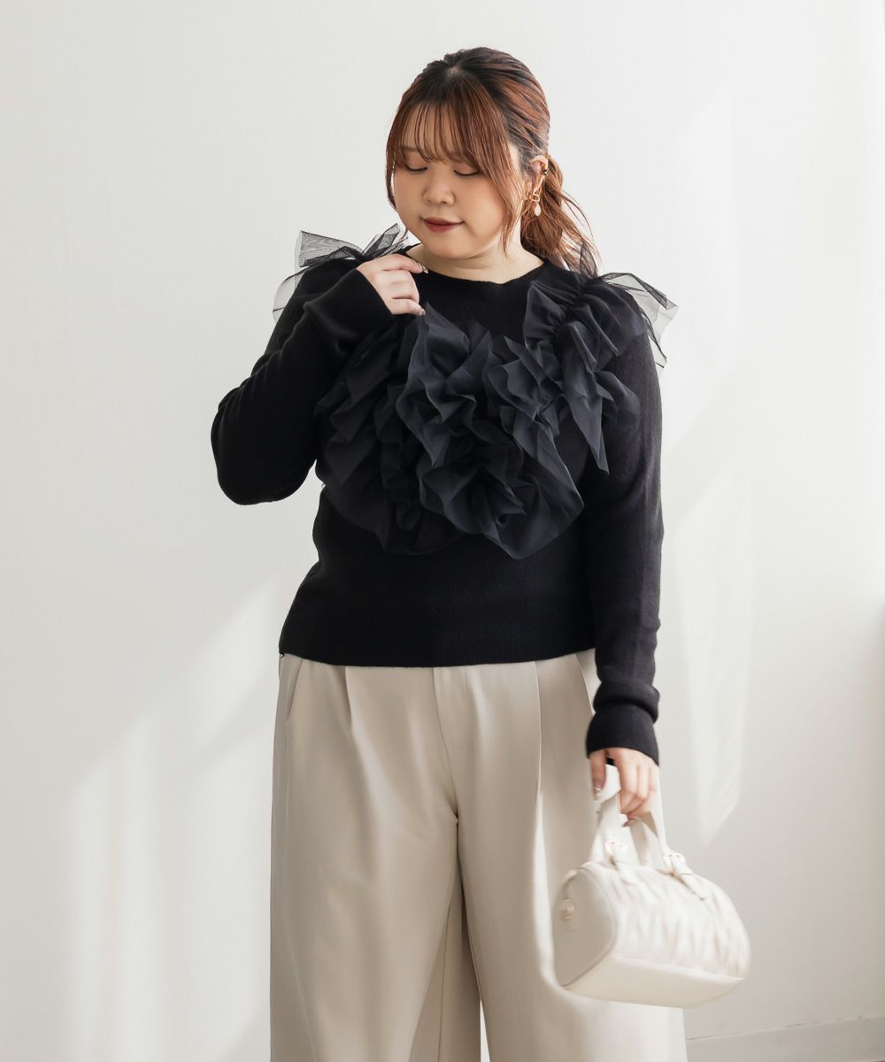 3Lサイズを着用してちょうどいいフィット感で、ニット素材なので体に沿いながらも動きやすかったです!胸元のチュールデザインがポイントになっていて、大人可愛い抜け感を演出してくれます♪生地はしっかり伸びるので、ストレスフリーな着心地でした。裾はインでもアウトでもバランスが取りやすい丈で、パンツにもスカートにも合わせやすい万能トップスです!シンプルになりがちなコーデに取り入れるだけで華やかになれるトップスです◎