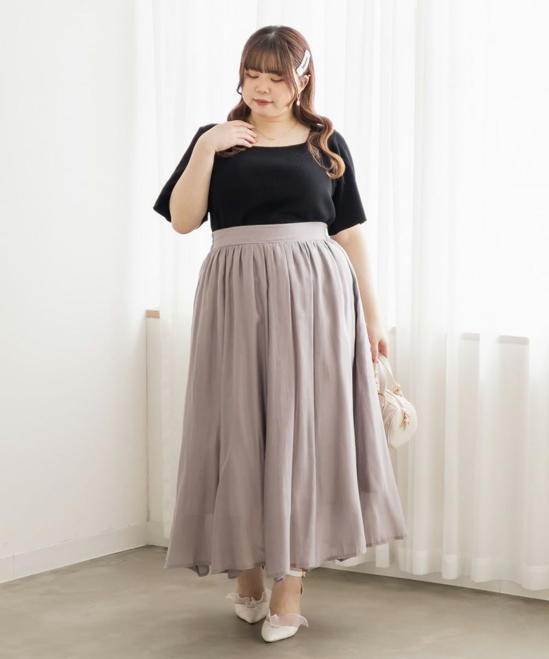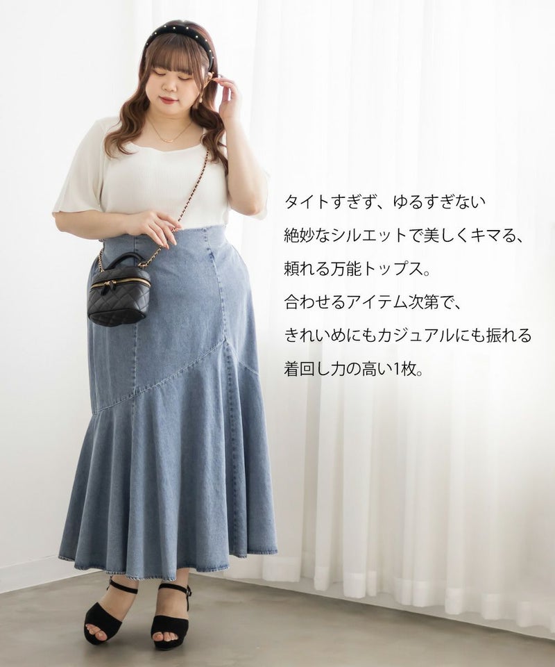 3Lサイズでぴったりすぎず、身幅・腕まわりにも余裕があって窮屈感なし♪伸縮性が良いサマーニットでらくちんでした!スクエアネックが顔まわりをすっきり見せてくれて、抜け感のある印象にしてくれます。リブ素材なのでボディラインを拾いすぎず、程よくフィットして着心地も抜群です!インでもアウトでも着やすい丈感で、スカートにもパンツにも合わせやすい万能アイテムです。1枚ではもちろん、ジャンスカやサロペットのインナーとしても大活躍しそう!シンプルなデザインなのでオンオフ問わず着回しが効きます!