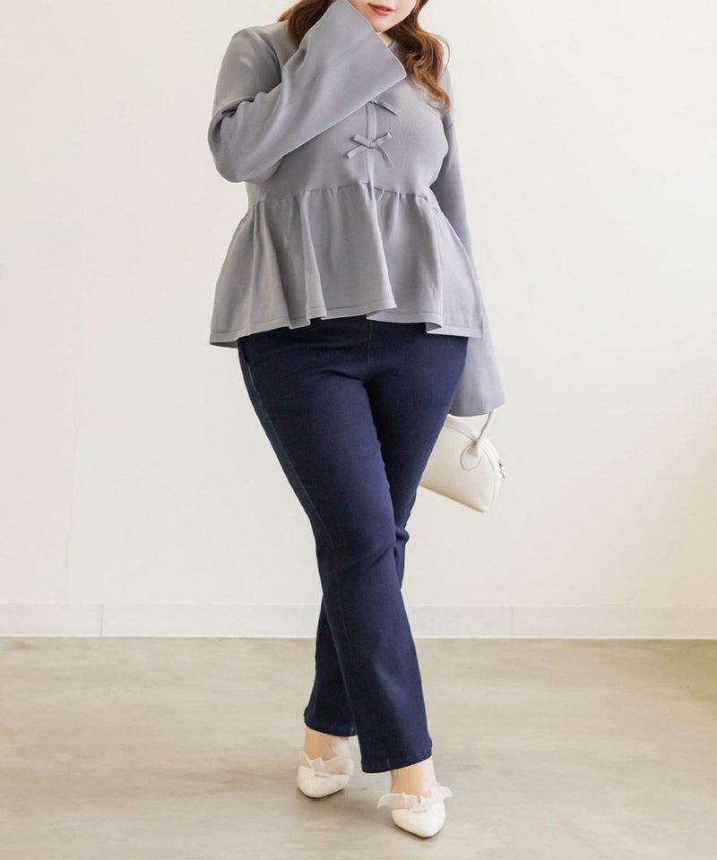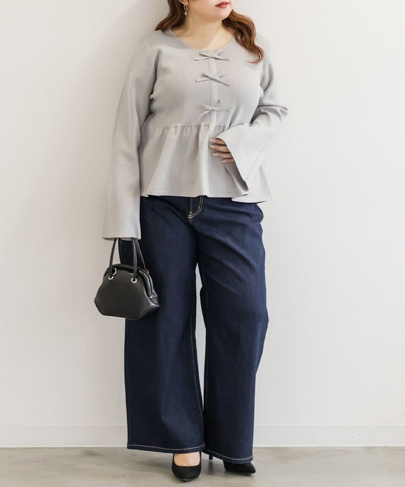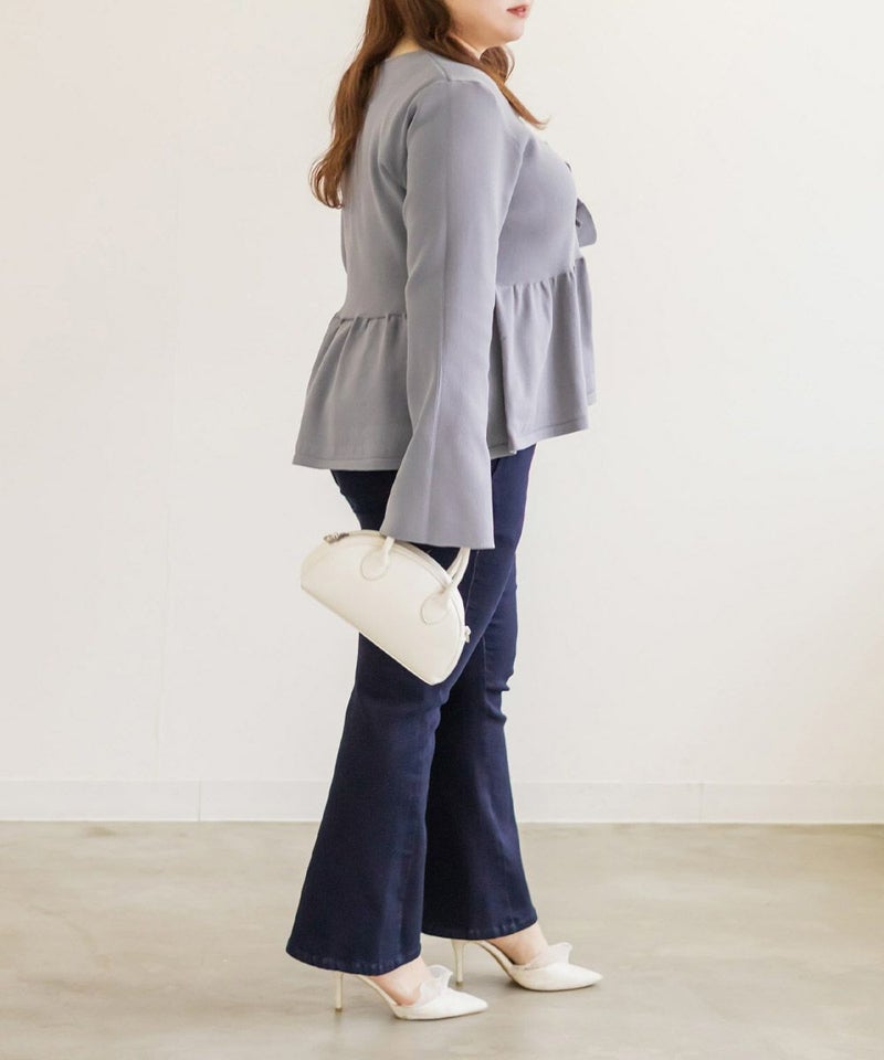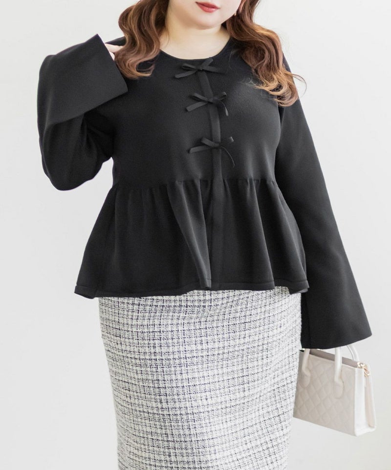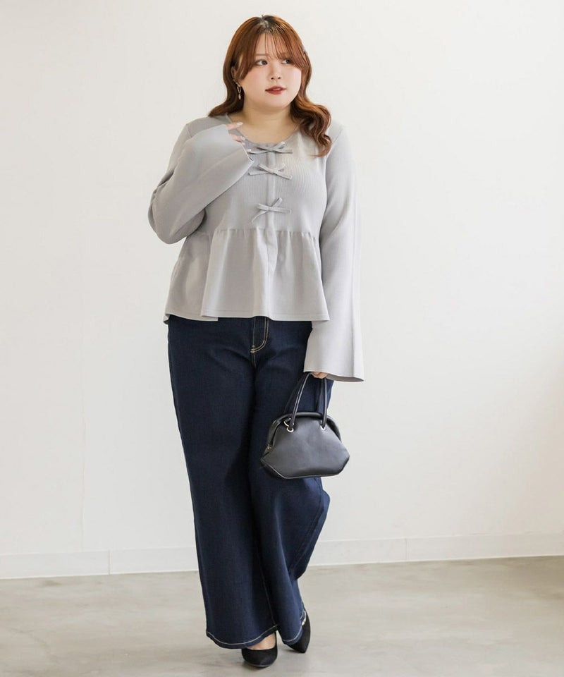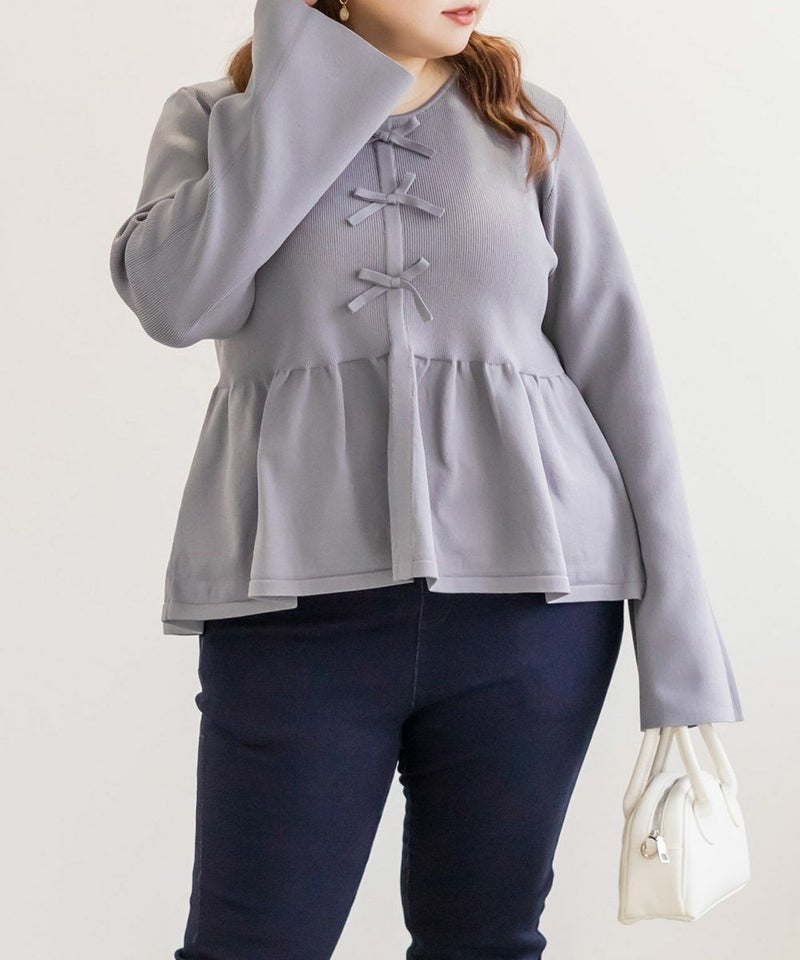 3Lを着てちょうどいいサイズでした。楽ちんな着心地でゆとりはあるのに、ペプラムシルエットで着やせができます◎軽いスポンジニットなので伸びも良くストレス無く着られました♪すっきりおしゃれにまとまる大人っぽいデザインで、フロントのリボンがさりげなくフェミニンな要素をプラスしてくれます!リボンは共地なので主張しすぎないのが嬉しいです。長めのフレアスリーブなので腕が綺麗に見えるのもポイント高いです!デニムやカジュアルなボトムと合わせてもフェミニンにまとまります!