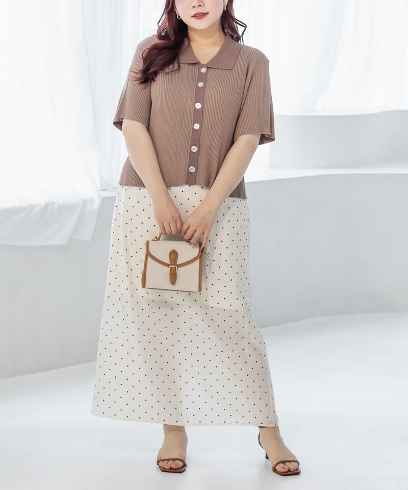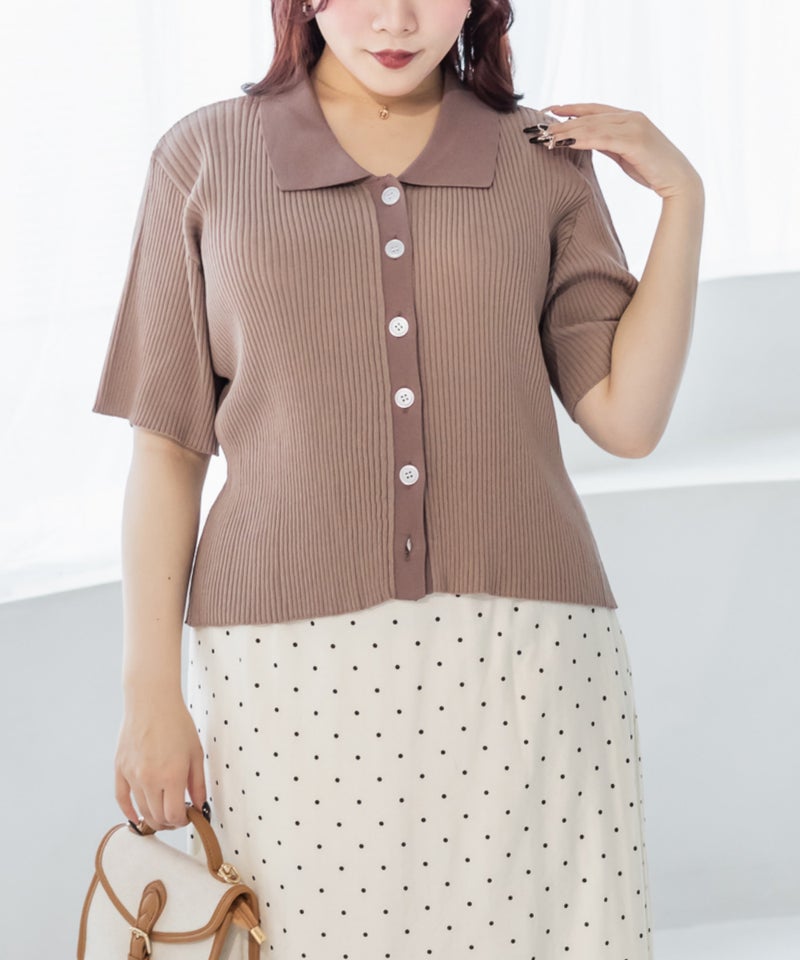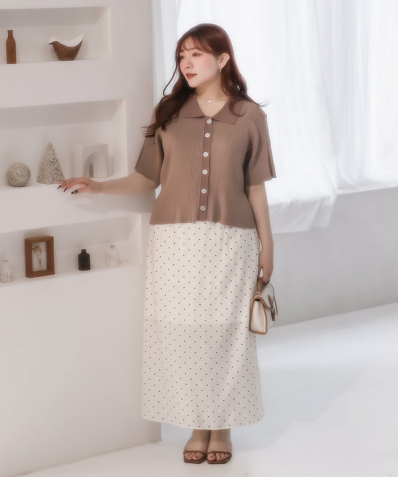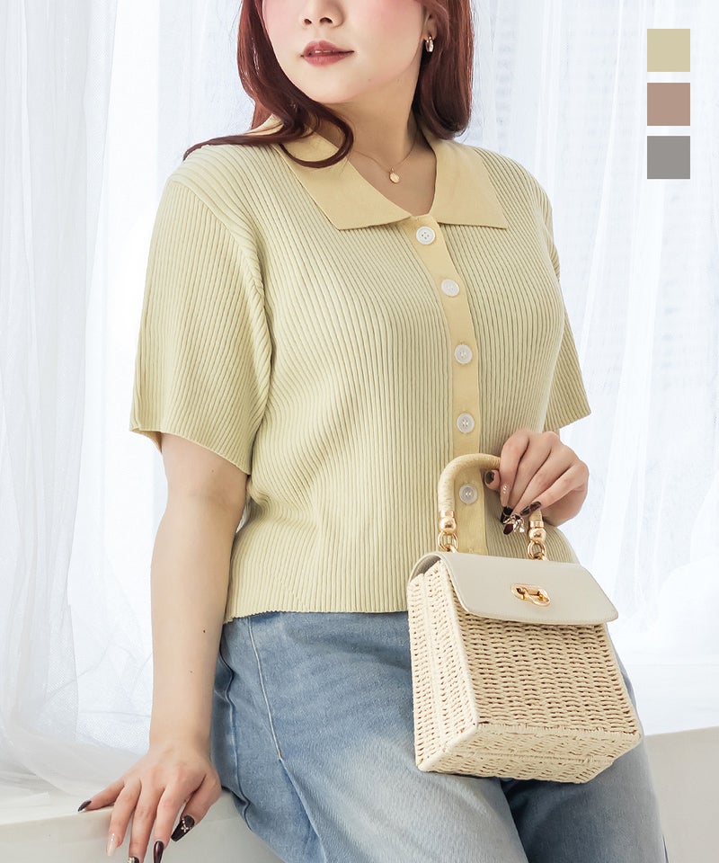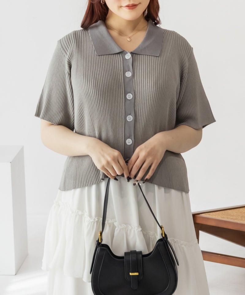 3Lを着てちょうどいいサイズ感でした。全体的に程よくゆとりのあってニットだけどピタッとせずに着られました。こなれ感をプラスしてくれる襟付きニットで、オンオフにも使える大人っぽい印象なのが嬉しい!襟とボタンのラインの配色が視覚的にメリハリのある印象ですっきり着こなせるのがポイント。襟が顔まわりをシャープな印象に見せてくれ、ボトムスにINした着こなしや、裾だしでももちろん着やすい着丈です!ボタンを開けて羽織としての着こなしもおすすめです。さらりとした軽やかな生地も魅力で、真夏でも使えるサマーニットです!裾のボタンを少し開けて抜け感を出す着方が今っぽくて可愛いです!