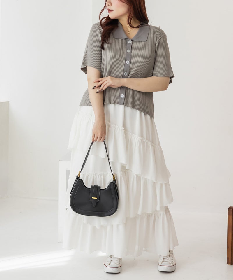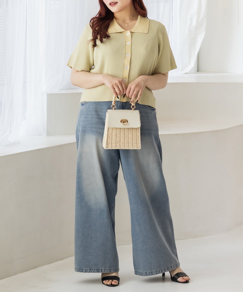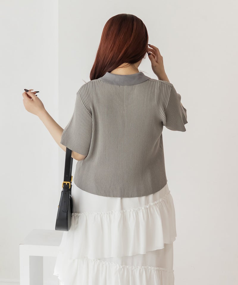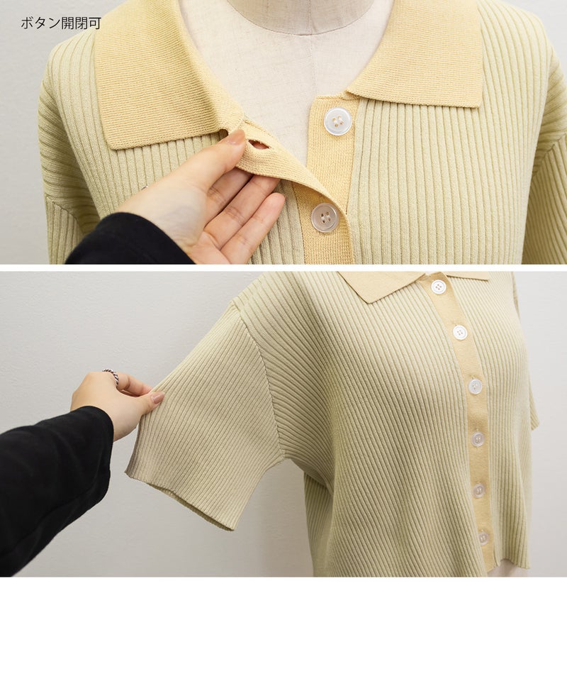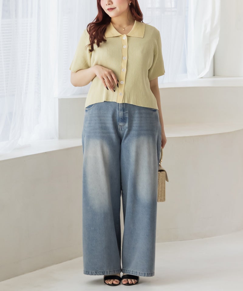 3Lを着てちょうどいいサイズ感でした。全体的に程よくゆとりのあってニットだけどピタッとせずに着られました。こなれ感をプラスしてくれる襟付きニットで、オンオフにも使える大人っぽい印象なのが嬉しい!襟とボタンのラインの配色が視覚的にメリハリのある印象ですっきり着こなせるのがポイント。襟が顔まわりをシャープな印象に見せてくれ、ボトムスにINした着こなしや、裾だしでももちろん着やすい着丈です!ボタンを開けて羽織としての着こなしもおすすめです。さらりとした軽やかな生地も魅力で、真夏でも使えるサマーニットです!裾のボタンを少し開けて抜け感を出す着方が今っぽくて可愛いです!
