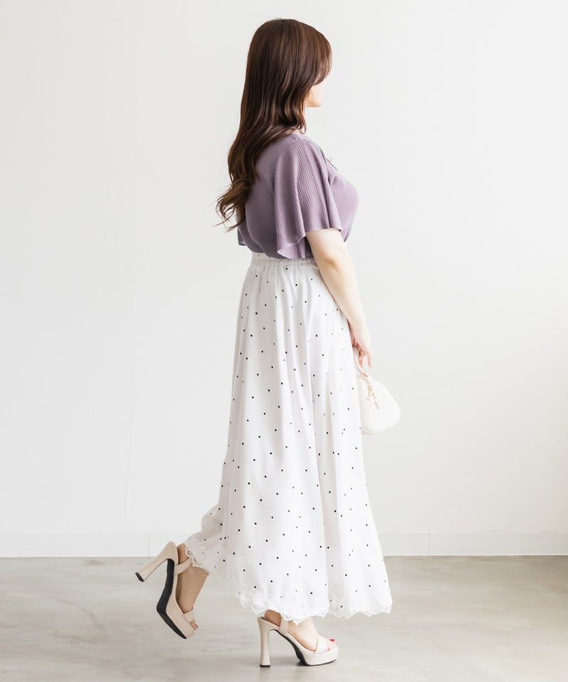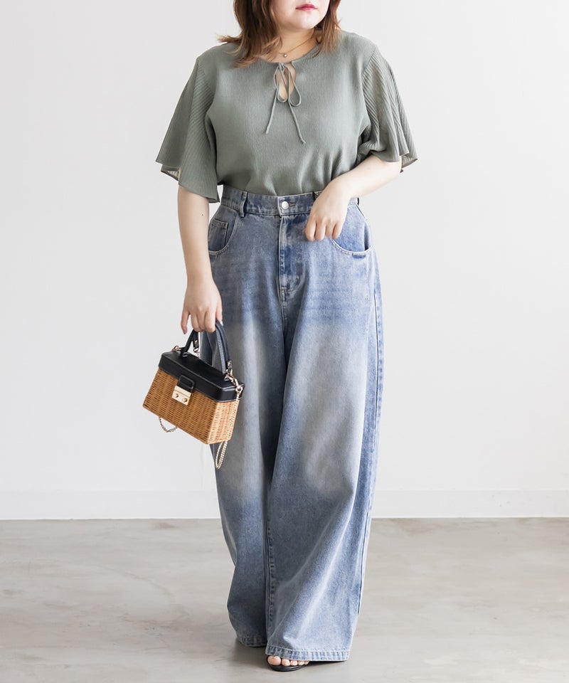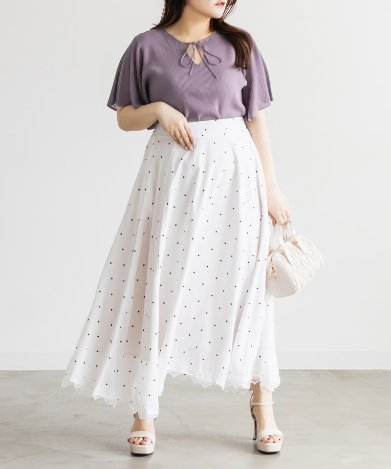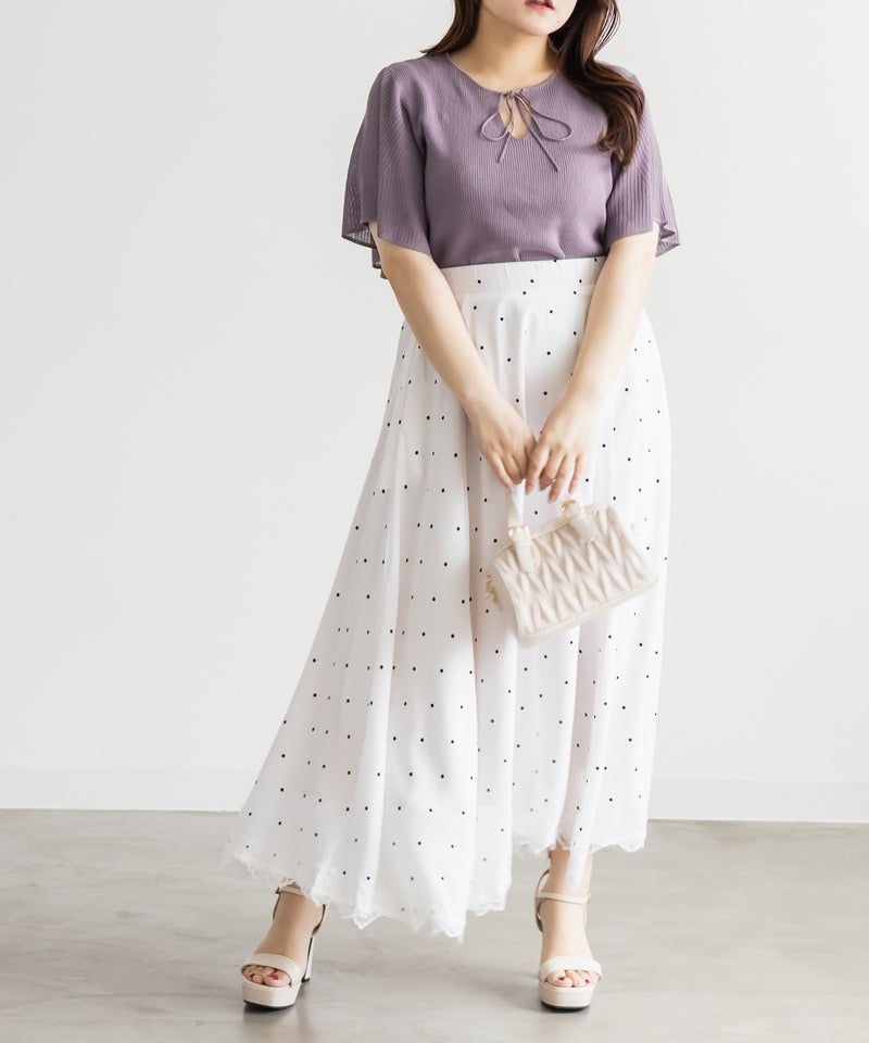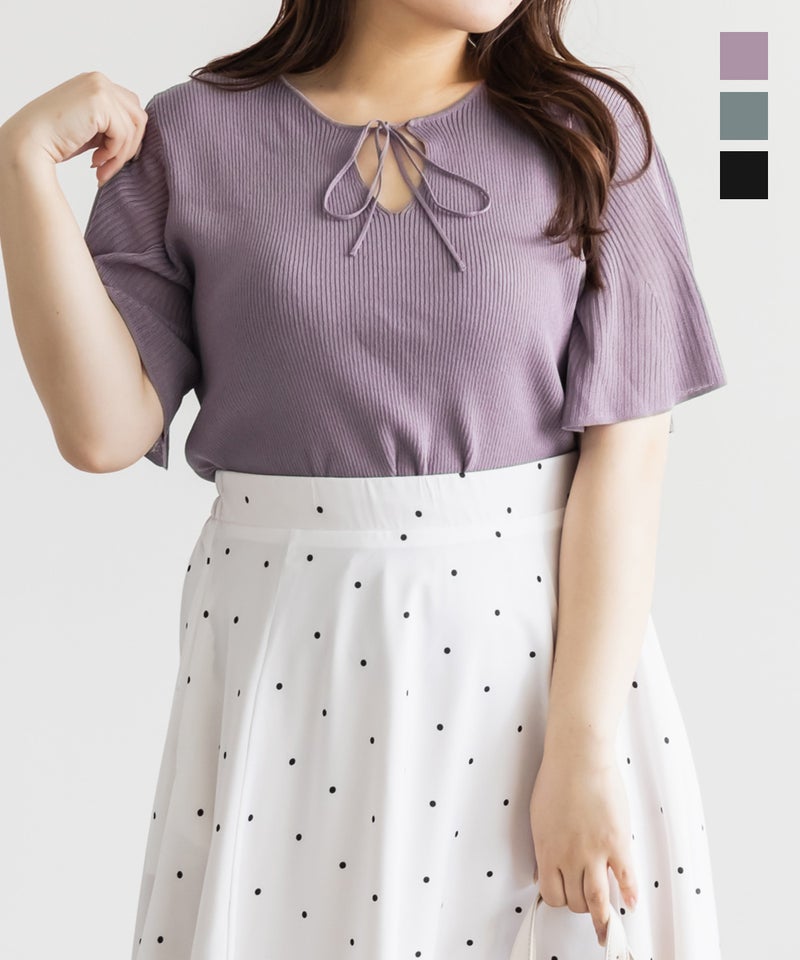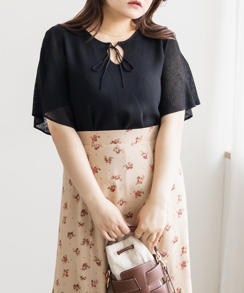 LLサイズを着用してちょうどいいサイズ感でした!肩まわりや身頃は程よくフィットしつつも窮屈感がなく、ニットも薄手で柔らかくチクチク感なく快適に着られる着心地でした◎フレア袖がふんわり広がって華やかな印象に見せてくれて、気になる腕まわりもさりげなくカバーしてくれます♪リボンネックのデザインが顔まわりのアクセントになって、1枚でしっかり着映えするのが嬉しいポイントでした!きれいめにもカジュアルにも着回ししやすい一枚です。
