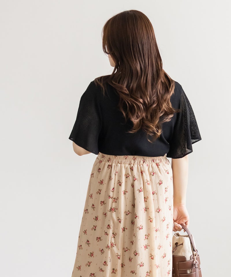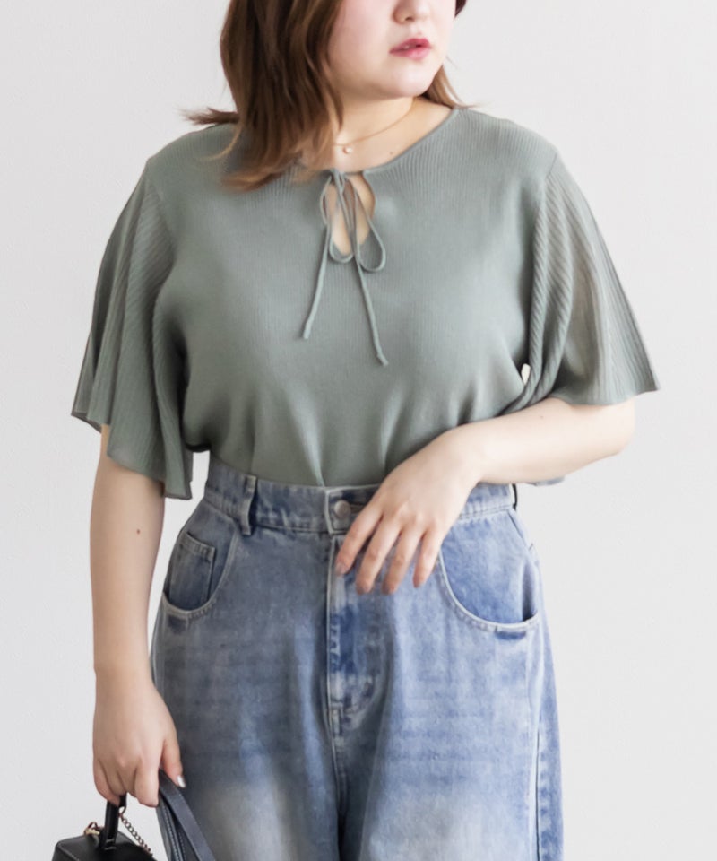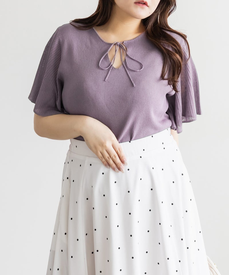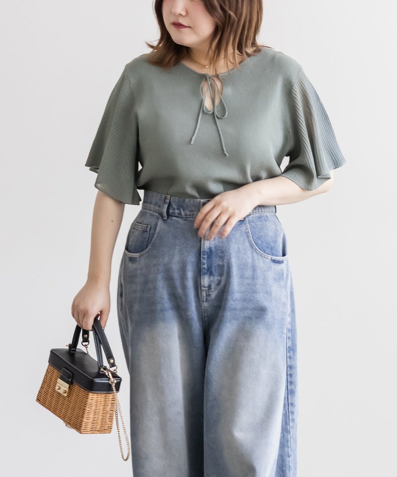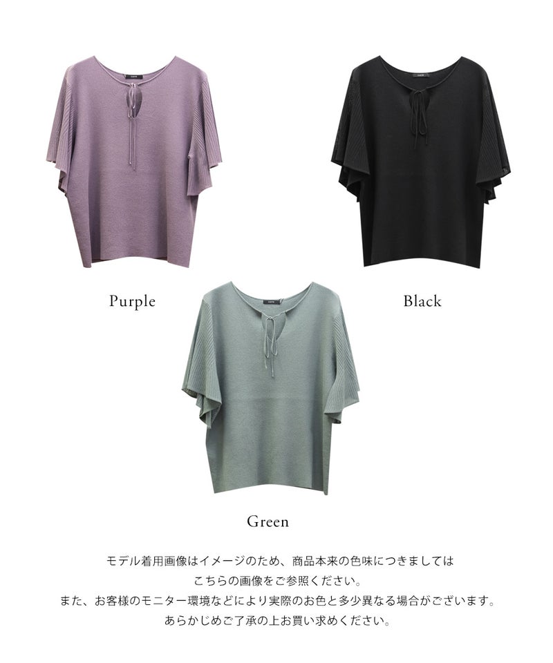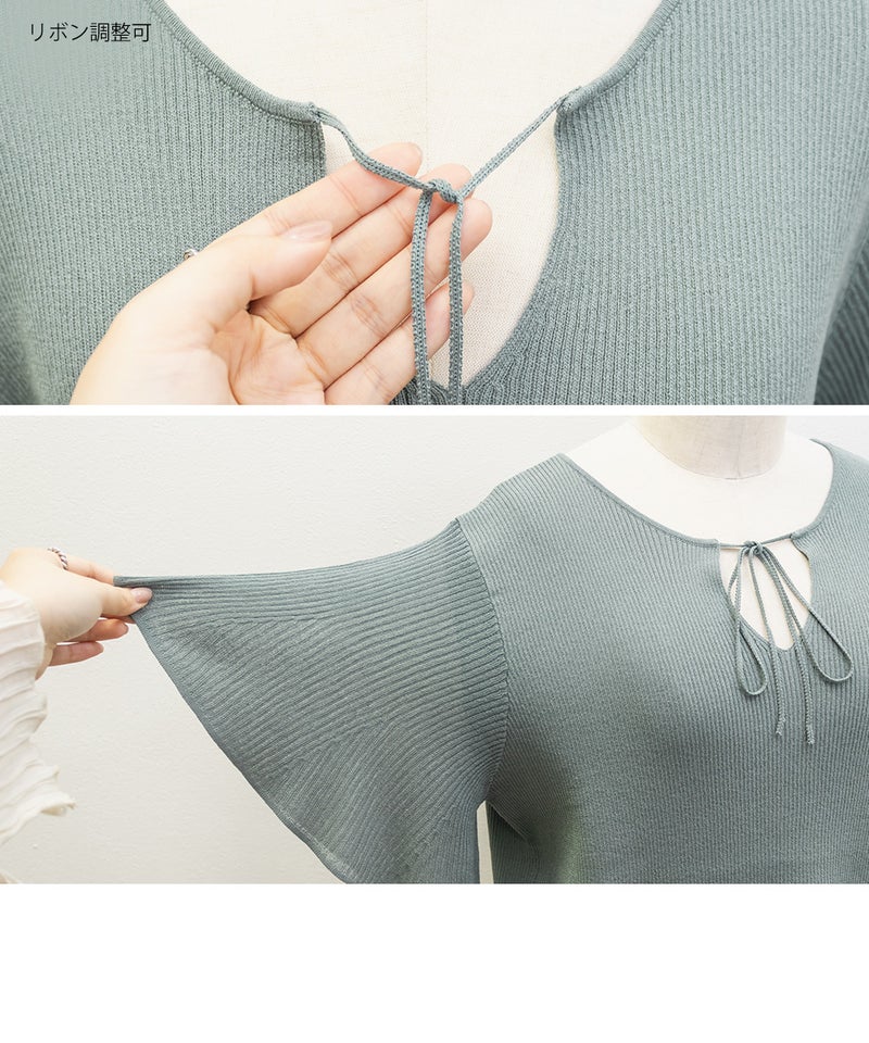 【design】少し透け感のあるフリル袖がすっきりと女性らしい印象を与えるサマーニット。胸元の華奢なリボンデザインもポイント。【material】夏でも涼しく快適に過ごせるサマーニット素材。