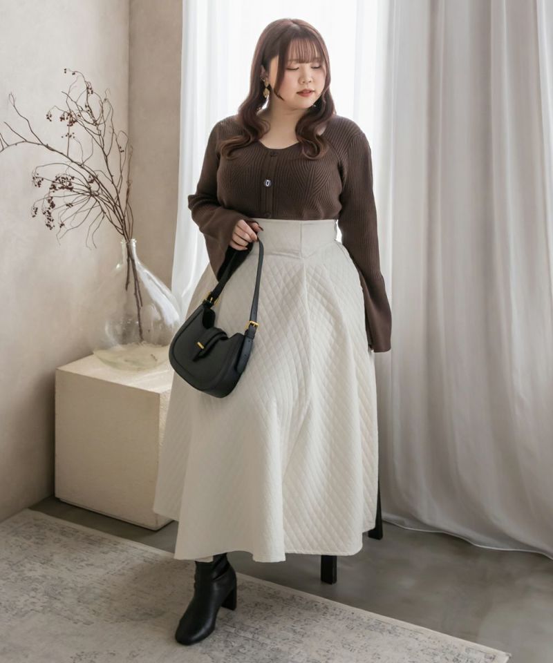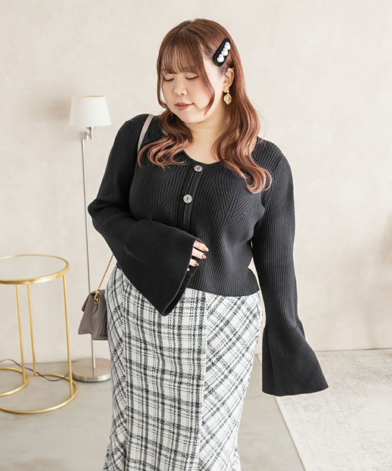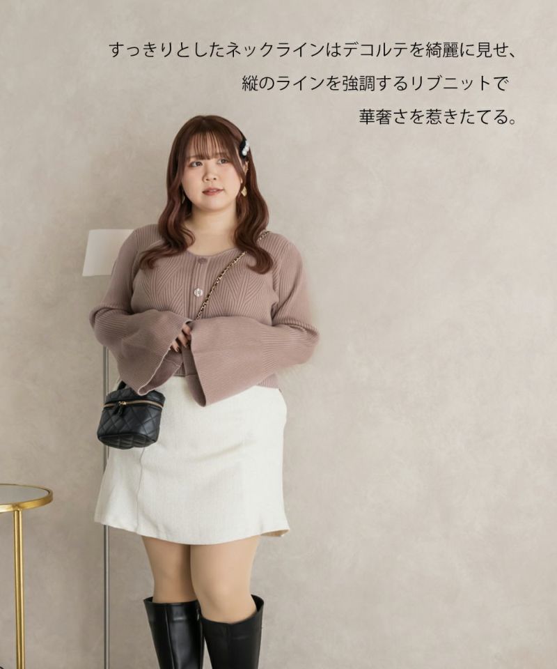 3Lを着てちょうどいいサイズでした。伸縮性のあるニットなのとピタッとしすぎないサイズ感だったのでらくちんでした!襟まわりはすっきり開いていてデコルテが綺麗に見えて女性らしい印象です◎フレア袖が手元もお洒落で大人っぽい印象にしてくれて美しく華奢に見せてくれます♪女性らしさたっぷりな印象になれる大人可愛いデザインです!ちょうどよい着丈だから、裾を出した状態でバランスよく着られて、スタイルが良く見える1枚です!