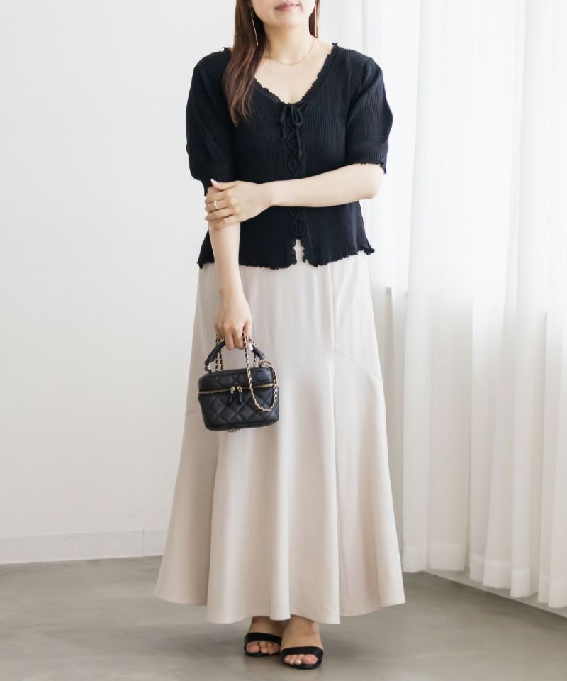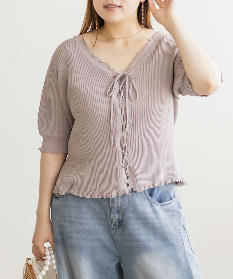 3Lサイズを着用して、ちょうどいいサイズ感でしたゆとりを持たせたサイズ感で、リブの伸縮性があるのでストレスフリーな着心地◎シャリ感のある薄手のサマーニットなので真夏でも着ていただけます!フロントのレースアップデザインがアクセントになって、シンプルすぎない華やかさがある1枚です。袖の長さも肘にかかるくらいで、二の腕も自然にカバーしてくれるのが嬉しいポイント!デニムやスカートにも合わせやすく、デイリー使いにぴったりです!