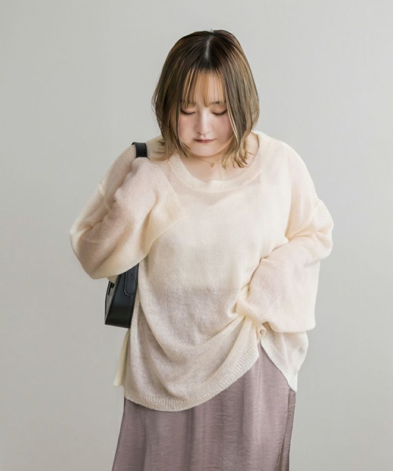 LLサイズを着用して丁度いいサイズでした。ゆるっと着られるサイズ感で楽だしとってもかわいいです♪シアー感が今っぽくて絶妙な抜け感が大人っぽい1枚です。ネックラインはすっきり開いていて、詰まった感じが無く綺麗なデコルテにしてくれます。洗練されたスタイルにぴったりなオトナっぽニットで、1枚でももちろん重ね着したりして秋~春と長く使えるのもポイントです。薄手のシアーニットなので、ごわつかず、タックインしても着やすい印象です!