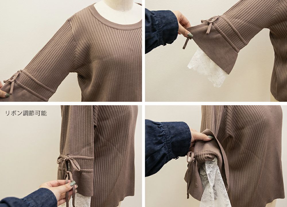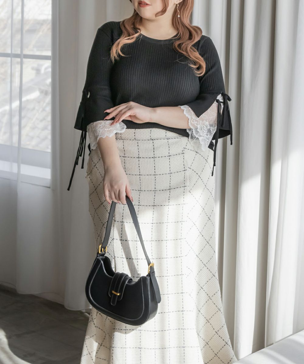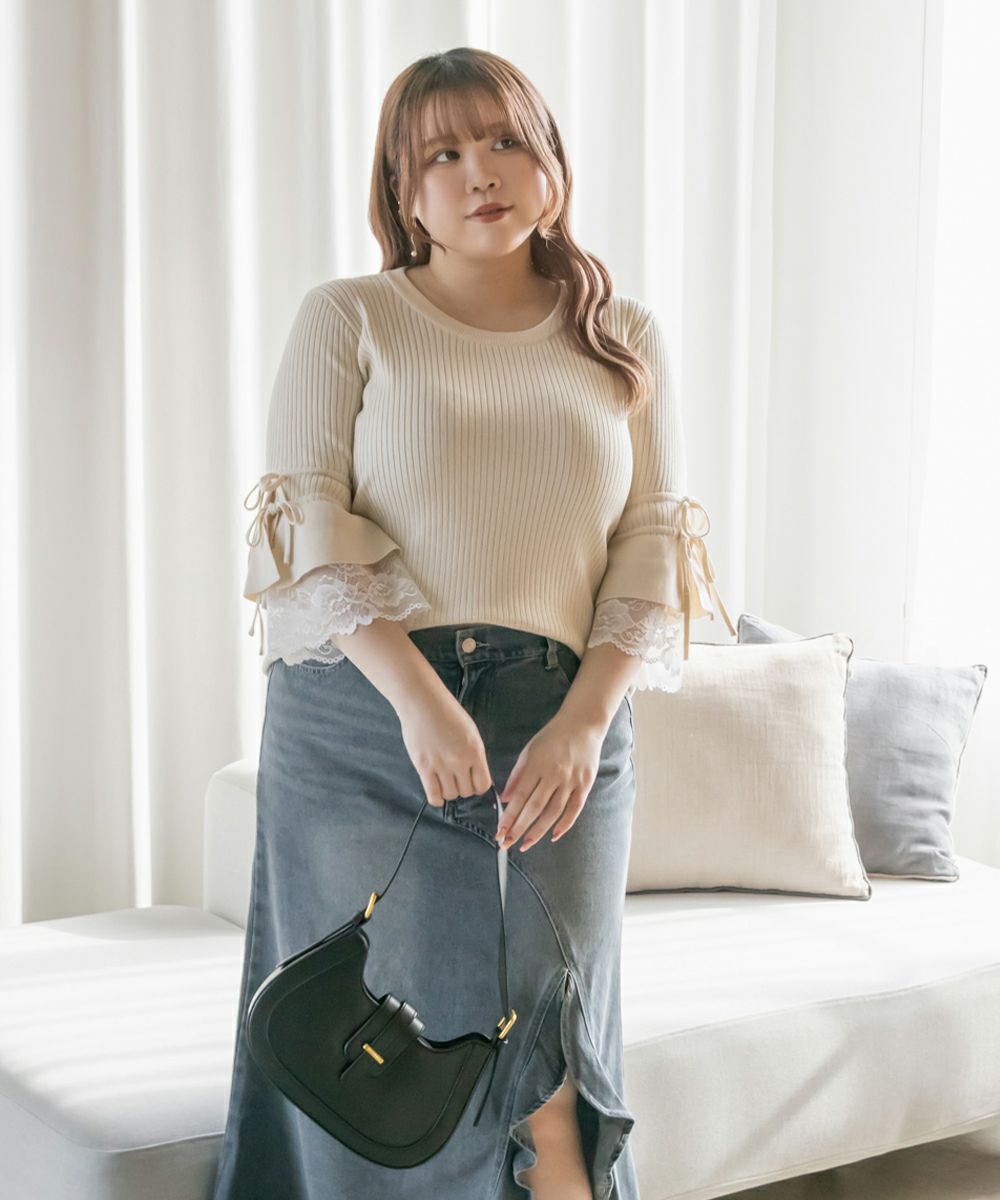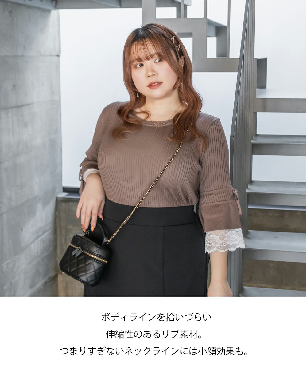 3Lサイズを着用してちょうどいいサイズ感でした。伸縮性の良いニットで着心地ラクチンでした◎リブニットなのですっきりとした印象だし、少し凹凸感もあるのでボディラインを拾いにくいのもポイントです。袖にレースとリボンがついていてとっても可愛いです♪トップスとして1枚で着てもいいし、首元などはシンプルなのでキャミワンピなどど重ねてもいいと思います!7分袖くらいなので手首に抜け感があって野暮ったくならずに着用出来ました!春にピッタリのフェミニンなニットプルオーバーです。