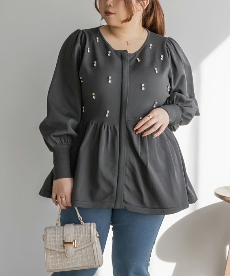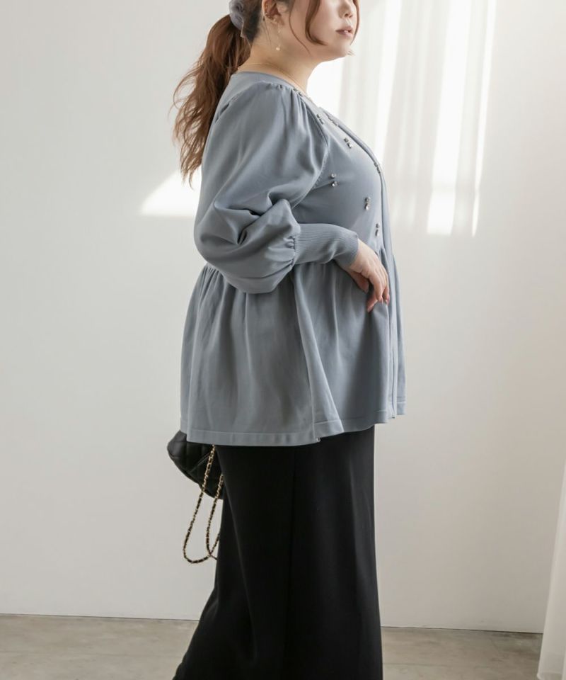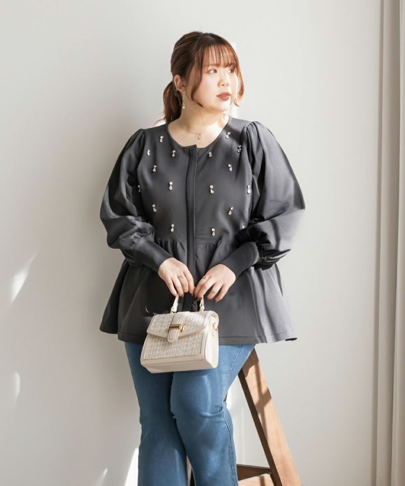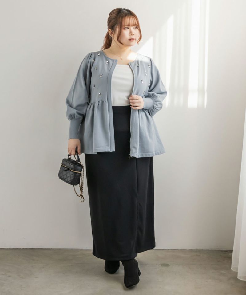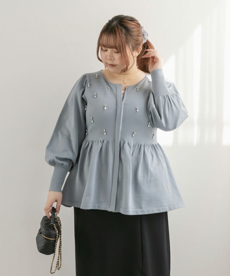 3Lを着てちょうどいいサイズでした。着やせ効果抜群のペプラムシルエットですっきりと華奢に見えました!軽くてらくちんなスポンジニットは、毛玉になりにくいし、暑くなりすぎないので秋冬春のロングシーズン着回しできるのも嬉しいです♪ジップだから開けても可愛く着用出来ました!何より胸元にビジューがあしらわれていてとってもかわいく華やかな1枚です。アクセなしでも上品になれます◎二の腕が細く見えるぽわんとしたお袖なのも嬉しいです!パンツやコンパクトなシルエットのスカートと合わせるのがお勧めです♪