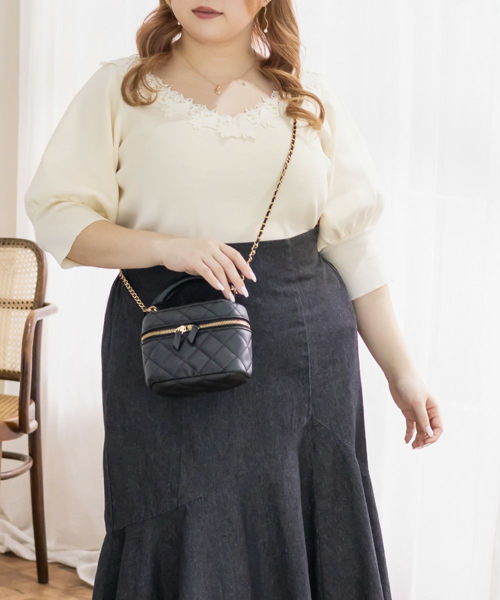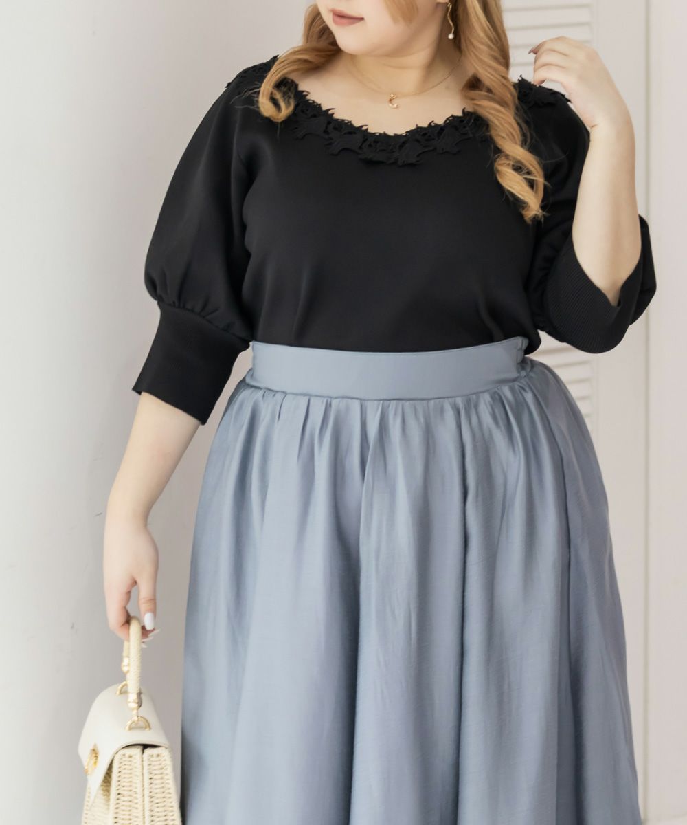 3Lを着用して丁度いい着心地でした。程よくゆとりがあってボディラインをカバーしてくれます。ネックのレース使いが上品で女性らしい印象の6分袖ニットで、肘まで隠れる袖丈が嬉しいです♪シンプルながらも華やかさをプラスしてくれるデザインです。軽くてお手入れが楽なスポンジニット素材で着心地も良く、6分袖なのでロングシーズン活躍します◎1枚でさらっと着てもおしゃれに決まり、ボトムス次第でカジュアルにもきれいめにも着こなせます。
