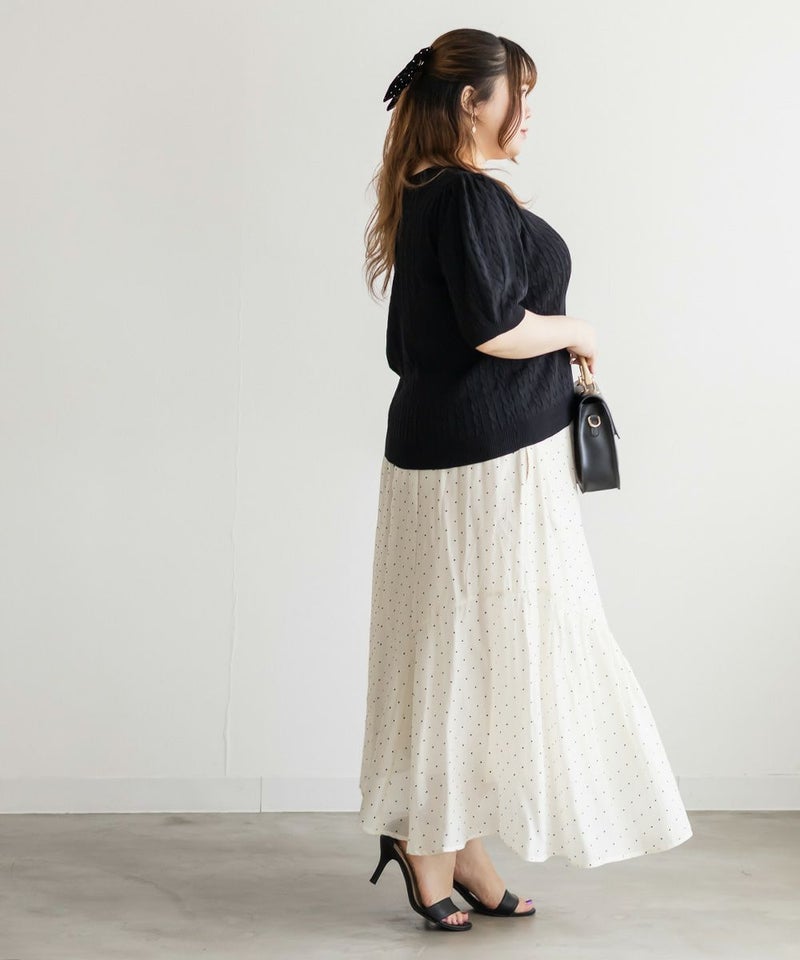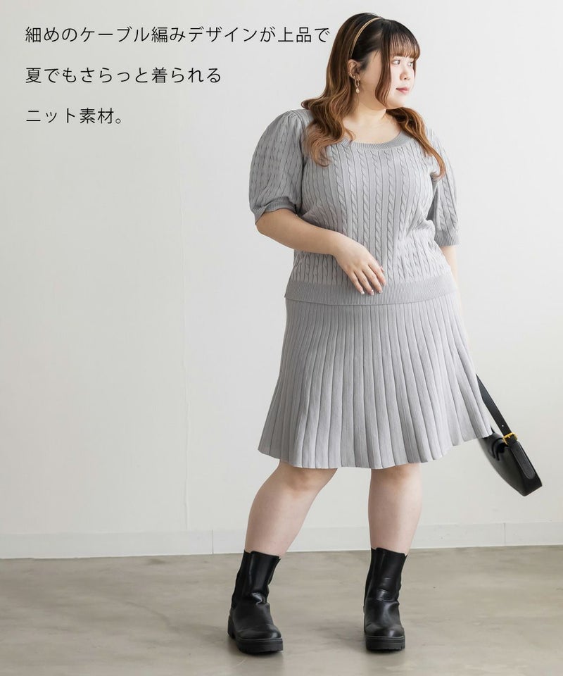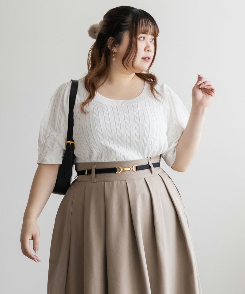 3Lを着てちょうどいいサイズ感でした。いつもどおりのサイズ選びで問題なさそうです◎伸びも良くて着心地が良いサマーニットです!縦のラインが強調されるケーブル編みがポイントで、今っぽい雰囲気のアイテムです。袖丈も短すぎず、ニットだけどピタッとしないのが嬉しいです!さらっと1Tシャツ感覚で着られて、デイリー使いはもちろん、きちんと感が欲しいシーンにもおすすめです♪韓国っぽいコーデにも、ワンピやジャケットなどののインナー使いにも着回し可能です!