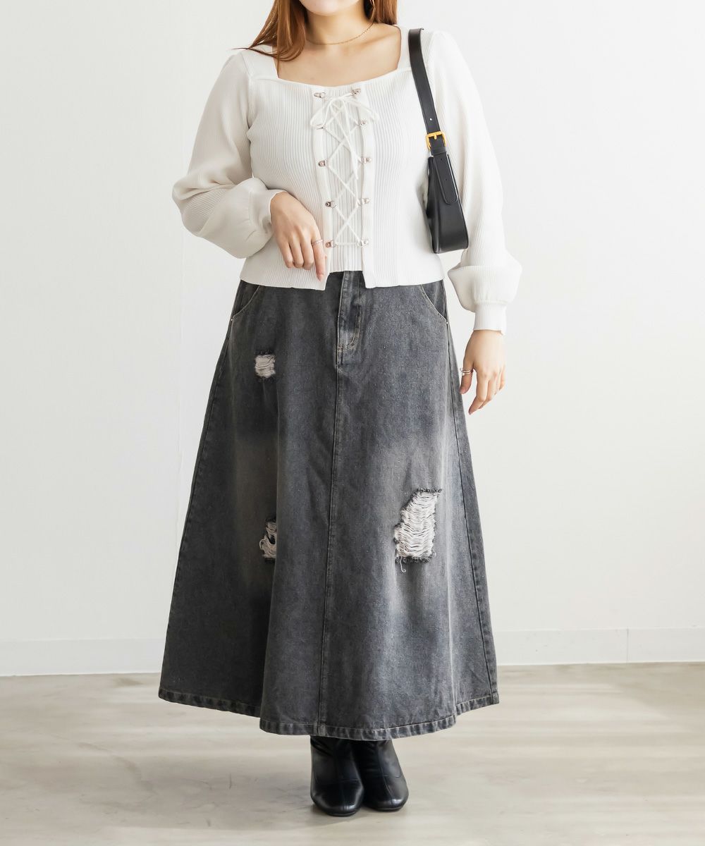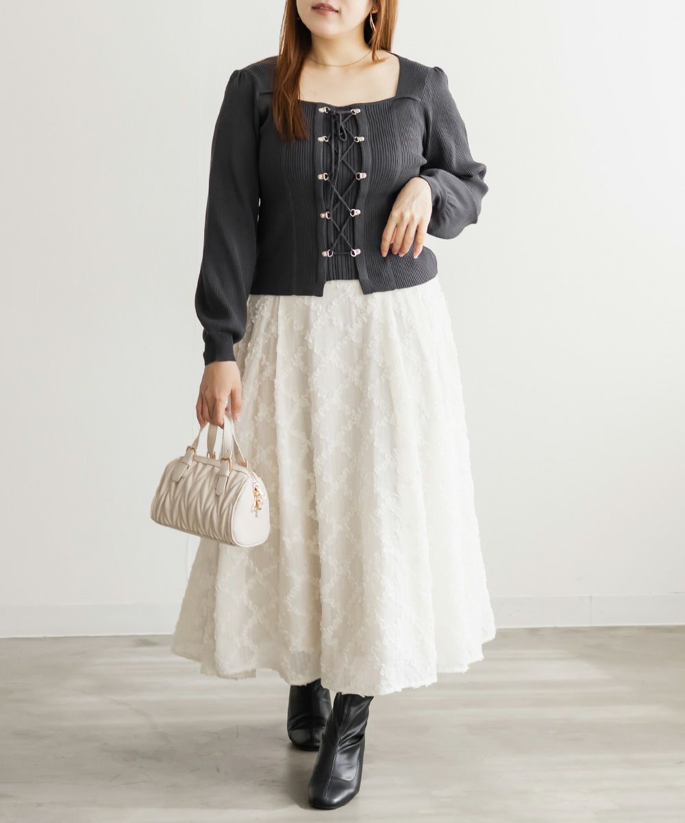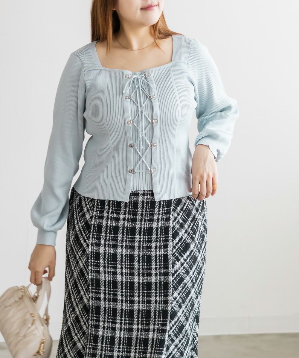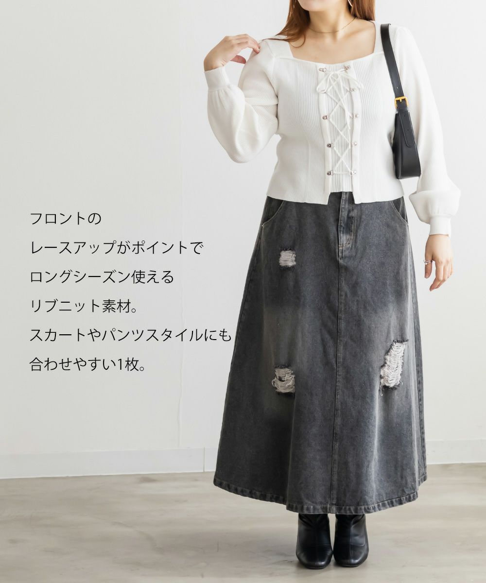 LLサイズを着用してジャストなサイズ感でした。フロントのレースアップが綺麗に出るようジャストで着るのがおすすめです◎すっきりシルエットのトップスですが少しシャリ感のある柔らかなニットで窮屈感なく着られました!レースアップがポイントで縦のラインが強調出来て着やせして見えます!丈感も絶妙でインしなくてもコーデしやすいのもポイントです!秋~春とながく使えるトップスなのであると便利な1枚です!
