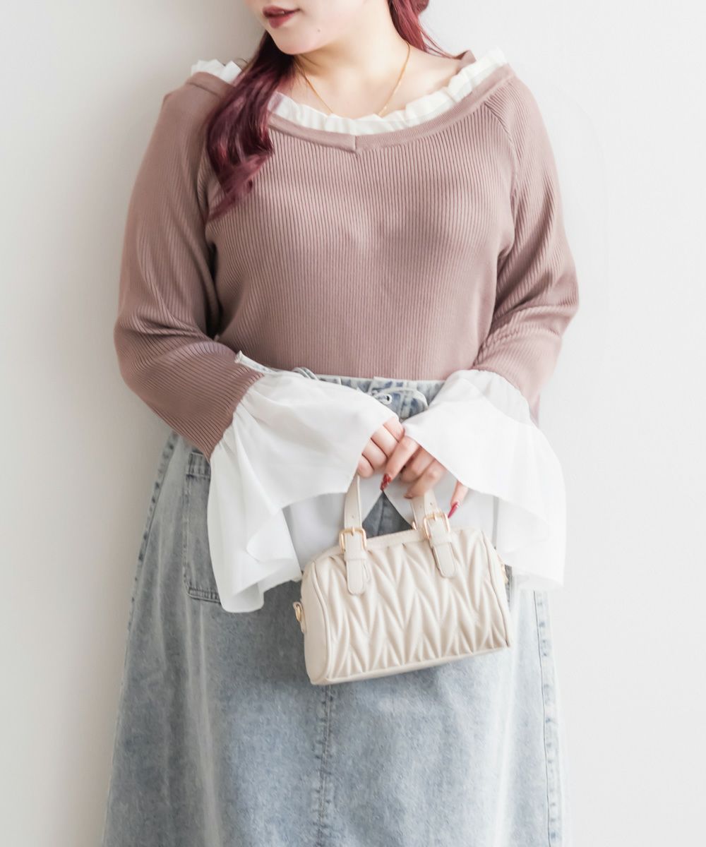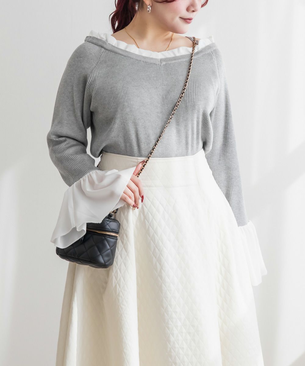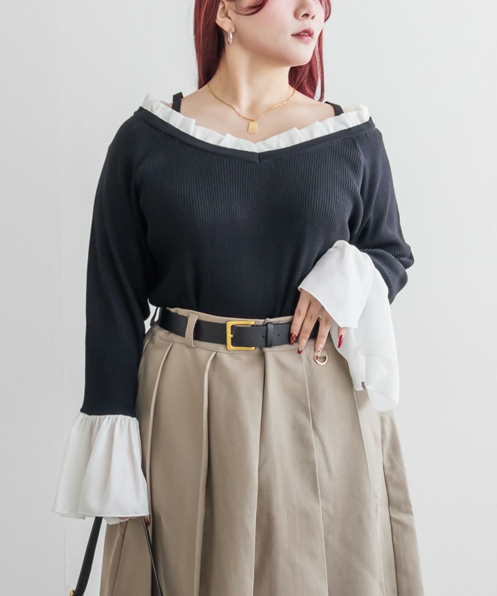 3Lを着て着用感はちょうどよく、ニット部分は伸びるので窮屈感なく楽に着られました。ジョーゼット生地のフリルをドッキングしたデザインが自然に視線を上に集めてくれて、顔回りを華やかに見せてくれます◎ 異素材切り替えでも甘くなりすぎず、大人っぽさが残るバランス感が◎ 1枚でスカート・パンツ合わせでも華やかに見えるのがポイントです♪ きれいめにもカジュアルにも使いやすく、オンオフどちらにも活躍してくれるニットだと思いました。