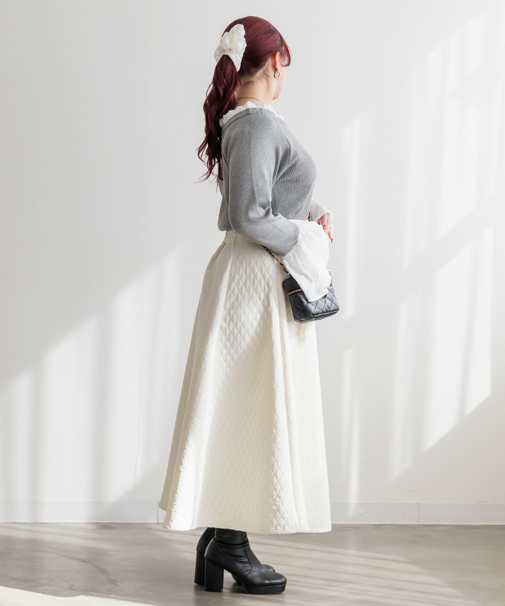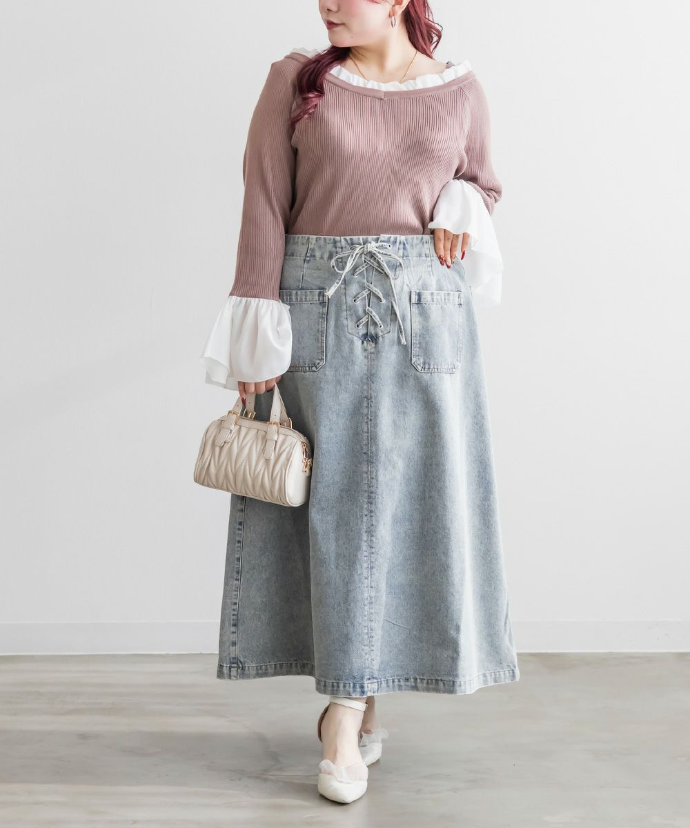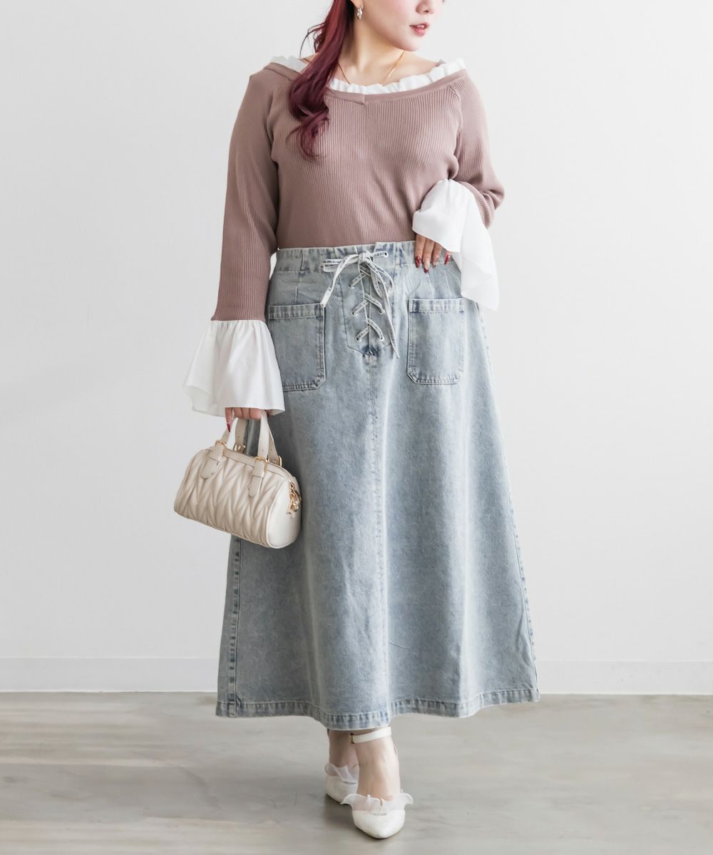 3Lを着て着用感はちょうどよく、ニット部分は伸びるので窮屈感なく楽に着られました。ジョーゼット生地のフリルをドッキングしたデザインが自然に視線を上に集めてくれて、顔回りを華やかに見せてくれます◎ 異素材切り替えでも甘くなりすぎず、大人っぽさが残るバランス感が◎ 1枚でスカート・パンツ合わせでも華やかに見えるのがポイントです♪ きれいめにもカジュアルにも使いやすく、オンオフどちらにも活躍してくれるニットだと思いました。