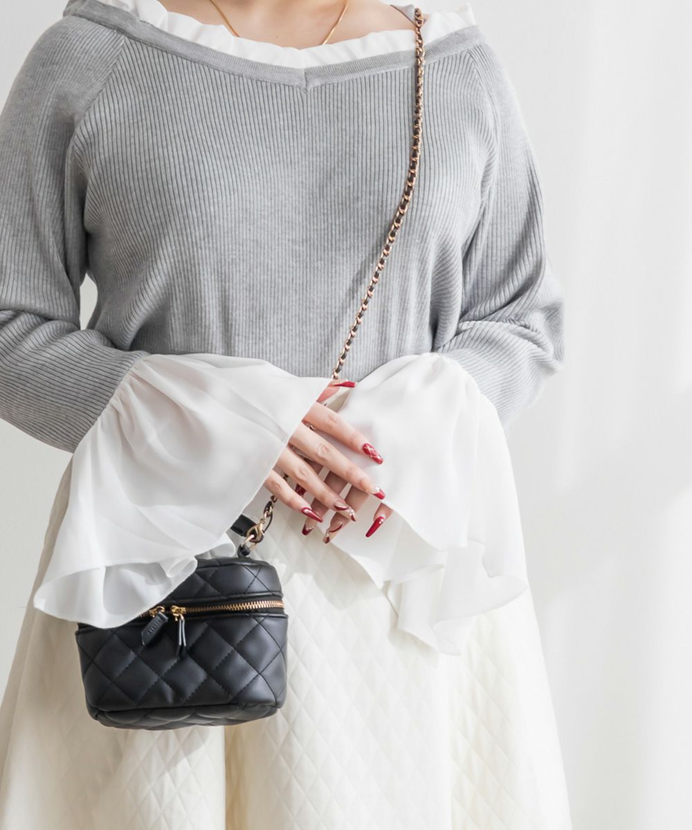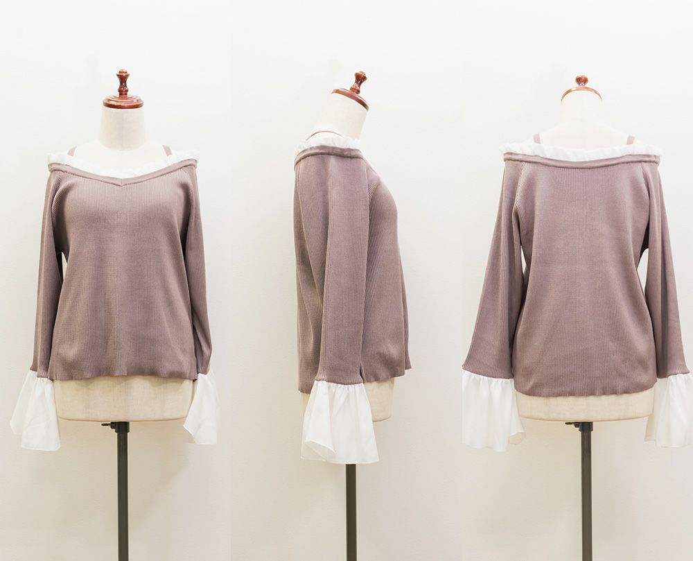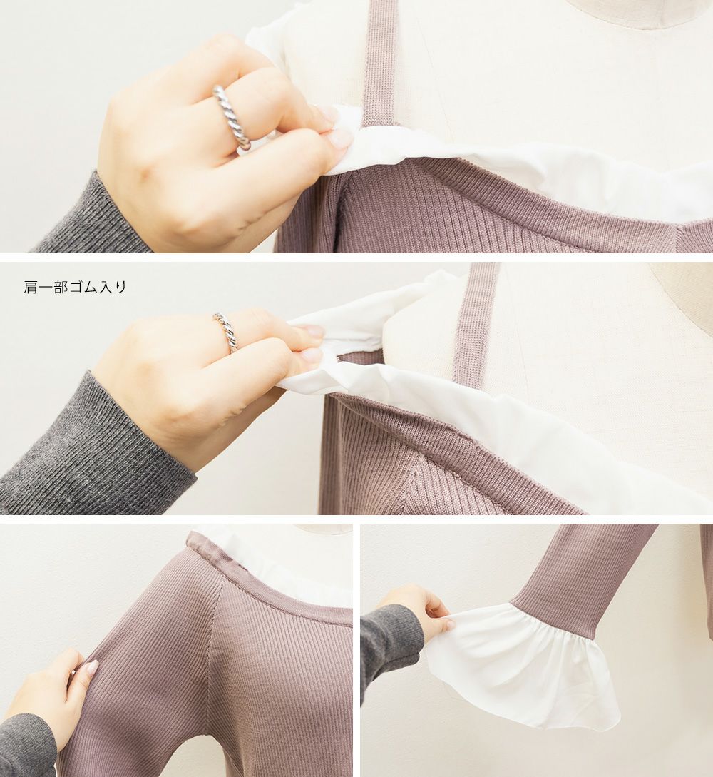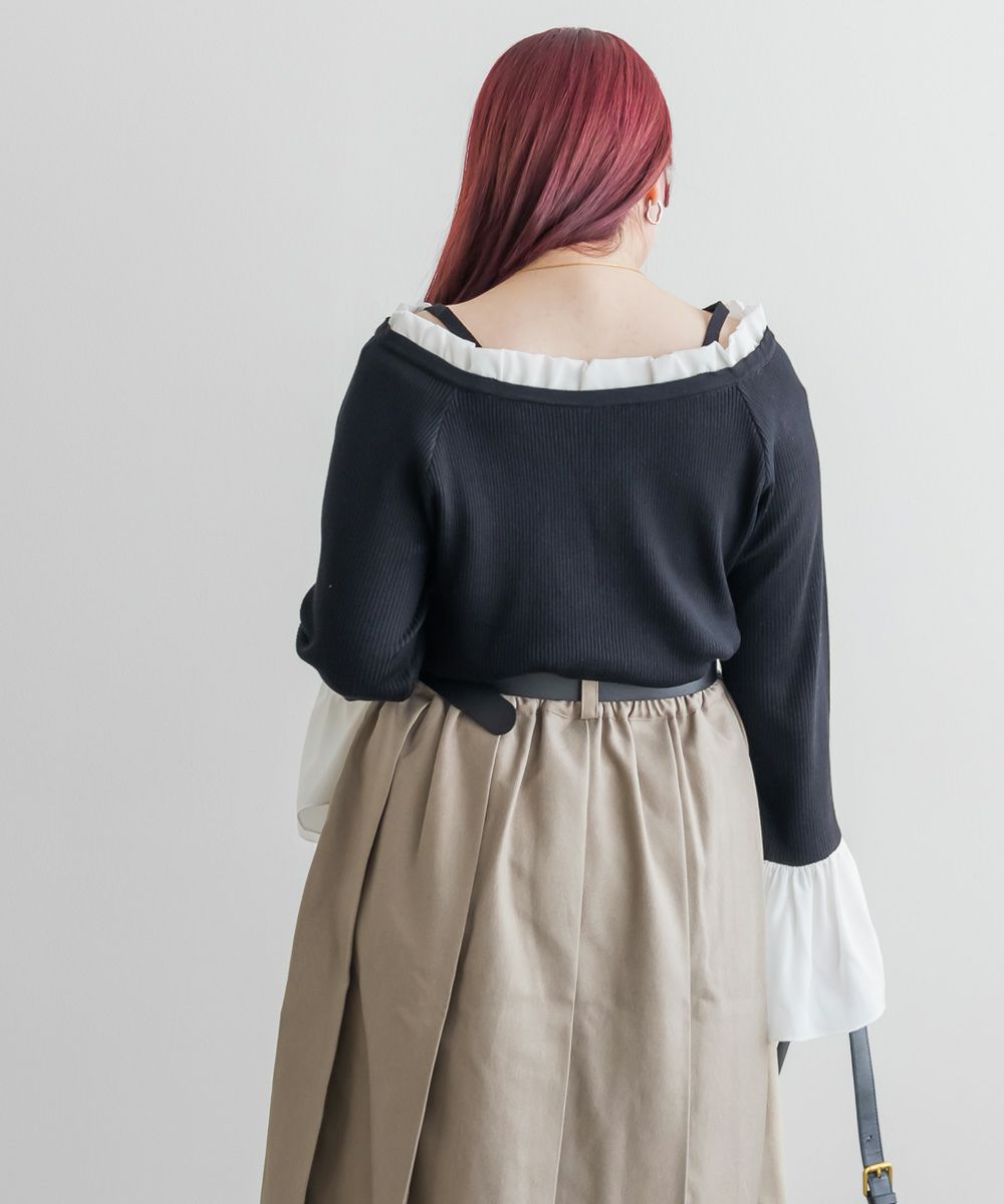 【design】襟元のフリルと袖のフレアがフェミニンなニットプルオーバー。デコルテを綺麗に見せるネックラインと程よくすっきりとしたシルエットで女性らしく着やせできる。袖口のニットと布帛のドッキング部分は伸縮できるから、腕まくりができて実用性があるのもポイント。【material】伸縮性ののあるリブニットに、襟/袖には落ち感のあるジョーゼット素材の布帛がドッキングされています。【styling】女性らしさたっぷりのデザインだから、甘すぎない小物やシューズ合わせがおすすめ。襟とフリルの白色配色でコーデを重くさせない抜け感のある印象に。