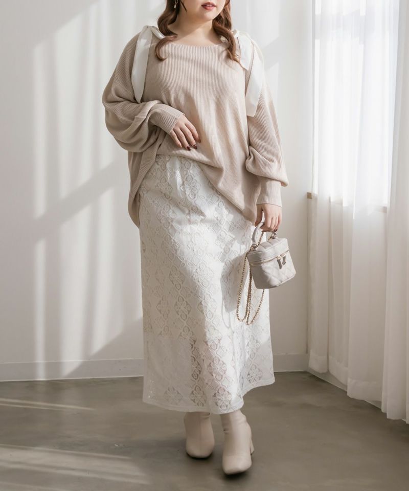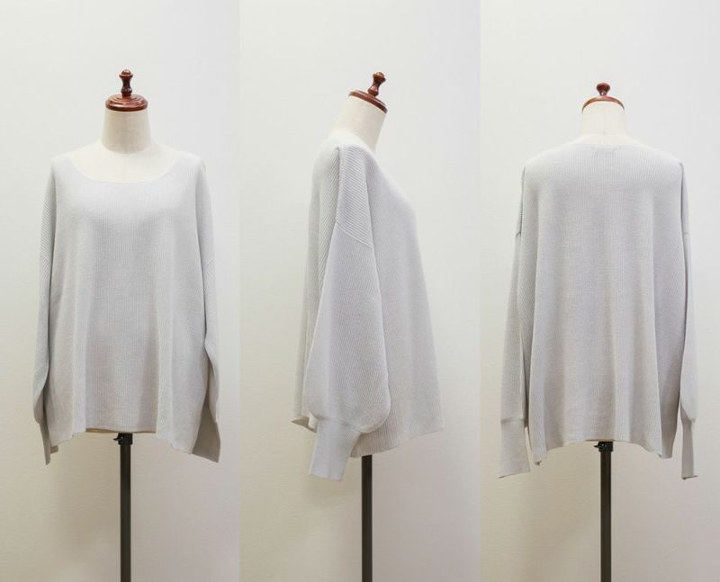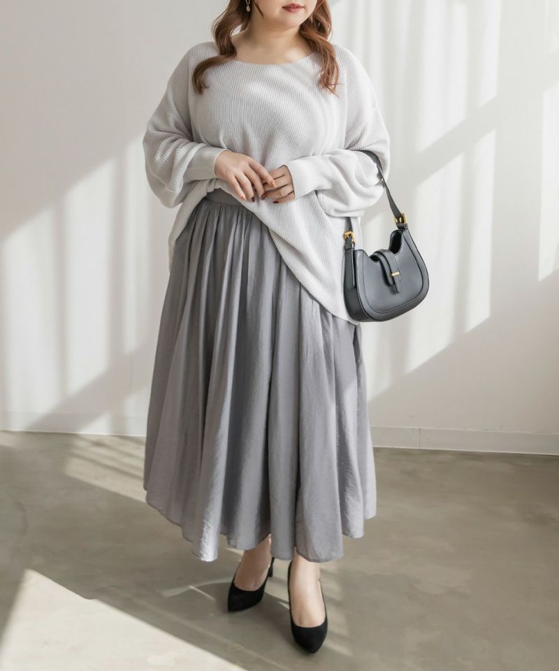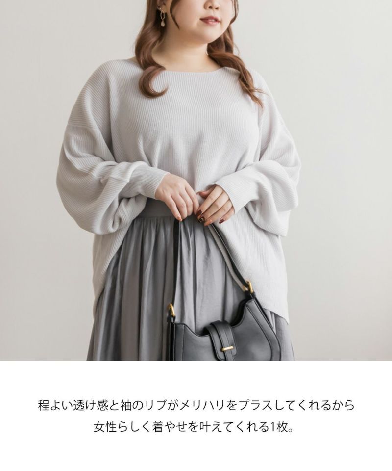 3Lサイズを着用して丁度いいサイズでした。ゆるっと着られるサイズ感で楽だしとってもかわいいです♪ネックラインはすっきり開いていて、大人っぽい抜け感が演出できるアイテムです。カフス部分はキュッとなっていてメリハリもある印象です◎洗練されたスタイルにぴったりなオトナっぽニットで、秋~春と長く使えるのもポイントです。厚みが少ないニットなので、ごわつかず、タックインしても着やすい印象です!