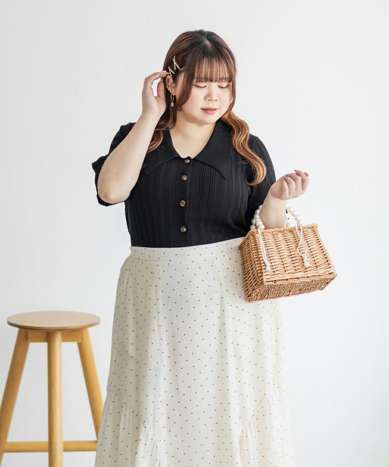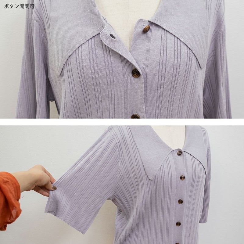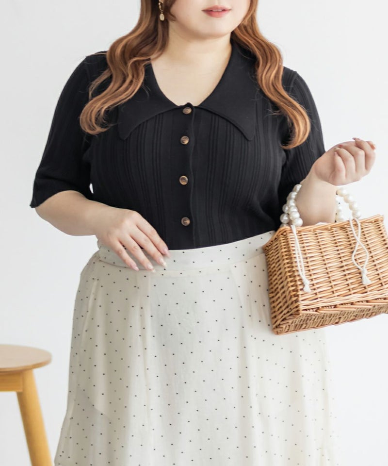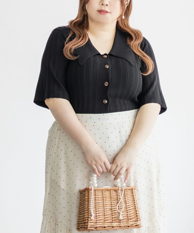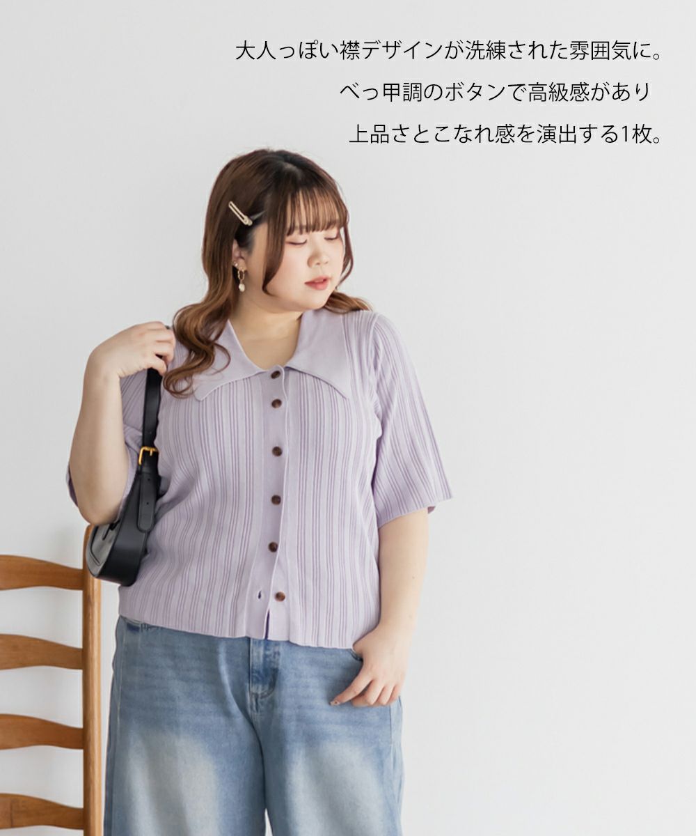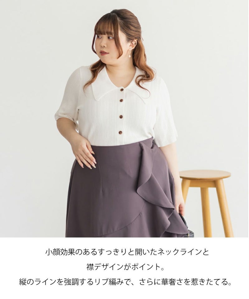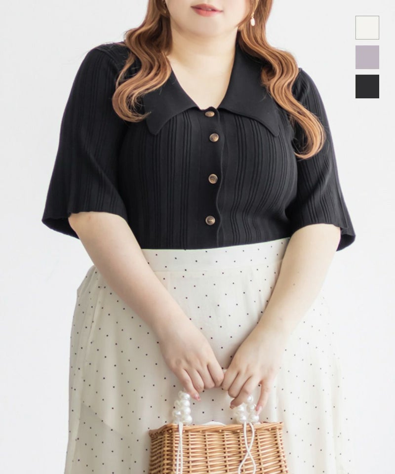 3Lを着てちょうどいいサイズ感でした。程よくゆとりのある袖周りがポイントで、ニットだけどピタッとせずに着られます◎こなれ感をプラスしてくれる襟付きニットで、オンオフにも使える大人っぽい印象なのが嬉しい!お仕事からデイリーまで幅広いシーンで着用いただけます♪襟が顔まわりをシャープな印象に見せてくれ、ボトムスにINした着こなしや、裾だしでももちろん着やすい着丈です!ボタンを開けて羽織としての着こなしもおすすめです。さらりとした軽やかな生地も魅力で、真夏でも使えるサマーニットです!ワイドパンツやフレアスカートなど、ボリューム感のあるボトムスとの合わせもおすすめで、コンパクトなサイズ感なのでジャケットのインナーとしても!裾のボタンを少し開けて抜け感を出す着方が今っぽくて可愛いです!