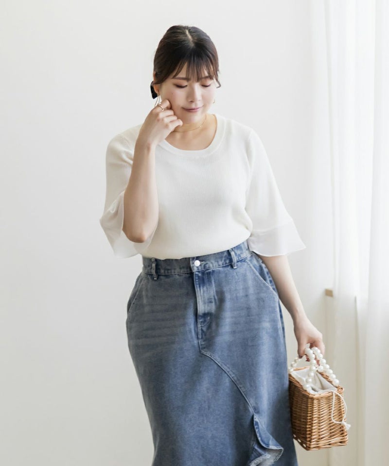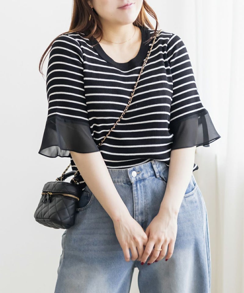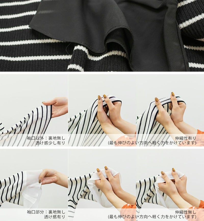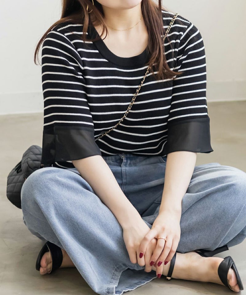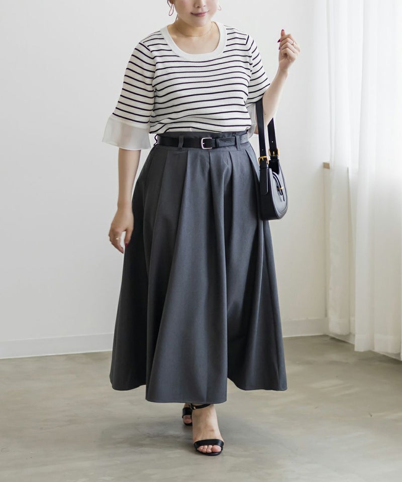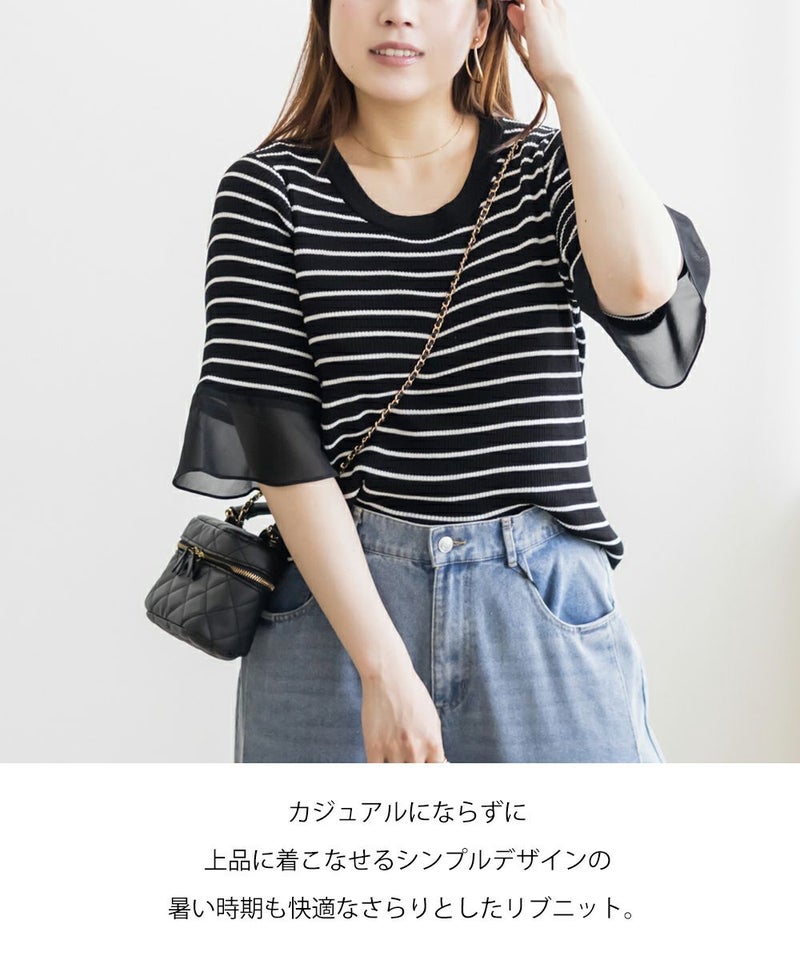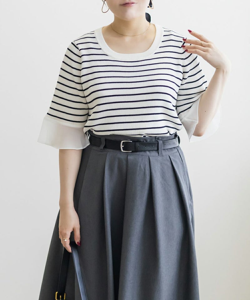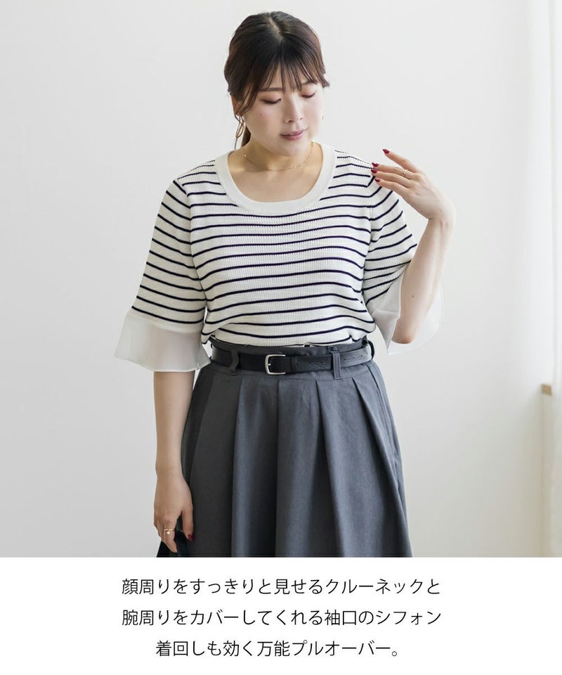 3Lを着てちょうどいいサイズでした。さらりとした夏向けのリブニットで、着ていても暑くない素材です◎伸縮性がしっかりあるのでストレスフリーな着心地で、顔回りも二の腕もすっきりと見えるデザインなのも嬉しいです!ボーダーはカジュアルになりがちな印象もあるけど、このニットは上品に、女性らしく着こなせました♪無地もあるので、好みのデザイン・雰囲気で選んでみてください◎パンツ、スカート、ワンピース、アイテムどんなアイテムともコーディネートしやすい便利なトップスです!