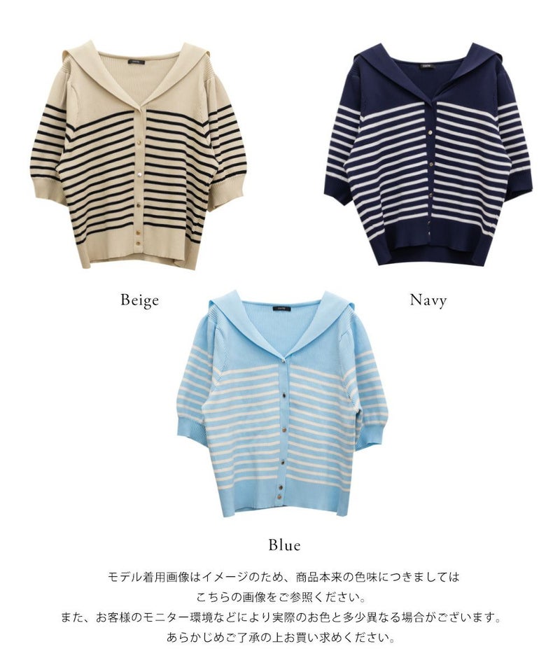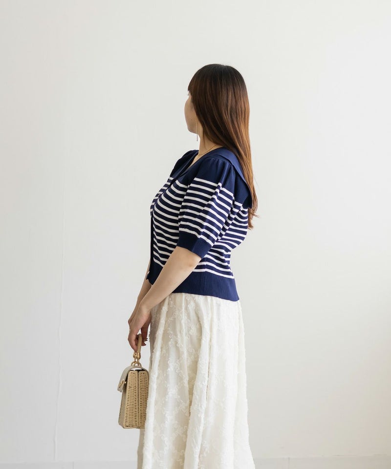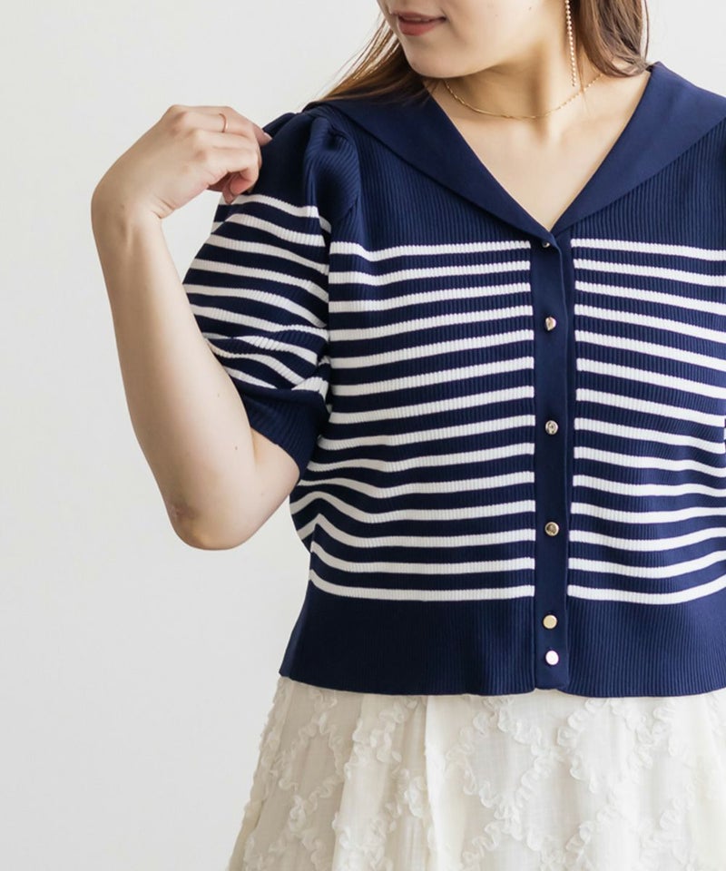3Lサイズで肩まわりや二の腕にも窮屈感なく、全体的にゆとりのあるリラックス感のある着心地です。軽いスポンジニットで真夏でも快適に過ごせそうです。セーラーカラーとボーダーの組み合わせがとっても可愛くて、着るだけで目を引きます!ボーダー柄が程よく存在感を出しながらも、配色が大人っぽくまとまっているので、甘くなりすぎずちょうどいいバランス。袖も長めで気になる部分をさりげなくカバーしてくれるのもうれしいポイントです。