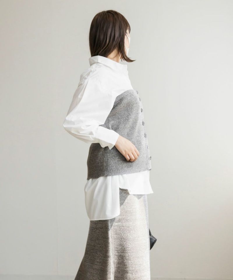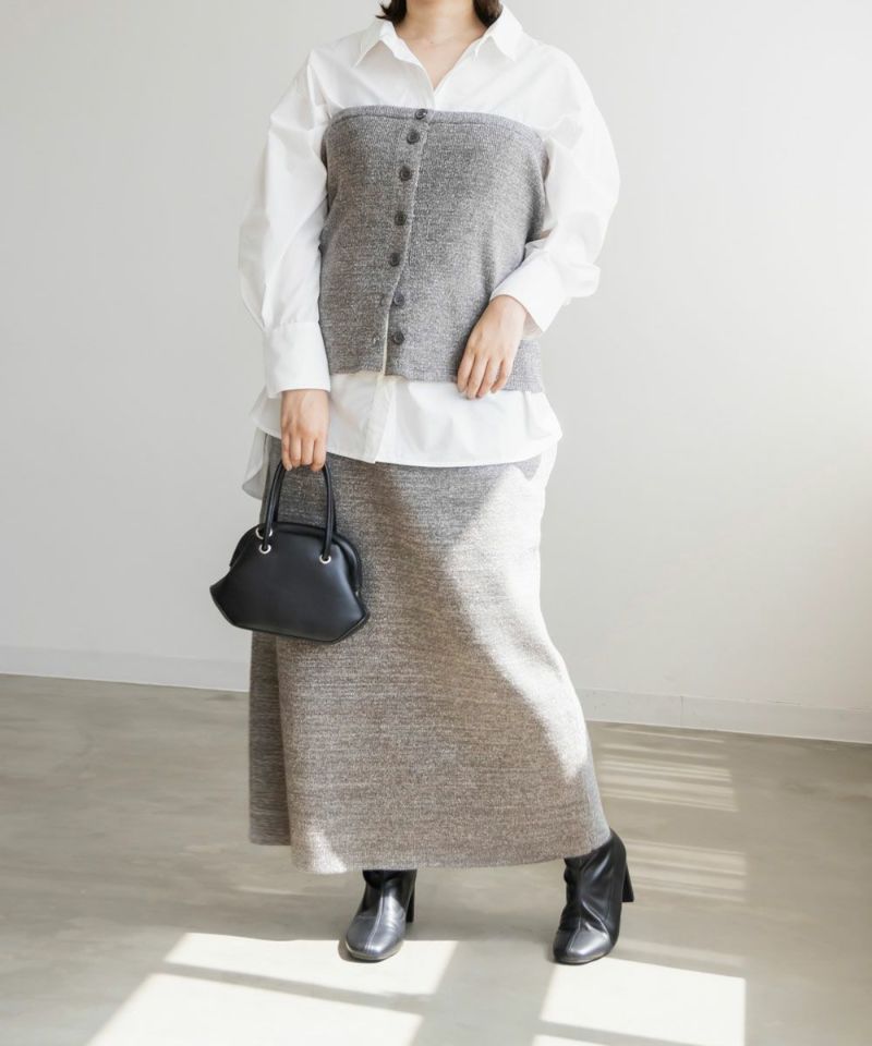 3Lサイズを着用してゆとりのあるサイズ感でした。窮屈感が無く、身体に密着しすぎず着用できる着心地でした。さりげないラメが入っていて主張しすぎずにコーデを格上げしてくれます!フロントのボタンが開閉できるニット素材のビスチェが今っぽく、季節初めから取り入れると秋冬のムードが楽しめる1着です。シンプルなTシャツや襟付きシャツに合わせるだけでこなれ感がでるお洒落なアイテムです◎同素材のスカートとセットで着用するのもお勧めです!