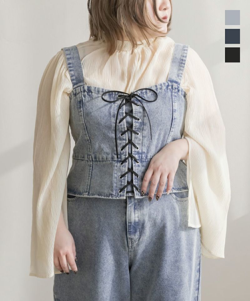 3Lを着てちょうどいいサイズでした!大きいサイズでこういったデザインのデニムビスチェはなかなかないので嬉しい1枚です!ボディラインを拾わないしっかりとしたデニム素材でフロントのレースアップリボンがメリハリがある印象で華奢見えします♪すっきりして見えるよう考えられたデザインなのが嬉しい◎後ゴムになっているからサイズの心配も少なく、楽ちんに来ることができます。心配な方はバストサイズの確認をお勧めします。ぽっこりおなかも気になりづらいペプラムっぽい切替が入っていて、おしゃれだけじゃない考えられた1枚です!オールシーズン着回しできて、ワンピにもスカートにもパンツにも、たくさんファッションを楽しめます!パンツとスカートはセットアップでも着られるので今っぽいスタイリングが楽しめます!